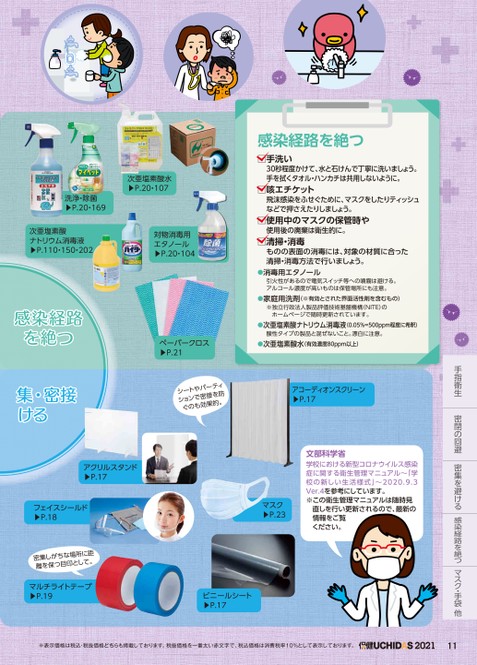 手指衛生密閉の回避密集を避ける避感染経路を絶つをマスク・手袋他ス文部科学省学校における新型コロナウイルス感染症に関する衛生管理マニュアル〜「学校の新しい生活様式」〜2020.9.3Ver.4を参考にしています。※この衛生管理マニュアルは随時見直しを行い更新されるので、最新の情報をご覧ください。マスク▶P.23アクリルスタンド▶P.17フェイスシールド▶P.18密集しがちな場所に距離を保つ目印として。マルチライトテープ▶P.19ビニールシート▶P.17※表示価格は税込・税抜価格どちらも掲載しております。税抜価格を一番太い赤文字で、税込価格は消費税率10%として表示しております。202111洗浄・除菌▶P.20・169次亜塩素酸ナトリウム消毒液▶P.110・150・202次亜塩素酸水▶P.20・107対物消毒用エタノール▶P.20・104感染経路を絶つ30秒程度かけて、水と石けんで丁寧に洗いましょう。手を拭くタオル・ハンカチは共用しないように。飛沫感染をふせぐために、マスクをしたりティッシュなどで押さえたりしましょう。使用後の廃棄は衛生的に。□手洗い□咳エチケット□使用中のマスクの保管時や□清掃・消毒●消毒用エタノール●家庭用洗剤(※有効とされた界面活性剤を含むもの)ものの表面の消毒には、対象の材質に合った清掃・消毒方法で行いましょう。引火性があるので電気スイッチ等への噴霧は避ける。アルコール濃度が高いものは保管場所にも注意。感染経路を絶つ集・密接ける※独立行政法人製品評価技術基盤機構(NITE)のホームページで随時更新されています。ペーパークロス▶P.21シートやパーティションで密接を防ぐのも効果的。●次亜塩素酸ナトリウム消毒液(0.05%=500ppm程度に希釈)●次亜塩素酸水(有効濃度80ppm以上)酸性タイプの製品と混ぜないこと。漂白に注意。アコーディオンスクリーン▶P.17