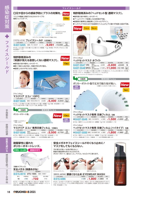 フェイスシールド口元や目からの感染予防にプラスの対策を。マスクや眼鏡に装着できる2WAYタイプの簡易フェイスガード。100枚入メガネのテンプル(つる)を通す穴マスクのゴムひもを通す切り込み※テンプル(つる)の幅が10mmまでの製品に対応。特許取得済みの「ヘッドセット型透明マスク」。●着用者の息や唾をしっかりガード。●アームワイヤーで装着したまま飲食が可能。●装着時の審美性と機能美にこだわったデザイン。●ヘッドバンドで支えるので会話時のフィルムが上下に動かず快適に会話が可能。1セット5セット[マグエックス]フェイスシールド100枚入お申込番号8-637-5225商品種別型式/FC-100-KTM価税抜オープン税抜価格¥9,091税込価格¥10,000単位1袋(100枚入)●寸法/232(縦)×300(横)×0.2(厚)mm●質量/12g●材質/PPポリプロピレン)製●包装数:1/10※フェイスシールド本体のみでは装着できません。マスクもしくはメガネを別途ご用意ください。特許取得済みの「笑顔が見える息苦しくない透明マスク」。●着用者の息や唾をしっかりガード。●軽くて着け心地が良く、笑顔が見え声が通る。●破損によるけがをさせない設計。10個入[ウィンカム]ヘッドセットマスクホワイトお申込番号8-637-55471PC8-637-55485PCS商品種別型式/W-HSM-1W型式/W-HSM-5WM価税抜¥2,400税抜価格税込価格¥2,400¥2,640¥11,000¥11,000¥12,100単位1個1セット(5個入)●寸法/パッケージ(1個)140(幅)×50(奥)×170(高)mm、フィルム:65(高)mm●材質/ポリカーボネート●包装数:1/56(1PC)、1/16(5PCS)※本体はフリーサイズでメーカーの公式なサイズではありません。交換用専用交換フィルムポリカーボネイト製で丈夫で耐久性が高い。抗菌・防曇加工※保護フィルムをはがしてお使いください。5枚入税込価格単位[ウィンカム]マスクリアエコノ10PCお申込番号商品種別8-637-5545¥5,940●寸法/130(幅)×50(奥)×90(高)mm(1個)●質量/6g1個)●包装数:1/30〈セット内容〉本体×10個、クロス×10枚、携帯袋×10枚型式/M-ECONO-10¥5,4001セット(10個入)M価税抜¥5,400税抜価格交換用専用交換フィルムポリカーボネート製。※保護フィルムをはがしてお使いください。10枚入抗菌・防曇加工[ウィンカム]❶❷ヘッドセットマスク専用交換フィルム5枚お申込番号商品種別税抜価格8-637-5549●●寸法/透明フィルム:65(高)mm●質量/3g1枚)●包装数:1/30型式/W-HSMF-5¥1,500M価税抜¥1,500税込価格¥1,650単位1袋(5枚入)[ウィンカム]マスクリアエコノ専用交換フィルム10枚入[ウィンカム]ヘッドセットマスク専用交換フィルム(ハイタイプ)5枚お申込番号8-637-5546商品種別型式/M-ECONOFILM-10M価税抜¥2,500税抜価格¥2,500税込価格¥2,750単位1袋(10枚入)●寸法/透明フィルム:65(高)mm●質量/0.5g(1枚)●包装数:1/30※アルコール除菌は避けてください。交換目安/1〜3カ月(使用環境・頻度による)お申込番号商品種別税抜価格8-637-5550●●寸法/透明フィルム:95(高)mm●質量/3.2g1枚)●包装数:1/30※アルコール除菌は避けてください。交換目安/1〜3カ月(使用環境・頻度による)型式/W-HSMF-5HI¥1,800M価税抜¥1,800税込価格¥1,980単位1袋(5枚入)耐衝撃性に優れたポリカーボネートレンズ。中学生〜大人向き眼鏡併用可安全メガネやフェイスシールドのくもり止めに!マスクをしてもくもらない。汚れ落ちが良い!水垢が残らない!除菌・抗菌効果もあるくもりどめです。ポリカーボネート、塩化ビニル、アクリル、セルロイドに使えます。[理研オプテック]安全メガネ(保護めがね)お申込番号8-615-4019商品種別UTS-100C型式/S4867①シュッとやって。②指でならして。③布でふきとる。[BROSJAPAN]眼鏡くもり止めEYEWEARWASH単位1個M価税抜¥760税抜価格¥722税込価格¥794お申込番号8-615-4285M価税抜¥1,980税抜価格¥1,800税込価格¥1,980単位1本●寸法/159幅)×162(奥)×61(高)mm●材質/ポリカーボネート●質量/44g●眼鏡との併用可●両面ハードコート●紫外線カット率99.99%●包装数:1●寸法/35(径)×130(高)mm●内容量/50mL●成分/非イオン界面活性剤(ポリオキシエチレンアルキルエーテルと同等の界面活性剤1.14%)造膜材、抗菌剤、安定化剤●液性/中性●包装数:1/50感染症対策フェイスシールド手指衛生密閉の回避密集を避ける感染経路を絶つマスク・手袋他マ手袋182021