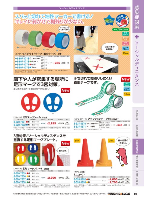 感染症対策ソーシャルディスタンス手指衛生密閉の回避密集を避ける感染経路を絶つマスク・手袋他マ手袋ソーシャルディスタンススパッと切れて油性マーカーで書ける!キレイに剥がせて糊残りが少ない。テープの上から字も書けて便利!テープ厚0.13mm手で切れる重ね貼り可能字が書けるテープ幅50mm25m巻手で切れるテープ幅50mm10m巻●ナチュラル●グリーン●レッド●ブルー[ウチダ]マルチライトテープ(養生テープ)1巻3密対策の必需品!●寸法/50(幅)mm×25m●テープ厚/0.13mm●質量/178g●材質/基材:PET、粘着剤:アクリル系●包装数:1/30廊下や人が密集する場所に足形マークで3密対策。エンボスラミネート加工ですべりにくい!手で切れて糊残りしにくい養生テープです。M価税抜税抜価格税込価格単位オープン¥235¥2581巻型式/UMLT01N型式/UMLT01G型式/UMLT01R型式/UMLT01B8-607-1716●ナチュラル8-607-1718●グリーン8-607-1774●レッド8-607-1776●ブルー●●❸❹お申込番号商品種別赤青[アカバネ]足形マークシール5枚組お申込番号8-620-7831●赤8-620-7832●青商品種別M価税抜税抜価格税込価格単位型式/I-030型式/I-032¥2,700¥2,295¥2,5241組(5枚入)●寸法/150(幅)×150(奥)×1(高)mm●直径150mm●質量:約40g(5枚)●材質/塩化ビニール(エンボスラミネート加工)●包装数:1[リンレイテープ]アテンションテープ#625ATお申込番号商品種別8-637-5570こちらでお待ちください印刷ピッチ/340mm、8-637-5571マスク着用ラベル使用/約27枚印刷ピッチ/204mm、ラベル使用/約47枚●寸法/50幅)mm×10m●包装数:1/30M価税抜税抜価格税込価格単位オープン¥546¥6001巻3密対策!ソーシャルディスタンスを意識する足形マークプレート。5本入3本入並ぶ位置の目安に。置くだけ![アカバネ]足形マークプレート5枚組赤黄お申込番号8-620-78358-620-78368-620-78378-620-7838●赤●⿈●青●緑商品種別M価税抜税抜価格税込価格単位型式/I-034型式/I-036型式/I-035型式/I-037¥3,300¥2,800¥3,0801組(5枚入)[キタムラ産業]ミニコーンお申込番号8-620-3852●赤8-620-3853●黄商品種別M価税抜オープン税抜価格税込価格¥4,000¥4,400¥2,700¥2,970単位1組(5本入)1組(3本入)●寸法/250(幅)×250(奥)×2高)mm●直径/250mm●質量/約130g1枚)●材質/ABS樹脂(すべり止め付き)●包装数:1※足形は使用している間に色が薄くなることがあります。●寸法/275幅)×275奥)×440高)mm●質量/1000g●材質/ポリエチレン●包装数:1/20※表示価格は税込・税抜価格どちらも掲載しております。税抜価格を一番太い赤文字で、税込価格は消費税率10%として表示しております。202119