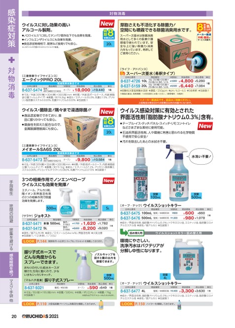 対物消毒ウイルスに対し効果の高いアルコール製剤。●ノロウイルス※に対してタンパク質存在下でも効果を発揮。●インフルエンザウイルスにも効果を発揮。●食品添加物規格で、厨房など食周りでも安心。※ノロウイルス代替のネコカリシウイルスで検査。20L芽胞さえも不活化する除菌力!空間にも噴霧できる除菌消臭用水です。スーパー次亜水は除菌消臭用水として多くの医療介護現場で使われています。安全な上に強い除菌力・消臭力をもっています。希釈してご使用ください。沖縄・離島はサービス対象外[三菱商事ライフサイエンス]エークイックPRO20L軽減税率対象品お申込番号8-637-5474商品種別型式/4973480131402M価税抜オープン税抜価格¥18,000税込価格¥19,440単位1箱●寸法/外装:309(横)×304(奥)×300高)mm●材質/外装:段ボールケース、内装:樹脂袋(2重フィルムタイプ)●質量/約19.2kg●成分/エタノール55.0%、乳酸2.13%、グリセリン脂肪酸エステル0.020%、乳酸ナトリウム0.020%●包装数:1ウイルス・菌除去!隅々まで浸透除菌!!●食品添加物でできており、食品に振りかかっても安心。●腐食性を抑えた配合なので、金属製調理器具にも安心。[ライフ・アドバンス]スーパー次亜水(希釈タイプ)お申込番号8-637-47268-637-515910L20L商品種別寸法/250(幅)×250(奥)×250(高)mm、型式/SJ10L寸法/300(幅)×305(奥)×295(高)mm、型式/SJ20LM価税抜¥4,900¥6,500税抜価格税込価格¥4,800¥5,280¥6,440¥7,084単位1個●弱酸性次亜塩素酸水溶液●濃度/250ppm●pH/6.0〜6.5●5倍希釈●包装数:1※製造元直送、使用期限/1カ月を目安にお使いください。(保管場所/冷暗所)※メーカー直送品です。返品はご容赦ください。上記商品は受注日から8営業日以内のお届けになります。ウイルス感染対策に有効とされた界面活性剤「脂肪酸ナトリウム0.3%」含有。20L●テーブル・イス・タッチパネル・スイッチ・リモコン・トイレなどさまざまな素材に使用可能。●石油系界面活性剤、人や環境に有害と思われる化学物質不使用で安心安全!●汚れを除去したあとの水拭き不要。[三菱商事ライフサイエンス]メイオールSA6520L軽減税率対象品お申込番号8-637-5473商品種別型式/4973480104215M価税抜オープン税抜価格¥9,800税込価格¥10,584単位1箱●寸法/外装:309(横)×304奥)×300(高)mm●材質/外装:段ボールケース、内装:樹脂袋(2重フィルムタイプ)●質量/約19.1kg●成分/エタノール57.2%、グリセリン脂肪酸エステル0.06%、グリコノデルタラクトン0.060%、乳酸ナトリウム0.010%●包装数:13つの相乗作用でノンエンベロープウイルスにも効果を発揮!エタノール、アルカリ剤、陽イオン系界面活性剤の3つの相乗作用で除菌効果を発揮します。500mL5L[サラヤ]ジョキストお申込番号8-637-54718-637-5472商品種別本体500mL5L型式/51663型式/51666M価税抜¥1,700¥8,600税抜価格¥1,620¥8,200税込価格単位¥1,782¥9,0201本●液性/弱アルカリ性●成分/エタノール(54w/w%)、界面活性剤●火気注意●包装数:1/12(本体)、1/3(5L)LOOKP.144業務用ボトル注ぎ口カップ&ノズルセットを掲載しております。振り子式ホースでどんな角度からもスプレーできます。おもりの付いた給水ホースが傾けた方向に動くので、少ない水もシッカリキャッチ。[マルハチ産業]振り子式スプレーお申込番号8-637-9321商品種別型式/#50(B)M価税抜オープンノズルキャップを回すと霧の出方を調整できます。容量500mL税抜価格税込価格¥590¥649単位1個●寸法/95径)×195高)mm●容量/500mL●材質/ポリエチレン●質量/76g●包装数:1※80%以下のアルコールも入れられます。水洗い不要!容量100mL容量500mL[オーブ・テック]ウイルスショットキラーお申込番号8-637-54758-637-5476商品種別M価税抜100mL500mL型式/4480034¥800型式/4480035¥1,300税抜価格税込価格¥600¥660¥980¥1,078単位1本●成分/界面活性剤、脂肪酸ナトリウム(0.3%)、トウモロコシ油、ココナッツ油、脂肪酸ココメチルエステル他●液性/弱アルカリ●包装数:1詰め替え用ウイルスショットキラー詰め替え用環境にやさしい。洗浄汚水はバクテリアが分解し中性になります。[オーブ・テック]ウイルスショットキラー容量4Lお申込番号8-637-54774L商品種別型式/4480036M価税抜税抜価格税込価格¥4,400¥3,300¥3,630単位1本●成分/界面活性剤、脂肪酸ナトリウム(0.3%)、トウモロコシ油、ココナッツ油、脂肪酸ココメチルエステル他●液性/弱アルカリ●包装数:1LOOKP.110次亜塩素酸ナトリウム消毒液を掲載しております。LOOKP.150ハイターを掲載しております。感染症対策対物消毒手指衛生密閉の回避密集を避ける感染経路を絶つマスク・手袋他マ手袋202021