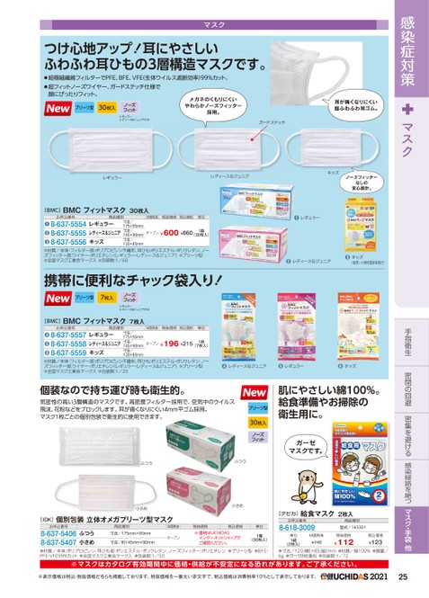 感染症対策マスク手指衛生密閉の回避密集を避ける感染経路を絶つマスク・手袋他マスクつけ心地アップ!耳にやさしいふわふわ耳ひもの3層構造マスクです。●超極細繊維フィルターでPFE、BFE、VFE生体ウイルス遮断効率)99%カット。●超フィットノーズワイヤー、ガードステッチ仕様で顔にぴったりフィット。プリーツ型30枚入ノーズフィットレギュラーレディース&ジュニアのみメガネのくもりにくいやわらかノーズフィッター採用。ガードステッチ耳が痛くなりにくい超ふわふわ耳ゴム。キッズノーズフィッターなしの安心設計。●レギュラー●レディース&ジュニア●キッズ(幼児・小学校低学年向け)レギュラーレディース&ジュニア[BMC]BMCフィットマスク30枚入●材質/本体・フィルター部:ポリプロピレン不繊布、耳ひも:ポリエステル・ポリウレタン、ノーズフィッター部:ワイヤー・ポリエチレン(レギュラー・レディース&ジュニア)●プリーツ型●全国マスク工業会マーク入●包装数:1/60携帯に便利なチャック袋入り!プリーツ型7枚入ノーズフィットレギュラーレディース&ジュニアのみ[BMC]BMCフィットマスク7枚入M価税抜税抜価格税込価格単位オープン¥196¥2151袋(7枚入)寸法/175×95mm寸法/145×90mm寸法/120×85mm8-637-5557レギュラー8-637-55588-637-5559キッズレディース&ジュニア●●●お申込番号商品種別M価税抜税抜価格税込価格単位オープン¥600¥6601箱(30枚入)寸法/175×95mm寸法/145×90mm寸法/120×85mm8-637-5554レギュラー8-637-55558-637-5556キッズレディース&ジュニア●●●お申込番号商品種別●材質/本体・フィルター部:ポリプロピレン不繊布、耳ひも:ポリエステル・ポリウレタン、ノーズフィッター部:ワイヤー・ポリエチレン(レギュラー・レディース&ジュニア)●プリーツ型●全国マスク工業会マーク入●包装数:1/25●レディース&ジュニア●レギュラー●キッズ個装なので持ち運び時も衛生的。気密性の高い3層構造のマスクです。高密度フィルター採用で、空気中のウイルス飛沫、花粉などをブロックします。耳が痛くなりにくい4mm平ゴム採用。マスク1枚ごとの個別包装で衛生的に使用できます。ふつう小さめふつう小さめ[IDK]個別包装立体オメガプリーツ型マスクお申込番号8-637-54068-637-5407ふつう小さめ商品種別寸法/175mm×90mm寸法/約145mm×90mmM価税抜オープン税抜価格※価格はUCHIDAS税込価格インターネットショップでご確認ください。肌にやさしい綿100%。給食準備やお掃除の衛生用に。ガーゼマスクです。プリーツ型30枚入ノーズフィット[デビカ]給食マスク2枚入お申込番号8-618-3009商品種別型式/143301単位1組(2枚入)M価税抜¥140税抜価格¥112税込価格¥123単位1箱(30枚入)●材質/本体:ポリプロピレン、耳ひも部:ポリエステル・ポリウレタン、ノーズフィッター:ポリエチレン●プリーツ型●BFE・PFE・VFE99%カット●全国マスク工業会マーク入●包装数:1/50●寸法/120(横)×85(縦)mm●材質/綿100%●質量/6g●ガーゼ8枚重ね●包装数:1/72※マスクはカタログ有効期間中に価格・供給が不安定になる恐れがあります。ご了承ください。※表示価格は税込・税抜価格どちらも掲載しております。税抜価格を一番太い赤文字で、税込価格は消費税率10%として表示しております。202125