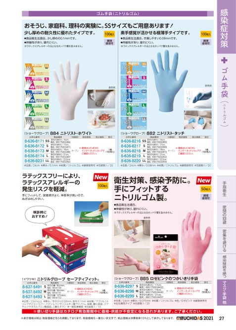 感染症対策ゴム手袋(ニトリルゴム)手指衛生密閉の回避密集を避ける感染経路を絶つマスク・手袋他[イワツキ]ニトリルグローブセーフティフィット®商品種別M価税抜税抜価格税込価格単位お申込番号8-637-54918-637-54928-637-5493手のひら幅/86±4mm、型式/004-41720SM手のひら幅/98±4mm、L型式/004-41721手のひら幅/107±4mm、型式/004-41722オープン※価格はUCHIDASインターネットショップでご確認ください。1箱(100枚入)●全長/23cm以上●厚み/手のひら:0.08mm、指先:0.1mm●材質/アクリルニトリルブダジエンラバー、ドデシルベンゼンスルホン酸ナトリウム、硫黄、酸化亜鉛、ジブチルジチオカルバミン酸亜鉛、二酸化チタン●一般医療機器●包装数:1/10[ショーワグローブ]885ロゼピンクのつかいきり手袋お申込番号8-636-82978-636-82988-636-8299商品種別手のひらまわり/17cm、型式/4901792024433SM手のひらまわり/19cm、L型式/4901792024440手のひらまわり/21cm、型式/4901792024457M価税抜税抜価格税込価格単位オープン※価格はUCHIDASインターネットショップでご確認ください。1箱(50枚入)●全長/24cm●厚み/0.075mm●材質/ニトリルゴム●色/ロゼピンク●調理使用可●左右兼用タイプ●包装数:1/20※使い切り手袋はカタログ有効期間中に価格・供給が不安定になる恐れがあります。ご了承ください。※表示価格は税込・税抜価格どちらも掲載しております。税抜価格を一番太い赤文字で、税込価格は消費税率10%として表示しております。202127ゴム手袋(ニトリルゴム)おそうじ、家庭科、理科の実験に。SSサイズもご用意あります!少し厚めの耐久性に優れたタイプです。素手感覚が活かせる極薄手タイプです。●食品衛生法適合。少し厚めの0.1mmです。●伸縮性があり、破れにくい。※ラテックスアレルギーの元となるタンパク質を含みません。●食品衛生法適合。作業しやすい0.08mmです。●伸縮性があり、破れにくい。※ラテックスアレルギーの元となるタンパク質を含みません。100枚入調理使用可使用例100枚入調理使用可使用例[ショーワグローブ]884ニトリスト・ホワイト[ショーワグローブ]882ニトリスト・タッチM価税抜税抜価格税込価格単位商品種別M価税抜税抜価格税込価格単位お申込番号8-636-81718-636-81728-636-81738-636-81748-636-8231SSSMLLL商品種別手のひらまわり/16cm、型式/4901792022866手のひらまわり/17cm、型式/4901792022873手のひらまわり/19cm、型式/4901792022880手のひらまわり/21cm、型式/4901792022897手のひらまわり/22.5cm、型式/4901792022903オープン※価格はUCHIDASインターネットショップでご確認ください。1箱(100枚入)オープン※価格はUCHIDASインターネットショップでご確認ください。1箱(100枚入)お申込番号8-636-82168-636-82178-636-82188-636-82198-636-8220SS手のひらまわり/16cm、S型式/4901792020893手のひらまわり/17cm、型式/4901792020909手のひらまわり/19cm、型式/4901792020916手のひらまわり/21cm、型式/4901792020923手のひらまわり/22.5cm、型式/4901792020930MLLL●全長/24cm●厚み/0.1mm●材質/ニトリルゴム●調理使用可●包装数:1/20●全長/24cm●厚み/0.08mm●材質/ニトリルゴム●調理使用可●包装数:1/20ラテックスフリーにより、ラテックスアレルギーの発生リスクを軽減。手にフィットして、装着感がよく、伸長率が高いので、ぬぎはめしやすい。100枚入検診時におすすめ!衛生対策、感染予防に。手にフィットするニトリルゴム製。●食品衛生法適合。●伸縮性があり、破れにくい。※ラテックスアレルギーの元となるタンパク質を含みません。使用例50枚入調理使用可