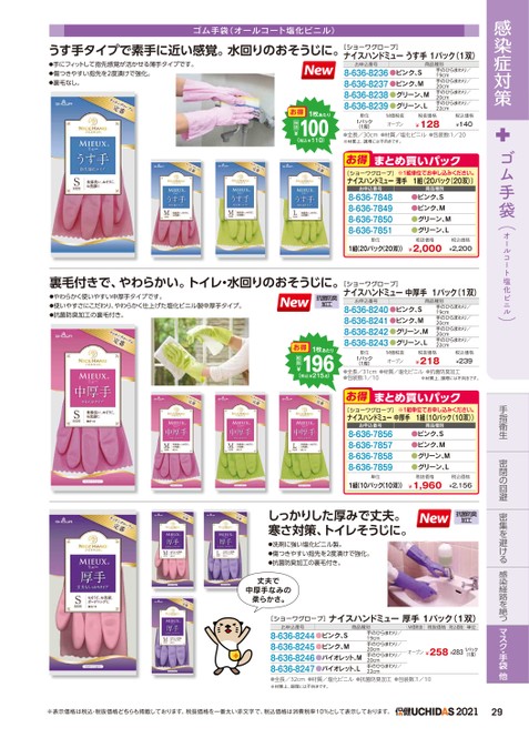 感染症対策ゴム手袋(オールコート塩化ビニル)手指衛生密閉の回避密集を避ける感染経路を絶つマスク・手袋他ゴム手袋(オールコート塩化ビニル)[ショーワグローブ]ナイスハンドミューうす手1パック(1双)お申込番号商品種別8-636-8236●ピンク、S8-636-8237●ピンク、M8-636-8238●グリーン、M8-636-8239●グリーン、L手のひらまわり/19cm手のひらまわり/20cm手のひらまわり/20cm手のひらまわり/22cm単位1パック(1双)M価税抜オープン税抜価格¥128税込価格¥140●全長/30cm●材質/塩化ビニル●包装数:1/20※材質上、調理には不向きです。お得まとめ買いパック[ショーワグローブ]※1組単位申込。ナイスハンドミュー薄手1組(20パック(20双))お申込番号8-636-78488-636-78498-636-78508-636-7851商品種別●ピンク、S●ピンク、M●グリーン、M●グリーン、L単位税抜価格1組(20パック(20双))¥2,000税込価格¥2,200うす手タイプで素手に近い感覚。水回りのおそうじに。1枚あたり100税抜¥お得(税込¥110)●手にフィットして指先感覚が活かせる薄手タイプです。●傷つきやすい指先を2度漬けで強化。●裏毛なし。税込価格¥2,156抗菌防臭加工単位税抜価格1組(10パック(10双))¥1,960しっかりした厚みで丈夫。寒さ対策、トイレそうじに。●洗剤に強い塩化ビニル製。●傷つきやすい指先を2度漬けで強化。●抗菌防臭加工の裏毛付き。丈夫で中厚手なみの柔らかさ。[ショーワグローブ]ナイスハンドミュー厚手1パック(1双)お申込番号商品種別8-636-8244●ピンク、S8-636-8245●ピンク、M8-636-8246●バイオレット、M8-636-8247●バイオレット、L手のひらまわり/19cm手のひらまわり/20cm手のひらまわり/20cm手のひらまわり/22cmM価税抜税抜価格税込価格単位オープン¥258¥2831パック(1双)●全長/32cm●材質/塩化ビニル●抗菌防臭加工●包装数:1/10※材質上、調理には不向きです。[ショーワグローブ]ナイスハンドミュー中厚手1パック(1双)お申込番号商品種別8-636-8240●ピンク、S8-636-8241●ピンク、M8-636-8242●グリーン、M8-636-8243●グリーン、L手のひらまわり/19cm手のひらまわり/20cm手のひらまわり/20cm手のひらまわり/22cm単位1パック(1双)M価税抜オープン税抜価格¥218税込価格¥239●全長/31cm●材質/塩化ビニル●抗菌防臭加工●包装数:1/10※材質上、調理には不向きです。お得まとめ買いパック[ショーワグローブ]※1組単位申込。ナイスハンドミュー中厚手1組(10パック(10双))お申込番号8-636-78568-636-78578-636-78588-636-7859商品種別●ピンク、S●ピンク、M●グリーン、M●グリーン、L裏毛付きで、やわらかい。トイレ・水回りのおそうじに。1枚あたり196税抜¥お得(税込¥215.6)●やわらかく使いやすい中厚手タイプです。●使いやすさにこだわり、やわらかく仕上げた塩化ビニル製中厚手タイプ。●抗菌防臭加工の裏毛付き。抗菌防臭加工※表示価格は税込・税抜価格どちらも掲載しております。税抜価格を一番太い赤文字で、税込価格は消費税率10%として表示しております。202129