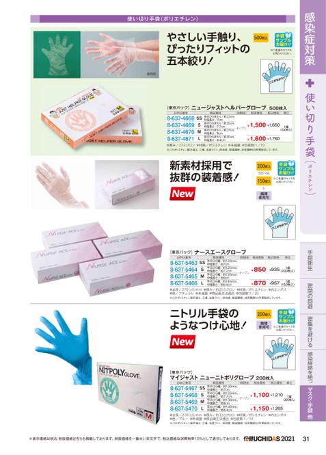 感染症対策使い切り手袋(ポリエチレン)手指衛生密閉の回避密集を避ける感染経路を絶つマスク・手袋他使い切り手袋(ポリエチレン)やさしい手触り、ぴったりフィットの五本絞り!500枚入※ご希望のサイズをお知らせください。使用例[東京パック]ニュージャストヘルパーグローブ500枚入お申込番号8-637-46688-637-46698-637-46708-637-4671SSSML商品種別手のひらまわり/約23cm、中指長さ/7cm手のひらまわり/約25cm、中指長さ/7.7cm手のひらまわり/約27cm、中指長さ/8cm手のひらまわり/約30cm、中指長さ/8.4cmM価税抜税抜価格税込価格単位オープン¥1,500¥1,6501箱(500枚入)¥1,600¥1,760●厚み/27ミクロン●材質/ポリエチレン●未滅菌●包装数:1/10※このポリエチレン製手袋は、工場、生産ライン、担当者、製造履歴、出荷履歴を3年間保存しています。新素材採用で抜群の装着感!200枚入SS〜M150枚入※ご希望のサイズをお知らせください。L調理使用可[東京パック]ナースエースグローブお申込番号8-637-54638-637-54648-637-54658-637-5466商品種別手のひら幅/約120mm、中指長さ/約7cm手のひら幅/約125mm、中指長さ/約7.7cm手のひら幅/約130mm、中指長さ/約8cm手のひら幅/約145mm、中指長さ/約8.4cmSSSMLM価税抜税抜価格税込価格単位オープン¥850¥870¥9351箱(200枚入)¥9571箱(150枚入)●全長/270(±5)mm●厚み/約25ミクロン●材質/ポリエチレン●内エンボス●色/ナチュラル●未滅菌●食品衛生法適合●包装数:1/20※このポリエチレン製手袋は、工場、生産ライン、担当者、製造履歴、出荷履歴を3年間保存しています。ニトリル手袋のようなつけ心地!200枚入調理使用可※ご希望のサイズをお知らせください。[東京パック]マイジャストニューニトポリグローブ200枚入M価税抜税抜価格税込価格単位お申込番号8-637-54678-637-54688-637-54698-637-5470SSSML商品種別手のひら幅/約120mm、中指長さ/約7cm手のひら幅/約125mm、中指長さ/約7.7cm手のひら幅/約130mm、中指長さ/約8cm手のひら幅/約145mm、中指長さ/約8.4cmオープン¥1,100¥1,2101箱(200枚入)¥1,150¥1,265●全長/270(±5)mm●厚み/約33ミクロン●材質/ポリエチレン●内エンボス●色/ブルー●未滅菌●食品衛生法適合●包装数:1/10※このポリエチレン製手袋は、工場、生産ライン、担当者、製造履歴、出荷履歴を3年間保存しています。※表示価格は税込・税抜価格どちらも掲載しております。税抜価格を一番太い赤文字で、税込価格は消費税率10%として表示しております。202131