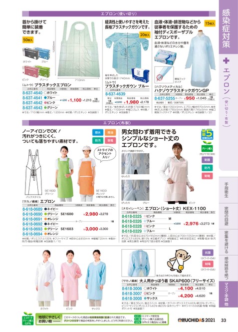 感染症対策エプロン(使い切り・布製)手指衛生密閉の回避密集を避ける感染経路を絶つマスク・手袋他グリーン購入(再生PET部分使用)制菌防汚制電15枚入血液・体液・排泄物などから従事者を保護するための袖付ディスポーザブルエプロンです。血液・体液などの水分や菌を通さないポリエチレン製。親指フックタイプ[ハクゾウメディカル]ハクゾウプラスチックガウンGPお申込番号M価税抜税抜価格税込価格8-637-5255オープン¥950¥1,045単位1箱(15枚入)商品種別型式/3087595●寸法/着丈:1050±5mm、エプロン幅:約970±5mm、袖を伸ばした状態:1790±5mm、親指穴間:1745±5mm●袖口親指フックタイプ●材質/ポリエチレン●包装数:1/20エプロン(使い切り)経済性と使いやすさを考えた長袖プラスチックガウンです。20枚入1100mm袖を伸ばした状態での長さ1740mm[ムトウ]プラスチックガウンブルーお申込番号8-637-4639単位1箱M価税抜税抜価格税込価格¥1,980¥2,178(20枚入)¥2,200●寸法/袖を伸ばした状態:1740(幅)mm●着丈/1100mm●袖口ゴム入●材質/ポリエチレン●包装数:1ピンクグリーン710mm[ムトウ]プラスチックエプロン1200mm首から掛けて簡単に装着できます。50枚入ホワイトブルーお申込番号8-637-46408-637-46418-637-46428-637-4643商品種別M価税抜税抜価格税込価格単位●ホワイト●ブルー●ピンク●グリーン¥1,200¥1,100¥1,2101箱(50枚入)●寸法/710(幅)mm●着丈/1200mm●材質/ポリエチレン●包装数:1ノーアイロンでOK!汚れがつきにくく、ついても落ちやすい素材です。エプロン(布製)男女問わず着用できるシンプルなショート丈のエプロンです。ボタンで調節できます。撥水防汚撥油制電ストライプのアクセント入り!ゆったりSE1603オレンジ※帽子は付属しません。SE1600グリーンバックスタイル[サカノ繊維]エプロンお申込番号8-618-06898-618-06908-618-06918-618-06928-618-06938-618-0694●ネイビー●グリーンSE1600●オレンジ●ネイビー●グリーンSE1603●オレンジ商品種別M価税抜税抜価格税込価格単位ぴったりブルーピンク[ナガイレーベン]エプロン〈ショート丈〉KEX-1100¥2,980¥3,278オープン1着¥3,000¥3,300お申込番号8-618-03258-618-03268-618-03288-618-0329商品種別M価税抜税抜価格税込価格単位●ピンク●ブルー●ピンク●ブルーML¥3,200¥2,976¥3,2731着●材質/ポリエステル100%●フリーサイズ●前中心丈850mm●裾幅720mm●撥水・防汚・撥油・制電効果●包装数:1/10ホワイトピンクサックス●寸法/M:前中心丈670×950mm(腰囲)、L:前中心丈700×1050mm(腰囲)●材質/ポリエステル85%、綿15%●交織ポプリン●制菌加工●形状安定加工●制電・吸水・防汚効果●男女兼用●再生PET部分使用●包装数:1抗菌(ホワイトのみ)制電(ホワイトのみ)後ろは2カ所ひもを結んで留めます。[サカノ繊維]大人用かっぽう着SKAP600(フリーサイズ)お申込番号8-618-30068-618-30078-618-3008商品種別M価税抜●ホワイト●ピンク●サックスオープン税抜価格¥4,100税込価格¥4,510¥4,200¥4,620単位1着●寸法/着丈:95cm、袖丈:51cm●材質/ホワイト:ポリエステル65%・綿35%・タッサー、ピンク・サックス:ポリエステル65%・綿35%・双糸ウェザー●ホワイトのみ抗菌・制電●両脇ポケット付●包装数:1エコマークグリーン購入GPN地球にやさしくお買い物このマークのついた商品は地球環境保護に配慮された商品です。グリーンの文字で商品の判別をしやすくしました。どうぞご利用ください。エコマークグリーン購入GPNエコマーク認定品グリーン購入法適合品GPNエコ商品ねっと掲載202133