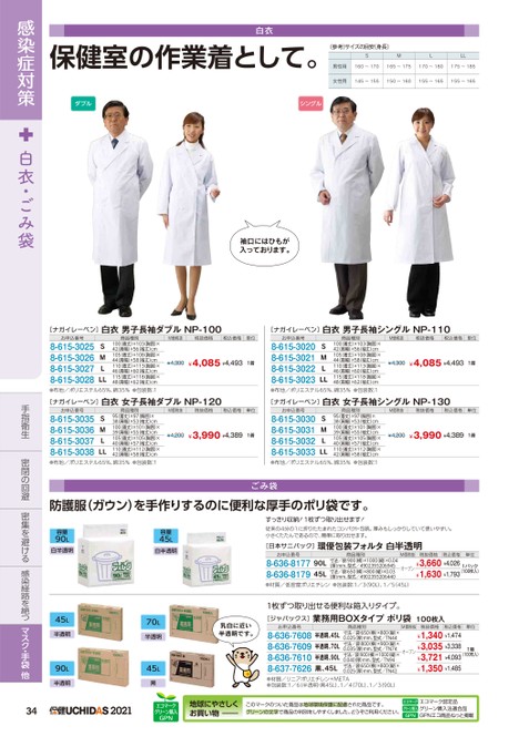 保健室の作業着として。白衣(参考)サイズの目安(身長)SMLLL男性用160〜170165〜175170〜180175〜185女性用145〜155150〜160155〜165155〜165ダブルシングル袖口にはひもが入っております。[ナガイレーベン]白衣男子長袖ダブルNP-100[ナガイレーベン]白衣男子長袖シングルNP-110お申込番号商品種別SM8-615-30258-615-30268-615-30278-615-3028100着丈)×103(胸囲)×42肩幅)×56袖丈)cm105着丈)×108(胸囲)×44肩幅)×58袖丈)cm110着丈)×113(胸囲)×46肩幅)×60袖丈)cm115着丈)×118(胸囲)×48肩幅)×62袖丈)cm●布地/ポリエステル65%、綿35%●包装数:1LLLM価税抜税抜価格税込価格単位¥4,300¥4,085¥4,4931着お申込番号商品種別SM8-615-30208-615-30218-615-30228-615-3023100(着丈)×103胸囲)×42(肩幅)×56(袖丈)cm105(着丈)×108胸囲)×44(肩幅)×58(袖丈)cm110(着丈)×113胸囲)×46(肩幅)×60(袖丈)cm115(着丈)×118胸囲)×48(肩幅)×62(袖丈)cm●布地/ポリエステル65%、綿35%●包装数:1LLLM価税抜税抜価格税込価格単位¥4,300¥4,085¥4,4931着[ナガイレーベン]白衣女子長袖ダブルNP-120[ナガイレーベン]白衣女子長袖シングルNP-130お申込番号商品種別SM8-615-30358-615-30368-615-30378-615-303895着丈)×97胸囲)×38肩幅)×53袖丈)cm100着丈)×101(胸囲)×39肩幅)×55袖丈)cm105着丈)×105(胸囲)×40肩幅)×57袖丈)cm110着丈)×112(胸囲)×42肩幅)×58袖丈)cm●布地/ポリエステル65%、綿35%●包装数:1LLLM価税抜税抜価格税込価格単位¥4,200¥3,990¥4,3891着お申込番号商品種別SM8-615-30308-615-30318-615-30328-615-303395(着丈)×97(胸囲)×38(肩幅)×53(袖丈)cm100(着丈)×101胸囲)×39(肩幅)×55(袖丈)cm105(着丈)×105胸囲)×40(肩幅)×57(袖丈)cm110(着丈)×112胸囲)×42(肩幅)×58(袖丈)cm●布地/ポリエステル65%、綿35%●包装数:1LLLM価税抜税抜価格税込価格単位¥4,200¥3,990¥4,3891着防護服(ガウン)を手作りするのに便利な厚手のポリ袋です。ごみ袋容量90L白半透明45L半透明90L半透明容量45L白半透明70L半透明45L黒乳白に近い半透明です。すっきり収納!1枚ずつ取り出せます!従来の4分の1に折りたたまれたコンパクト包装。厚みもしっかりしていて使いやすい。小さくたたんであるので、簡単に取り出せます。[日本サニパック]環優包装フォルタ白半透明お申込番号8-636-81778-636-817990L45L商品種別寸法/袋:900(横)×1000縦)×0.04(厚)mm、型式/4902393206945寸法/袋:650(横)×800(縦)×0.03(厚)mm、型式/4902393206440M価税抜オープン税抜価格税込価格¥3,660¥4,026¥1,630¥1,793単位1パック(100枚入)●材質/低密度ポリエチレン●包装数:1/3(90L)、1/5(45L)1枚ずつ取り出せる便利な箱入りタイプ。[ジャパックス]業務用BOXタイプポリ袋100枚入お申込番号8-636-76088-636-76098-636-76108-637-7626半透明、45L半透明、70L半透明、90L黒、45L商品種別寸法/袋:650(横)×800(縦)×0.025(厚)mm、型式/TN44寸法/袋:800(横)×900(縦)×0.035(厚)mm、型式/TN74寸法/袋:900横)×1000縦)×0.040厚)mm、型式/TN94寸法/袋:650(横)×800(縦)×0.025(厚)mm、型式/TN42M価税抜オープン●材質/リニアポリエチレン+META●包装数:1/6(半透明・黒45L)、1/470L)、1/3(90L)税抜価格税込価格単位¥1,340¥1,474¥3,035¥3,338¥3,721¥4,093¥1,350¥1,4851箱(100枚入)2021エコマークグリーン購入GPN地球にやさしくお買い物このマークのついた商品は地球環境保護に配慮された商品です。グリーンの文字で商品の判別をしやすくしました。どうぞご利用ください。エコマークグリーン購入GPNエコマーク認定品グリーン購入法適合品GPNエコ商品ねっと掲載感染症対策白衣・ごみ袋手指衛生密閉の回避密集を避ける感染経路を絶つマスク・手袋他34
