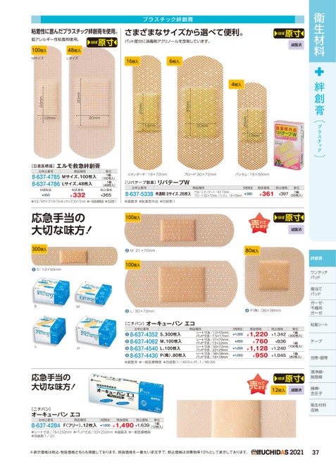 衛生材料絆創膏(プラスチック)絆創膏ワンタッチパッドパッド傷当てパッドガーゼ・ガーゼ・不織布不織布ガーゼガーゼ粘着シートテープープ包帯・眼帯清浄綿・脱脂綿脱脂綿綿棒・舌圧子衛生材料・舌圧子粘着性に富んだプラスチック絆創膏を使用。低アレルギー性粘着剤使用。100枚入Mサイズ48枚入Lサイズほぼ原寸プラスチック絆創膏さまざまなサイズから選べて便利。パット部分に消毒剤アクリノールを含有しています。ほぼ原寸滅菌済16枚入6枚入13mm20mm4枚入13mm20mm30mm20mm12mm20mm30mm24mm[日進医療器]エルモ救急絆創膏お申込番号商品種別8-637-4785Mサイズ、100枚入8-637-4786Lサイズ、48枚入単位1箱(100枚入)1箱(48枚入)税込価格¥365スタンダード:19×72mmブロード:30×72mmバンタム:19×55mm[リバテープ製薬]リバテープWお申込番号8-637-5338半透明3サイズ、26枚入寸法/スタンダード:19×72mm、ブロード:30×72mm、バンタム:19×55mm商品種別M価税抜¥380税抜価格¥361税込価格¥397単位1箱(26枚入)●滅菌済●医薬部外品●包装数:1100枚入●M:21×70mm100枚入ほぼ原寸滅菌済80枚入ほぼ原寸12枚入滅菌済商品種別シート寸法/12×55mm、パッド寸法/7.5×17mmシート寸法/21×70mm、パッド寸法/13×22mmシート寸法/30×72mm、パッド寸法/22×29mmシート寸法/38×38mm、パッド寸法/18×18mmM価税抜¥1,300¥800¥1,200¥1,000税抜価格¥1,220¥760¥1,128¥950税込価格¥1,342¥836¥1,240¥1,045単位1箱(300枚入)1箱(100枚入)1箱(80枚入)S、300枚入M、100枚入L、100枚入P(角)、80枚入お申込番号8-637-43528-637-40628-637-45408-637-4430●●●●●滅菌済●一般医療機器●包装数:1/40S・L・P)、1/80M)[ニチバン]オーキューバンエコ●L:30×72mm●P(角):38×38mmM価税抜¥350税抜価格¥332●寸法/Mサイズ:19×72mm、Lサイズ:30×72mm●一般医療機器●包装数:1応急手当の大切な味方!300枚入●S:12×55mmSLMP応急手当の大切な味方![ニチバン]オーキューバンエコお申込番号8-637-4284商品種別F(フリー)、12枚入M価税抜¥1,600税抜価格税込価格¥1,490¥1,639(12枚入)単位1箱●シート寸法/76×250mm●パッド寸法/30×250mm●滅菌済●一般医療機器●包装数:1/20※表示価格は税込・税抜価格どちらも掲載しております。税抜価格を一番太い赤文字で、税込価格は消費税率10%として表示しております。202137