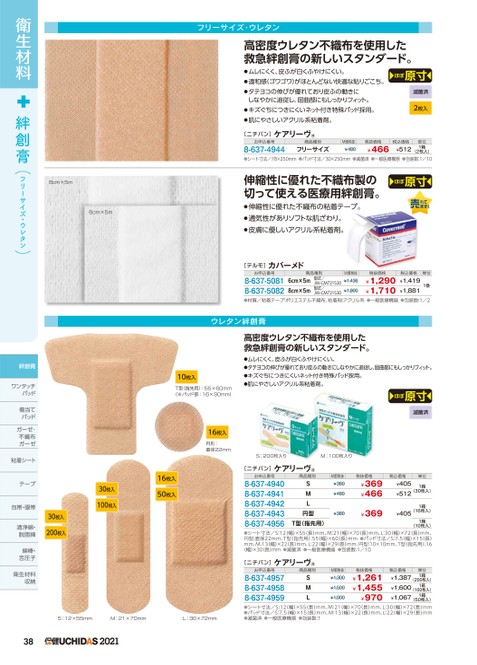 フリーサイズ・ウレタン高密度ウレタン不織布を使用した救急絆創膏の新しいスタンダード。●ムレにくく、皮ふが白くふやけにくい。●違和感(ゴワゴワ)がほとんどない快適な貼りごこち。●タテヨコの伸びが優れており皮ふの動きにしなやかに追従し、屈曲部にもしっかりフィット。●キズぐちにつきにくいネット付き特殊パッド採用。●肌にやさしいアクリル系粘着剤。[ニチバン]ケアリーヴ®ほぼ原寸滅菌済2枚入お申込番号8-637-4944商品種別フリーサイズM価税抜¥480税抜価格¥466税込価格¥512単位1箱(2枚入)●シート寸法/78×250mm●パッド寸法/30×250mm●滅菌済●一般医療機器●包装数:1/108cm×5m6cm×5m伸縮性に優れた不織布製の切って使える医療用絆創膏。●伸縮性に優れた不織布の粘着テープ。●通気性がありソフトな肌ざわり。●皮膚に優しいアクリル系粘着剤。ほぼ原寸[テルモ]カバーメドお申込番号8-637-50818-637-5082商品種別6cm×5m8cm×5m型式/JW-CM721520型式/JW-CM721530M価税抜¥1,436¥1,900税抜価格¥1,290¥1,710税込価格単位¥1,419¥1,8811巻●材質/粘着テープ:ポリエステル不織布、粘着剤:アクリル系●一般医療機器●包装数:1/2ウレタン絆創膏高密度ウレタン不織布を使用した救急絆創膏の新しいスタンダード。10枚入T型(指先用):55×60mm(※パッド部:16×30mm)●ムレにくく、皮ふが白くふやけにくい。●タテヨコの伸びが優れており皮ふの動きにしなやかに追従し、屈曲部にもしっかりフィット。●キズぐちにつきにくいネット付き特殊パッド採用。●肌にやさしいアクリル系粘着剤。ほぼ原寸16枚入円形:直径22mmS:200枚入りM:100枚入り[ニチバン]ケアリーヴ®滅菌済税込価格単位¥405¥5121箱(30枚入)1箱(16枚入)¥4051箱16枚入50枚入30枚入100枚入30枚入200枚入お申込番号8-637-49408-637-49418-637-49428-637-49438-637-4956M価税抜¥380¥480商品種別SML円型¥380税抜価格¥369¥466¥369T型(指先用)(10枚入)●シート寸法/S:12(幅)×55(長)mm、M:21(幅)×70(長)mm、L:30(幅)×72(長)mm、円型:直径22mm、T型(指先用):55(幅)×60(長)mm●パッド寸法/S:7.5(幅)×15(長)mm、M:13幅)×22(長)mm、L:22幅)×29(長)mm、円型:10×10mm、T型(指先用):16(幅)×30(長)mm●減菌済●一般医療機器●包装数:1/10[ニチバン]ケアリーヴ®お申込番号8-637-49578-637-49588-637-4959商品種別SMM価税抜¥1,300¥1,500L¥1,000税抜価格¥1,261¥1,455¥970税込価格¥1,387¥1,600¥1,067単位1箱1箱1箱(200枚入)(100枚入)(50枚入)●シート寸法/S:12(幅)×55(長)mm、M:21(幅)×70(長)mm、L:30(幅)×72(長)mm●パッド寸法/S:7.5幅)×15(長)mm、M:13(幅)×22(長)mm、L:22(幅)×29(長)mm●減菌済●一般医療機器●包装数:1S:12×55mmM:21×70mmL:30×72mm382021衛生材料絆創膏(フリーサイズ・ウレタン)絆創膏ワンタッチパッドパッド傷当てパッドガーゼ・ガーゼ・不織布不織布ガーゼガーゼ粘着シートテープ包帯・眼帯清浄綿・脱脂綿脱脂綿綿棒・舌圧子衛生材料綿棒・舌圧子