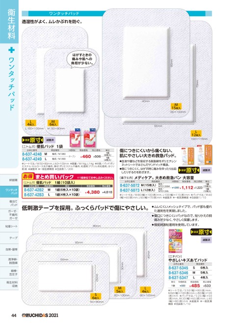 L12枚入100×115mm70mm65mmM15枚入80×100mm40mm65mm傷につきにくいから痛くない、肌にやさしい大きめ救急パッド。●血液や膿などを吸収する脱脂綿をポリエチレンネットシートではさんだサンドイッチ構造。●傷につきにくく、はがす時に痛みを伴ったり出血したりするのを防ぎます。ほぼ原寸滅菌済※1組単位申込。[森下仁丹]メディケア®大きめ救急バン大容量商品種別M価税抜税抜価格税込価格お申込番号8-637-50728-637-5073(15枚入)型式/ML(12枚入)MTO1200M型式/MTO1200L¥1,200¥1,112¥1,223(15枚入)単位1箱1箱(12枚入)●シート寸法/M:80幅)×100長)mm、L:100(幅)×115(長)mm●パッド寸法/M:40(幅)×65(長)mm、L65(幅)×70(長)mm●滅菌済●一般医療機器●包装数:1/10ワンタッチパッド透湿性がよく、ムレかぶれを防ぐ。はがすときの痛みや肌への負担が少ない。L4枚入M6枚入L:60×100mmM:50×80mmほぼ原寸滅菌済[ニトムズ]優肌パッド1袋お申込番号8-637-42488-637-4249ML商品種別M価税抜税抜価格税込価格型式/N1380型式/N1390オープン¥460¥506単位1袋(6枚入)1袋(4枚入)●シート寸法/M:50×80mm、L:60×100mm●質量/M:16g、L:14g●材質/パッド:ポリエステル・セルロース系不織布、基材:ポリエステル不織布、粘着剤:アクリル系粘着剤、はくり紙:紙●滅菌済●一般医療機器●包装数:1/200まとめ買いパックお得[ニトムズ]優肌パッド1組(10袋入)お申込番号8-637-42828-637-4283商品種別単位税抜価格税込価格ML1組(6枚入×10袋)1組(4枚入×10袋)¥4,380¥4,818●傷口につきにくいパッドなので、貼りかえの時痛みが少なく、やさしく保護します。●極低刺激粘着剤を使用しています。ほぼ原寸滅菌済[ニチバン]やさしいキズあてパッドお申込番号8-637-53458-637-53468-637-5347商品種別SML6枚入5枚入4枚入単位1袋M価税抜¥500税抜価格¥485税込価格¥533●シート寸法/S:50(幅)×80(長)mm、M:60(幅)×100(長)mm、L:80幅)×120(長)mm●パッド寸法/S:25(幅)×50(長)mm、M:30(幅)×65(長)mm、L:40(幅)×80(長)mm●滅菌済●一般医療機器●包装数:1/10M5枚入60×100mmS6枚入50×80mmL4枚入80×120mm40mm30mm80mm25mm65mm50mm低刺激テープを採用。ふっくらパッドで傷にやさしい。●ムレにくいメッシュタイプで、パッド部も優れた通気性を実現しました。衛生材料ワンタッチパッド絆創膏ワンタッチパッド傷当てパッドガーゼ・ガーゼ・不織布不織布ガーゼガーゼ粘着シートテープ包帯・眼帯清浄綿・脱脂綿脱脂綿綿棒・舌圧子衛生材料綿棒・舌圧子442021