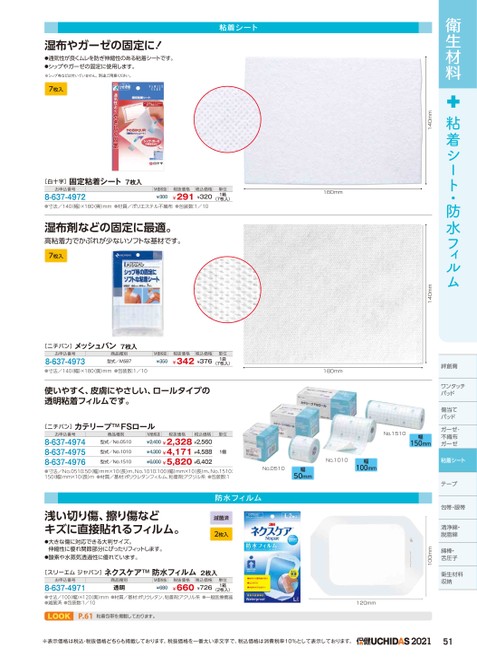 衛生材料粘着シート・防水フィルム絆創膏ワンタッチパッドパッド傷当てパッドガーゼ・ガーゼ・不織布不織布ガーゼガーゼ粘着シートテープープ包帯・眼帯清浄綿・脱脂綿脱脂綿綿棒・舌圧子衛生材料・舌圧子100mm120mm180mmNo.1510幅150mmNo.0510幅50mmNo.1010幅100mm●寸法/No.0510:50(幅)mm×10(長)m、No.1010:100幅)mm×10(長)m、No.1510:150(幅)mm×10長)m●材質/基材:ポリウレタンフィルム、粘着剤:アクリル系●包装数:1浅い切り傷、擦り傷などキズに直接貼れるフィルム。●大きな傷に対応できる大判サイズ。伸縮性に優れ関節部分にぴったりフィットします。●酸素や水蒸気透過性に優れています。防水フィルム滅菌済2枚入[スリーエムジャパン]ネクスケアTM防水フィルム2枚入お申込番号8-637-4971商品種別透明(2枚入)●寸法/100幅)×120(奥)mm●材質/基材:ポリウレタン、粘着剤:アクリル系●一般医療機器●滅菌済●包装数:1/10M価税抜¥680税抜価格税込価格¥660¥726単位1箱LOOKP.61粘着包帯を掲載しております。※表示価格は税込・税抜価格どちらも掲載しております。税抜価格を一番太い赤文字で、税込価格は消費税率10%として表示しております。202151140mm140mm単位1箱(7枚入)180mm粘着シート湿布やガーゼの固定に!●通気性が良くムレを防ぎ伸縮性のある粘着シートです。●シップやガーゼの固定に使用します。※シップ布などは付いていません。別途ご用意ください。7枚入[白十字]固定粘着シート7枚入お申込番号8-637-4972M価税抜¥300税抜価格税込価格¥291¥320●寸法/140(幅)×180(奥)mm●材質/ポリエステル不織布●包装数:1/10湿布剤などの固定に最適。高粘着力でかぶれが少ないソフトな基材です。7枚入[ニチバン]メッシュバン7枚入お申込番号8-637-4973商品種別型式/MSB7M価税抜¥350●寸法/140(幅)×180(奥)mm●包装数:1/10税抜価格税込価格¥342¥376使いやすく、皮膚にやさしい、ロールタイプの透明粘着フィルムです。[ニチバン]カテリープTMFSロールお申込番号8-637-49748-637-49758-637-4976商品種別型式/No.0510型式/No.1010型式/No.1510M価税抜税抜価格税込価格¥2,400¥2,328¥2,560¥4,300¥4,171¥4,588¥6,000¥5,820¥6,402単位1袋(7枚入)単位1個