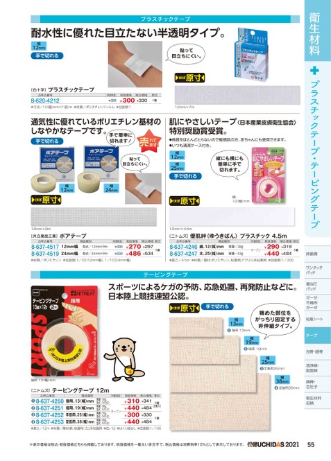 衛生材料プラスチックテープ・テーピングテープ耐水性に優れた目立たない半透明タイプ。プラスチックテープ幅12mm手で切れる[白十字]プラスチックテープお申込番号8-620-4212M価税抜¥320貼って目立ちにくい。ほぼ原寸単位1巻税抜価格税込価格¥300¥330●寸法/12(幅)mm×7(長)m●材質/ポリエチレンフィルム●包装数:112mm×7m通気性に優れているポリエチレン基材のしなやかなテープです。手で切れる手で簡単に切れます!肌にやさしいテープ〈日本産業皮膚衛生協会〉特別奨励賞受賞。●角質をほとんどとらないので敏感肌の方、赤ちゃんにも使用できます。●いつも清潔ケース付き。税抜価格税込価格単位¥270¥297¥486¥5341巻お申込番号8-637-42468-637-4247商品種別細、12(幅)mm太、25(幅)mm質量/28g質量/43gM価税抜オープン税抜価格税込価格単位¥290¥319¥440¥4841巻絆創膏ワンタッチパッドパッド傷当てパッドガーゼ・ガーゼ・不織布不織布ガーゼガーゼ粘着シートテープ包帯・眼帯清浄綿・脱脂綿脱脂綿綿棒・舌圧子衛生材料・舌圧子●材質/ポリエチレン●包装数:1/20(12mm幅)、1/10(24mm幅)●長さ/4.5m●材質/基材:ポリエチレン、粘着剤:アクリル系粘着剤●包装数:1/200テーピングテープスポーツによるケガの予防、応急処置、再発防止などに。日本陸上競技連盟公認。ほぼ原寸手で切れる痛めた部位をがっちり固定する非伸縮タイプ。幅13mm●指用13mm幅19mm●指用19mm幅25mm●手首用25mm幅38mm●足首用38mm税抜価格税込価格単位¥310¥341¥440¥484¥300¥330¥440¥4841組(2巻入)1巻お申込番号8-637-42508-637-42518-637-42528-637-4253商品種別指用、13(幅)mm指用、19(幅)mm手首用、25(幅)mm足首用、38(幅)mm質量/60g、型式/N1500質量/80g、型式/N1510質量/55g、型式/N1520質量/80g、型式/N1530M価税抜オープン❷●●●指用13(幅)mm[ニトムズ]テーピングテープ12m●長さ/12m●材質/基材:綿、粘着剤:ゴム系粘着剤●色/白●はくり紙なし●包装数:1/100※表示価格は税込・税抜価格どちらも掲載しております。税抜価格を一番太い赤文字で、税込価格は消費税率10%として表示しております。202155貼って目立ちにくい。幅12mm幅25mm手で切れるほぼ原寸縦にも横にも簡単に手で切れます。細、12(幅)mm12mm×4.5m[ニトムズ]優肌絆(ゆうきばん)プラスチック4.5m幅12mm幅24mmほぼ原寸12mm×9m[共立薬品工業]ポアテープお申込番号8-637-45178-637-4519商品種別12mm幅24mm幅型式/12mm×9m型式/24mm×9mM価税抜¥300¥550