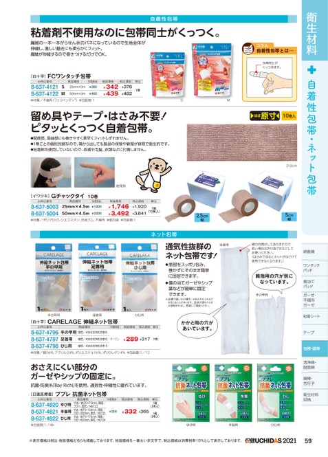 衛生材料自着性包帯・ネット包帯絆創膏ワンタッチパッドパッド傷当てパッドガーゼ・ガーゼ・不織布不織布ガーゼガーゼ粘着シートテープープ包帯・眼帯清浄綿・脱脂綿脱脂綿綿棒・舌圧子衛生材料・舌圧子自着性包帯粘着剤不使用なのに包帯同士がくっつく。繊維の一本一本がらせん状のバネになっているので生地全体が伸縮し、激しい動きにも柔らかくフィット。繊維が伸縮するので巻きつけるだけでOK。[白十字]FCワンタッチ包帯お申込番号8-637-41218-637-4122SM商品種別25mm×3mM価税抜¥38050mm×3m¥480●材質/不織布(フェリベンディ®)●包装数:1税抜価格¥342¥439税込価格単位¥376¥4821巻留め具やテープ・はさみ不要!ピタッとくっつく自着包帯。●関節部、屈曲部にも巻きやすく素早くフィットしずれません。●1巻ごとの個別包装なので、箱から出しても製品の保管や管理が容易で衛生的です。●粘着剤を使用していないので、皮膚や毛髪、衣類などに付着しません。SM使用例Gチャックタイ10巻[イワツキ]お申込番号8-637-50038-637-5004商品種別25mm×4.5mM価税抜¥1,80050mm×4.5m¥3,600税抜価格¥1,746¥3,492税込価格単位¥1,920¥3,8411箱(10巻入)●材質/ポリプロピレンエラスタン、合成ゴム、不織布●個包装●包装数:1ネット包帯2.5cm幅通気性抜群のネット包帯です!足首用●患部をスッポリ包み、巻かずにそのまま簡単に固定できます。●傷の当てガーゼやシップ薬などが簡単に固定できます。※皮膚の弱い方の場合、かゆみやかぶれなどを生じることがあります。症状が現れたときは使用を中止し、医師にご相談ください。かかと用の穴があいています。手の甲用足首用ひじ用[白十字]CARELAGE伸縮ネット包帯商品種別M価税抜税抜価格税込価格単位お申込番号8-637-47968-637-47978-637-4798ひじ用足首用手の甲用型式/4560309820885型式/4560309820892オープン型式/4560309820915¥289¥3171枚自着性包帯とは…包帯同士がくっつきます。ほぼ原寸10巻入2.5cm5cm幅縁の処理がしてありますので長い場合は折り曲げるなどしてお使いください。(はさみで切るとネットがほどけて使用できなくなります。)親指用の穴が別になっています。手の甲用●材質/綿56%、アクリル24%、ポリエステル16%、ポリウレタン4%●包装数:1/12おさえにくい部分のガーゼやシップの固定に。抗菌・防臭糸「BayRichi」を使用。通気性・伸縮性に優れています。[日進医療器]ププレ抗菌ネット包帯お申込番号8-637-48208-637-48218-637-4822●包装数:1/36ゆび用手首用ひじ用商品種別寸法/約25×75mm、周径/フリー、型式/H6722寸法/約75×150mm、周径/150〜300mm、型式/H6723寸法/約75×170mm、周径/150〜400mm、型式/H6724M価税抜税抜価格税込価格¥350¥332¥365単位1箱(3本入)1箱(2枚入)ゆび用手首用ひじ用※表示価格は税込・税抜価格どちらも掲載しております。税抜価格を一番太い赤文字で、税込価格は消費税率10%として表示しております。202159