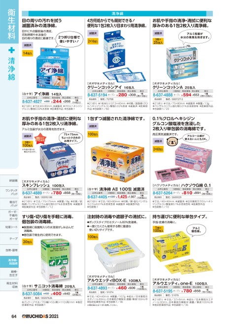 目の周りの汚れを拭う滅菌済みの清浄綿。4方何処からでも開封できる!便利な1包2枚入り目まわり用清浄綿。お肌や手指の清浄・清拭に便利な厚みのある1包2枚入り清浄綿。清浄綿目やにや点眼前後の清拭、花粉時期や水泳後の目の周りの清拭に最適です。滅菌済14包入2つ折り仕様で使いやすい!滅菌済2×16包入滅菌済2枚×25包入アルミ包装が水分の蒸発を防ぎます。[オオサキメディカル]クリーンコットンアイ16包入[オオサキメディカル]クリーンコットンA25包入[白十字]アイ浄綿14包入お申込番号8-637-4827M価税抜¥260税抜価格税込価格¥244¥268(14包入)●2つ折り●寸法:40×80mm●滅菌済●クロルヘキシジングルコン酸塩0.02%水溶液●医薬部外品●包装数:1単位1箱お申込番号M価税抜8-637-5194オープン税抜価格税込価格¥280¥308単位1箱(2枚×16包入)お申込番号M価税抜税抜価格税込価格8-637-4888オープン¥594¥653単位1箱(2枚×25包入)商品種別型式/72708商品種別型式/00072712●2つ折り●1枚あたり:37.5×40mm●材質/脱脂綿・クロルヘキシジングルコン酸塩0.02%含浸●滅菌済●医薬部外品●包装数:1/60●2つ折り●寸法/75×80mm●滅菌済●質量/13g●ベンザルコニウム塩化物0.01%水溶液含有●医薬部外品●包装数:1/20お肌や手指の清浄・清拭に便利な厚みのある1包2枚入り清浄綿。アルミ包装が水分の蒸発を防ぎます。滅菌済2枚×100包入※外装が変わる場合があります。75×75mmちょっと小さめのお得タイプ。1包ずつ滅菌された清浄綿です。滅菌済100包入0.1%クロルヘキシジングルコン酸塩液を含浸した2枚入り単包装の消毒綿です。高圧蒸気滅菌済です。滅菌済2×60包入アルコール綿が使えない人にもOK。[白十字]清浄綿AⅡ100包滅菌済お申込番号M価税抜税抜価格税込価格¥1,425¥1,5678-637-4405¥1,500(100包入)●2つ折り●寸法/80×80mm●材質/綿・塩化ベンザルコニウム0.01%水溶液含浸●滅菌済●医薬部外品●包装数:1単位1箱[ハクゾウメディカル]ハクゾウG綿0.1お申込番号M価税抜8-637-5264オープン税抜価格税込価格¥810¥891単位1箱(2枚×60包入)商品種別型式/2600029●寸法/40×40mm●滅菌済●日本薬局方クロルヘキシジングルコン酸塩液0.1%水溶液含有●医薬部外品●包装数:1/10注射時の消毒や遮眼子の清拭に。持ち運びに便利な単包タイプ。●ボックスタイプのエタノール80%含浸綿。●一度にたくさん使用する際に最適な使い切りタイプです。手指・皮膚の消毒に。1枚×100包入アルミ個包装。100枚入[オオサキメディカル]アルウエッティBOX-E100枚入お申込番号M価税抜税抜価格税込価格8-637-4893オープン¥460¥506単位1箱(100枚入)商品種別型式/31074●寸法/40×40mm●質量/107g●成分/日本薬局方エタノール:83mL、日本薬局方精製水:適量/薬液100mL中●指定医薬部外品●包装数:1/36※開封後はなるべく早く使用してください。[オオサキメディカル]アルウエッティone-E100包入お申込番号M価税抜税抜価格税込価格単位8-637-5195オープン¥780¥8581箱(1枚×100包入)商品種別型式/31076●2つ折り●寸法/37×8mm●成分/日本薬局方エタノール:83mL、日本薬局方精製水:適量/薬液100mL中●指定医薬部外品●包装数:1/36お申込番号8-637-5084M価税抜¥450税抜価格税込価格¥400¥440単位1箱(20包入)商品種別型式/00207626●パッケージ寸法/70幅)×55(奥)×110高)mm●指定医薬部外品●包装数:1642021[オオサキメディカル]スキンフレッシュ100包入お申込番号M価税抜8-637-4889オープン税抜価格税込価格¥780¥858単位1箱(2枚×100包入)商品種別型式/00095188●2つ折り●寸法/75×75mm●質量/8g●材質/脱脂綿・ベンザルコニウム塩化物0.01%水溶液含有●滅菌済●医薬部外品●包装数:1/12すり傷・切り傷を手軽に消毒。個包装の消毒綿。●脱脂綿に殺菌剤入りの水溶液がしみ込んだ消毒綿。●個包装で衛生的に使用できます。20包入[白十字]サニコット消毒綿20包入衛生材料清浄綿絆創膏ワンタッチパッドパッド傷当てパッドガーゼ・ガーゼ・不織布不織布ガーゼガーゼ粘着シートテープ包帯・眼帯清浄綿・脱脂綿綿棒・舌圧子衛生材料綿棒・舌圧子