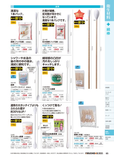 衛生材料綿棒絆創膏ワンタッチパッドパッド傷当てパッドガーゼ・ガーゼ・不織布不織布ガーゼガーゼ粘着シートテープープ包帯・眼帯清浄綿・脱脂綿脱脂綿綿棒・舌圧子衛生材料・舌圧子150mm150mm2号3号ほぼ原寸100本入綿径5mm2号綿径10mm3号[白十字]綿棒(木軸)100本入75mm76.5mm79mmお申込番号8-620-3006M価税抜¥300商品種別2号8-620-3007¥600税抜価格税込価格¥293¥322単位1袋(100本入)綿径/5mm¥586¥6441袋(100本入)商品種別綿径/10mm●寸法/150(長)mm●包装数:1/103号綿棒片側が綿棒、反対側が耳かきになっています。清潔な1本パックです。ほぼ原寸50本入79mm清潔な1本パック。ほぼ原寸120本入[白十字]綿棒(パック包装)120本入[白十字]耳かき綿棒(パック包装)50本入お申込番号8-637-4109お申込番号8-637-4110税抜価格税込価格単位1袋M価税抜¥250¥267(50本入)●紙軸●寸法/耳かき綿棒:75(長)mm●包装数:1¥243綿球部の凸凹が汚れをしっかりキャッチします。ほぼ原寸200本入[日進医療器]スパイラル綿棒お申込番号8-637-4934単位1パックM価税抜¥200税抜価格¥188税込価格¥206(200本入)●寸法/パッケージ:80(径)×82(高)mm●材質/紙軸、コットン●包装数:1/10くっつけて取る!片側は粘着剤付き、もう片側は通常の綿棒です。耳はもちろん掃除にも便利です!ほぼ原寸50本入単位1袋M価税抜¥400税抜価格¥388税込価格¥426(120本入)●紙軸●寸法/綿棒:79(長)mm●包装数:1シャワーや水泳の後の耳の中の吸水、清拭に便利です。ほぼ原寸80本入綿径6.5mm普通の綿棒の約2倍の大きさ!78mm[白十字]綿棒(シャワーコットン)80本入お申込番号8-637-4224商品種別綿径/6.5mm単位1パックM価税抜¥380税抜価格¥358税込価格¥393(80本入)●寸法/パッケージ:70(径)×83(高)mm●質量/65g●材質/脱脂綿●包装数:1/6通常の大きいタイプよりもふわふわ度が約30%もUP!吸水力もさらにパワーUPした、職人のこだわり綿棒が登場!単位1袋M価税抜税抜価格税込価格¥198¥217(50本入)オープン●寸法/パッケージ:135(幅径)×23(奥)×175(高)mm●質量/30g●材質/脱脂綿、紙軸、粘着成分:アクリル酸エステル樹脂●国産品●包装数:1/10[山洋]国産良品粘着綿棒50本お申込番号8-637-5079安心の日本製です!78mmほぼ原寸110本入[山洋]スゴふわっ綿棒110本入お申込番号8-637-5080単位M価税抜商品種別型式/4936613091127税抜価格税込価格1パック(110本入)オープン●寸法/パッケージ:81(径)×85(高)mm●質量/74g●国産品●包装数:1/60¥245¥223※表示価格は税込・税抜価格どちらも掲載しております。税抜価格を一番太い赤文字で、税込価格は消費税率10%として表示しております。202165