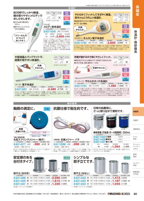 保健室体温計・検診器具保健室洗面所洗面所清掃用品トイレトイレ用品ティッシュッペーパー・ペーパー・タオルタオル飲料・食品キッチンキッチン用品用品事務用品・事務用品・その他他水洗い※△アルコール消毒検温部のみ※△その他中性洗剤※※布や綿にしみ込ませて清拭予測・実測わき下専用予測約15秒水洗い※△アルコール消毒検温部のみ※△その他×※布や綿にしみ込ませて清拭予測・実測わき下専用予測約30秒体温計※体温計は周囲の温度が10℃以下または40℃以上だと正確に測定できない場合があります。約30秒でしっかり検温。聞き取りやすいメロディでおしらせします。●大きな音で聞き取りやすい。●見やすいバックライト付き大型表示。水洗い※△アルコール消毒検温部のみ※△その他×※布や綿にしみ込ませて清拭[テルモ]メロディ音体温計予測・実測わき下専用予測約30秒お申込番号8-637-4549商品種別型式/ET-P330MZやわらかくフィットしてすばやく検温。赤ちゃんにうれしい体温計。●検温日時がわかる10回分メモリ。●ブザー音off機能。先端やわらか。「メリーさんのひつじ」でおしらせ♪単位1本M価税抜税抜価格税込価格¥3,790¥3,500¥3,850●寸法/30(幅)×133(長)×15(厚)mm●質量/約27g電池含む)●電源/CR2032×1個●測定範囲/32.0〜42.0℃●測定方式/予測(約30秒)・実測(約10分)●わき下専用●付属品/テスト用電池(ボタン電池CR2032×1個)内蔵)、収納ケース、取扱説明書(保証書付)●管理医療機器●包装数:1/5ケース付き[オムロン]オムロン電子体温計お申込番号8-637-4765商品種別型式/MC-682M価税抜¥3,800税抜価格¥3,600税込価格¥3,960単位1本●寸法/41幅)×108(長)×19(厚)mm●質量/25g●材質/ABS樹脂●測定方式/予測(約15秒)・実測(約10分)●わき下専用●やわらかプローブ●日時付10回メモリ●バックライト付●付属品/テスト用電池(CR2032×1個)、取扱説明書(品質保証書付)●管理医療機器●包装数:1/50大型液晶とバックライトで、結果が見やすい体温計。アルコール消毒表示部以外※△その他×先端が曲がるので体にやさしくフィット。●測定が約37.8℃以上の場合はブザー音を変えてお知らせします。●わきの下計測。保管に便利なケース付き。水洗い先端部のみ※△先端やわらか。※布や綿にしみ込ませて清拭先端やわらか。[タニタ]電子体温計予測・実測わき下専用予測20秒お申込番号8-637-5091商品種別型式/BT470BLM価税抜オープン税抜価格¥2,480税込価格¥2,728単位1本●寸法/29(幅)×136長)×15(厚)mm●質量/約23g●電源/リチウムコイン電池(CR2032)●測定範囲/32.0〜42.0℃●測定方式/予測(20秒)・実測●わき下専用●付属品/保護ケース●管理医療機器●包装数:1/12[ドリテック]やわらかタッチ体温計お申込番号8-637-4764商品種別型式/TO-200PKM価税抜オープン税抜価格¥1,480税込価格¥1,628単位1本●寸法/22幅)×140長)×12(厚)mm●質量/13g●電源/アルカリボタン電池LR41×1個(DC1.5V)●測定範囲:32.0℃〜42.9℃●測定方式/予測(約30秒)・実測(約9分)●わき下専用●測定精度/±0.1(32.0℃〜42.9℃の間)周囲温度10℃〜40℃のとき●測温部/サーミスタ●ブザー音量/約60dB●オートパワーオフ/約12分●付属品/テスト用電池、収納ケース●色/ピンク●医療機器認証番号227AKBZX00022000号●管理医療機器●包装数:1/12胸囲の測定に。1.5m抗菌仕様で衛生的です。日常の処置用に。さっと取り出せて便利です。検診器具使用例表裏目盛り付き。[積水樹脂商事]丸型スプリングメジャー(巻尺)お申込番号8-637-4377M価税抜¥450商品種別型式/SP-715税抜価格¥380税込価格単位¥4181個[原度器]抗菌メジャーバラお申込番号8-617-2298M価税抜¥260商品種別型式/KB-15税抜価格¥208税込価格¥228単位1個透明茶色ルリ色綿球容器(万能壺・ガーゼ瓶兼用)250mLお申込番号8-637-4425◎透明8-637-4426●茶色8-637-4427●ルリ色商品種別H2470H2471H2472単位1個M価税抜¥1,330税抜価格¥1,263税込価格¥1,389●寸法/本体:56(径)×16(厚)mm、メジャー:1.5(長)m×(幅)mm●自動巻込式●包装数:1/127●テープ幅/15mm●テープ長さ/1.5m●質量/16g●材質/アクリル塩化ビニール樹脂(抗菌剤入)●包装数:1/10●寸法/約75(径)×90(高)mm●材質/容器:ガラス、ふた:ステンレス●包装数:1安定感のある台付きタイプ。ステンレスシンプルな鉗子立てです。ステンレス大中小鉗子立(台付き)お申込番号8-637-43998-637-44008-637-4401大中小商品種別M価税抜寸法/90(径)×155(高)mm¥2,200寸法/75(径)×120(高)mm¥1,700寸法/60(径)×100(高)mm¥1,400●材質/ステンレス●包装数:1鉗子立(台なし)大中税抜価格税込価格¥2,090¥2,299¥1,615¥1,776¥1,330¥1,463単位1個お申込番号8-637-44228-637-44238-637-4424大中小商品種別M価税抜寸法/90(径)×135高)mm¥1,550寸法/75(径)×105高)mm¥1,250寸法/60(径)×85(高)mm¥1,100●材質/ステンレス●包装数:1税抜価格税込価格¥1,472¥1,619¥1,187¥1,305¥1,045¥1,149小単位1個※表示価格は税込・税抜価格どちらも掲載しております。税抜価格を一番太い赤文字で、税込価格は消費税率10%として表示しております。202169
