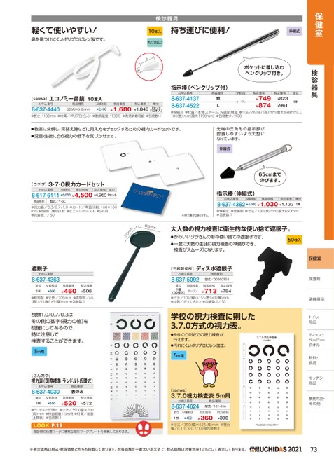 保健室伸縮式検診器具持ち運びに便利!検診器具ポケットに差し込むペンクリップ付き。指示棒(ペンクリップ付)お申込番号8-637-41378-637-4522商品種別M価税抜MLオープン税抜価格¥749¥874税込価格単位¥823¥9611本●伸縮式●材質/本体:スチール、先端部:樹脂●寸法/M:147(長)mm(最大898mm)、L:180(長)mm(最大1190mm)●包装数:1/100先端の三角形の指示部が認識しやすいよう大型になっています。伸縮式65cmまでのびます。指示棒(伸縮式)軽くて使いやすい!鼻を傷つけにくいポリプロピレン製です。[sanwa]エコノミー鼻鏡10本入お申込番号8-637-4440商品種別20A)×5(B)mmM価税抜¥2,100税抜価格¥1,68010本入ポリプロピレンAB税込価格単位¥1,8481セット(10本入)●長さ/130mm●材質/ポリプロピレン●耐熱温度/130℃●煮沸消毒可能●包装数:1●教室に常備し、席替え時などに見え方をチェックするための視力カードセットです。●児童・生徒に自ら視力の低下を気づかせます。[ウチダ]3・7・0視力カードセットお申込番号M価税抜税抜価格税込価格単位8-617-6111¥5,000¥4,500¥4,9501セット商品種別型式/Y-5C●視力値/0.3/0.7/1.0●カード/両面印刷、180×180mm、樹脂製、3種各1枚●ビニールケース入●5m用●包装数:1/5065mm55mm遮眼子お申込番号8-637-4363単位1本M価税抜¥500税抜価格¥460税込価格¥506●樹脂製●全長/205mm●遮眼部/65(横)×55(縦)×5(厚)mm●包装数:1視標1.0/0.7/0.3はその側の数字(視力の値)を明確にしてあるので、特に注意して検査することができます。5m用[はんだや]視力表(国際標準・ランドルト氏環式)お申込番号8-637-4030商品種別表のみ単位1枚M価税抜¥550税抜価格¥520税込価格¥572●ランドルト氏環式●寸法/350(幅)×760(高)mm●検査距離/5m用●材質/紙製(上質紙)●包装数:1P.19LOOK健診時の位置マークに便利な足形マークプレートを掲載しております。載てりす。お申込番号M価税抜税抜価格税込価格8-637-4362¥1,100¥1,030¥1,133単位1本※視力表ではありません。●伸縮式●金属製●寸法/130長)mm(最大650mm)●包装数:1大人数の視力検査に衛生的な使い捨て遮眼子。●かわいいゾウさんの形の使い捨ての遮眼子です。●一度に大勢の生徒に視力検査の準備ができ、50枚入検査がスムーズになります。[三和製作所]ディスポ遮眼子お申込番号8-637-5092商品種別型式/00260958M価税抜単位1箱税抜価格¥713税込価格¥784(50枚入)オープン●寸法/105幅)×155長)×1厚)mm●材質/ポリエチレン●包装数:1/30学校の視力検査に則した3.7.0方式の視力表。●A・B・C・D判定での視力検査が行えます。●汚れにくいポリプロピレン加工。5m用[sanwa]3.7.0視力検査表5m用お申込番号8-637-4624商品種別型式/101-856単位M価税抜1枚¥400税抜価格¥360税込価格¥396●寸法/350(幅)×625(高)mm●視力値/0.1/0.3/0.7/1.0●包装数:1保健室洗面所洗面所清掃用品トイレトイレ用品ティッシュッペーパー・ペーパー・タオルタオル飲料・食品キッチンキッチン用品用品事務用品・事務用品・その他他※表示価格は税込・税抜価格どちらも掲載しております。税抜価格を一番太い赤文字で、税込価格は消費税率10%として表示しております。2021