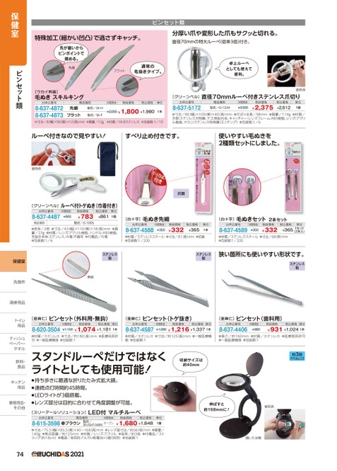 特殊加工(細かい凹凸)で逃さずキャッチ。ピンセット類分厚い爪や変形した爪もサクッと切れる。直径70mmの特大ルーペ(倍率3倍)付き。先が細いからピンポイントで摘める。先細フラット通常の毛抜きタイプ。卓上ルーペとしても使えて便利。[ウカイ利器]毛ぬきスキルキングお申込番号8-637-48728-637-4873商品種別M価税抜税抜価格税込価格単位先細フラット型式/SK-H型式/SK-F¥2,000¥1,800¥1,9801本●寸法/8(幅)×90(奥)×12(高)mm●質量/12g●材質/18-8ステンレス●包装数:1/10[グリーンベル]直径70mmルーペ付きステンレス爪切りお申込番号8-637-5172商品種別型式/G-1224M価税抜¥2,500税抜価格¥2,375税込価格¥2,612単位1個●寸法/80(幅)×109(奥)×40(高)mm●爪切り全長/98mm●質量/114g●材質/刃部:ステンレス刃物鋼、テコ:亜鉛合金、キャッチャー・レンズフレーム:ABS樹脂、レンズ:アクリル樹脂、ヤスリ:ステンレス特殊鋼(エッチング)●包装数:1/6使用例ルーペ付きなので見やすい!すべり止め付きです。使いやすい毛ぬきを2種類セットにしました。使用例[グリーンベル]ルーペ付トゲぬき(巾着付き)お申込番号8-637-4487M価税抜¥900商品種別税抜価格¥783型式/G-1005税込価格単位¥8611個●倍率/2倍●寸法/43(幅)×110(奥)×18(高)mm●質量/23g●材質/レンズ:アクリル樹脂、ハンドル:ABS樹脂、毛抜き本体:ステンレス、巾着:不織布●付属品/巾着●包装数:1/6ステンレス製無鈎抗菌[白十字]毛ぬき先細お申込番号8-637-4588M価税抜¥350税抜価格¥332税込価格¥365単位1本●材質/ステンレススチール●寸法/81(長)mm●抗菌●包装数:1/200[白十字]毛ぬきセット2本セットお申込番号8-637-4589M価税抜¥350税抜価格¥332税込価格単位¥3651セット(2本入)●材質/ステンレススチール●寸法/68長)mm●包装数:1/200ステンレス製狭い箇所にも使いやすい形状です。ステンレス製[亜麻仁]ピンセット(外科用・無鈎)[亜麻仁]ピンセット(トゲ抜き)[亜麻仁]ピンセット(歯科用)お申込番号8-620-3504M価税抜税抜価格税込価格単位¥1,150¥1,074¥1,1811本お申込番号8-637-4587M価税抜税抜価格税込価格単位¥1,280¥1,216¥1,3371本お申込番号8-637-4406M価税抜¥980税抜価格税込価格単位¥931¥1,0241本●材質/ステンレス●寸法/約180(長)mm●医療用具許可●一般医療機器●包装数:1●材質/ステンレス●寸法/約125長)mm●一般医療機器●包装数:1●長さ/約160mm●材質/ステンレス●医療器具許可●一般医療機器●包装数:1スタンドルーペだけではなくライトとしても使用可能!●持ち歩きに最適な折りたたみ式拡大鏡。●連続点灯時間約45時間。●LEDライトが3個搭載。●レンズ部分は目的に合わせて角度調整が可能。[スリーアールソリューション]LED付マルチルーペ収納サイズは約40mm約3倍アクリルレンズ伸ばすと約168mmに!使用例保健室ピンセット類保健室洗面所洗面所清掃用品清掃用トイレトイレ用品用品ティッシュテペーパー・ペーパー・タオルタオル飲料・飲料食品食キッチンキッチン用品用品事務用品・事務用品・その他その他お申込番号8-615-3598●ブラウン型式/3R-LIGHT-04BWオープン¥1,680¥1,848商品種別M価税抜税抜価格税込価格単位1個●寸法/75.5(幅)×85.5(奥)×40〜168(高)mm●レンズ面寸法/約56(径)mm●質量/140g●焦点距離/約125mm●材質/レンズ:アクリル●倍率/約3倍●付属品/ストラップ(約18cm)●電源/単四形アルカリ乾電池×3個(別売)●包装数:1開いた状態742021