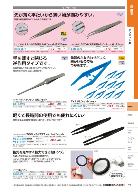 保健室ステンレス製ピンセット類先が薄く平たいから薄い物が摘みやすい。事務や植物採取などにも使える汎用品です。ピンセット類保健室洗面所洗面所清掃用品トイレトイレ用品ティッシュッペーパー・ペーパー・タオルタオル飲料・食品キッチンキッチン用品用品事務用品・事務用品・その他他マグネット付。着脱できます。202175ステンレス製[ウカイ利器]ステンレス先薄型AAピンセット直125mm[ウカイ利器]ステンレス先薄型AAピンセット曲125mmお申込番号8-615-3577M価税抜オープン税抜価格¥170税込価格¥187単位1本お申込番号8-615-3578M価税抜オープン税抜価格¥173税込価格¥190単位1本●寸法/10(幅)×126奥)×8高)mm●質量/14g●包装数:1/10※医療機器ではありません。●寸法/10(幅)×125(奥)×8(高)mm●質量/14g●包装数:1/10※医療機器ではありません。手を離すと閉じる逆作用タイプです。本体を握ると先端が開くセルフロックのピンセット。部品などの保持、固定に最適です。ステンレス製先端のかみ合わせがよく、細かいものでもつかめます。10本入ポリスチレン製[ウカイ利器]ステンレス逆ピンセットお申込番号8-615-3579M価税抜オープン税抜価格¥463税込価格¥509単位1本●寸法/12(幅)×165(奥)×15(高)mm●質量/19g●包装数:1/10※医療機器ではありません。ディスポピンセット10本入お申込番号8-615-1521商品種別全長/130mm、滑り止め加工、P4614M価税抜¥480税抜価格¥454税込価格¥499単位1組(10本入)●材質/ポリスチレン●耐熱温度/65〜77℃●包装数:1※医療機器ではありません。軽くて長時間の使用でも疲れにくい!耐熱・耐薬品・耐酸性・耐油性に優れているピンセットです!●TTL-2●TTL-4使用例型式/TTL-2オープン¥385¥4231本●●寸法/120(全長)×8(幅)mm●質量/3g●材質/グラスファイバー●耐熱温度/225℃●包装数:1型式/TTL-4[アイガーツール]TOOL×2グラスファイバーピンセットお申込番号商品種別M価税抜税抜価格税込価格単位8-615-4140細先端8-615-4141巾広先端●指先を見やすく拡大できる指レンズ。糸通しや精密部品などの作業に最適です。スプリング部とレンズ部がマグネットになっているので、自由な回転ができ、レンズの取り外しも簡単です。[TSK]指レンズお申込番号8-637-5301商品種別型式/RX-7AM価税抜¥1500税抜価格¥1,382税込価格¥1,520単位1個●寸法/50(幅)×95(奥)×25(高)mm●レンズ面寸法/35(径)mm●質量/26g●材質/ABS樹脂、アクリル樹脂、バネ鋼(ニッケルメッキ)●倍率/約2倍●包装数:1※表示価格は税込・税抜価格どちらも掲載しております。税抜価格を一番太い赤文字で、税込価格は消費税率10%として表示しております。