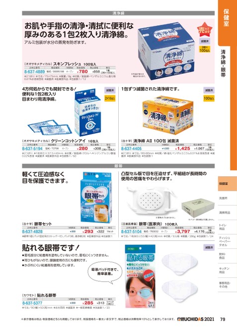 保健室清浄綿・眼帯滅菌済2枚×100包入滅菌済100包入清浄綿お肌や手指の清浄・清拭に便利な厚みのある1包2枚入り清浄綿。アルミ包装が水分の蒸発を防ぎます。[オオサキメディカル]スキンフレッシュ100包入お申込番号8-637-4889商品種別M価税抜型式/00095188オープン税抜価格¥780税込価格¥858(2枚×100包入)●2つ折り●寸法/75×75mm●質量/8g●材質/脱脂綿・ベンザルコニウム塩化物0.01%水溶液含有●滅菌済●医薬部外品●包装数:1/12単位1箱4方何処からでも開封できる!便利な1包2枚入り目まわり用清浄綿。滅菌済2×16包入※外装が変わる場合があります。1包ずつ滅菌された清浄綿です。[オオサキメディカル]クリーンコットンアイ16包入[白十字]清浄綿AⅡ100包滅菌済お申込番号8-637-5194型式/72708オープン商品種別M価税抜税抜価格税込価格¥280¥308単位1箱お申込番号8-637-4405(2枚×16包入)●2つ折り●1枚あたり:37.5×40mm●材質/脱脂綿・クロルヘキシジングルコン酸塩0.02%含浸●滅菌済●医薬部外品●包装数:1/60(100包入)●2つ折り●寸法/80×80mm●材質/綿・塩化ベンザルコニウム0.01%水溶液含浸●滅菌済●医薬部外品●包装数:1M価税抜¥1,500税抜価格¥1,425税込価格¥1,567単位1箱軽くて圧迫感なく目を保護できます。眼帯凸型セル版で目を圧迫せず、平組紐が長時間の使用の苦痛をやわらげます。※実物大ではありません。※パッド・清浄綿は付属しません。[白十字]眼帯セットお申込番号8-637-4828M価税抜¥300税抜価格¥293税込価格単位¥3221セットお申込番号8-637-5104商品種別型式/783032M価税抜オープン税抜価格¥3,797[日進医療器]眼帯(医家向)100枚入税込価格¥4,176単位1箱(100枚入)●眼帯1個(パッド固定用のストッパー付)、パッド3枚、清浄綿2枚●医薬部外品●包装数:1●寸法/1枚あたり:55(幅)×42(高)mm●材質/セル板●質量/286g●包装数:1/24貼れる眼帯です!●眉毛部分に粘着剤を塗布していないので、眉毛にくっつきません。●耳ひもがないので、眼鏡使用の方にも便利です。●かぶれにくい粘着剤を使用しています。吸液パッド付きで、簡単装着。[カワモト]貼れる眼帯お申込番号8-637-5377M価税抜¥300税抜価格¥285税込価格単位¥3131パック(3枚入)●寸法/90(幅)×50(高)mm●左右両用●滅菌済●一般医療機器●包装数:1/20滅菌済保健室洗面所洗面所清掃用品トイレトイレ用品ティッシュッペーパー・ペーパー・タオルタオル飲料・食品キッチンキッチン用品用品事務用品・事務用品・その他他※表示価格は税込・税抜価格どちらも掲載しております。税抜価格を一番太い赤文字で、税込価格は消費税率10%として表示しております。202179