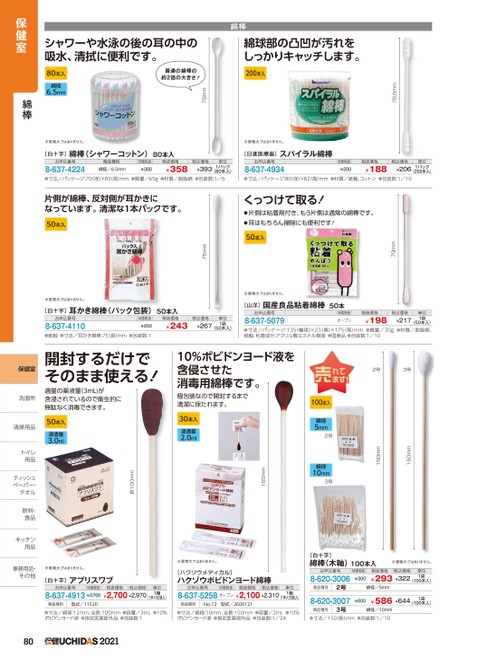 税込価格単位76.5mmシャワーや水泳の後の耳の中の吸水、清拭に便利です。綿球部の凸凹が汚れをしっかりキャッチします。綿棒普通の綿棒の約2倍の大きさ!200本入78mm80本入綿径6.5mm※実物大ではありません。[日進医療器]スパイラル綿棒お申込番号8-637-4934¥206●寸法/パッケージ:80(径)×82(高)mm●材質/紙軸、コットン●包装数:1/10¥1881パック(200本入)M価税抜¥200税抜価格79mm税込価格くっつけて取る!●片側は粘着剤付き、もう片側は通常の綿棒です。●耳はもちろん掃除にも便利です!50本入※実物大ではありません。[山洋]国産良品粘着綿棒50本お申込番号8-637-5079(50本入)●寸法/パッケージ:135(幅径)×23(奥)×175(高)mm●質量/30g●材質/脱脂綿、紙軸、粘着成分:アクリル酸エステル樹脂●国産品●包装数:1/10M価税抜オープン税抜価格¥198単位1袋¥217※実物大ではありません。[白十字]綿棒(シャワーコットン)80本入お申込番号8-637-4224商品種別綿径/6.5mmM価税抜¥380税抜価格¥358税込価格単位¥3931パック(80本入)●寸法/パッケージ:70径)×83高)mm●質量/65g●材質/脱脂綿●包装数:1/6片側が綿棒、反対側が耳かきになっています。清潔な1本パックです。50本入単位1袋¥267(50本入)75mm税込価格※実物大ではありません。[白十字]耳かき綿棒(パック包装)50本入お申込番号8-637-4110M価税抜¥250税抜価格¥243●紙軸●寸法/耳かき綿棒:75長)mm●包装数:12号3号150mm150mm100本入綿径5mm2号綿径10mm3号150mm約100mm開封するだけでそのまま使える!適量の薬液量(3mL)が含浸されているので衛生的に無駄なく消毒できます。10%ポビドンヨード液を含侵させた消毒用綿棒です。個包装なので開封するまで清潔に保たれます。50本入浸透量3.0ml30本入浸透量2.0ml※実物大ではありません。[白十字]綿棒(木軸)100本入※実物大ではありません。※実物大ではありません。[白十字]アプリスワブお申込番号M価税抜8-637-4913¥2,700税抜価格税込価格¥2,700¥2,970単位1箱(1本×50袋入)[ハクゾウメディカル]ハクゾウポビドンヨード綿棒お申込番号M価税抜8-637-5258オープン税抜価格税込価格¥2,100¥2,310単位1箱(1本×30袋入)商品種別型式/11520商品種別No.12型式/2600121●寸法/綿径:12mm、全長:100mm●容量/3mL●10%ポピドンヨード液●指定医薬部外品●包装数:1●寸法/綿経:10mm、全長:150mm●容量/2mL●10%ポビドンヨード液●指定医薬部外品●包装数:1/242021お申込番号8-620-3006M価税抜¥300商品種別2号8-620-3007¥600税抜価格税込価格¥293¥322単位1袋(100本入)綿径/5mm¥586¥6441袋(100本入)商品種別綿径/10mm●寸法/150(長)mm●包装数:1/103号保健室綿棒保健室洗面所洗面所清掃用品清掃用トイレトイレ用品用品ティッシュテペーパー・ペーパー・タオルタオル飲料・飲料食品食キッチンキッチン用品用品事務用品・事務用品・その他その他
