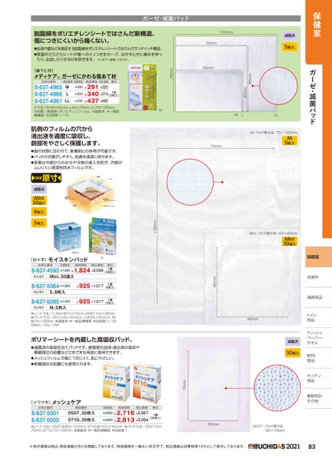 保健室ガーゼ・滅菌パッド滅菌済5枚入65mm40mm100mm70mm65mm脱脂綿をポリエチレンシートではさんだ新構造。傷につきにくいから痛くない。ガーゼ・滅菌パッド●血液や膿などを吸収する脱脂綿をポリエチレンシートではさんだサンドイッチ構造。●表面のさらさらシートが傷へのくっつきをセーブ、はがすときに痛みを伴ったり、出血したりするのを防ぎます。※1枚ずつ滅菌してあります。75mm[森下仁丹]メディケア®ガーゼにかわる傷あて材お申込番号8-637-49658-637-49668-637-4967商品種別MLLLM価税抜¥300¥350¥450税抜価格税込価格¥291¥320¥340¥374¥437¥480単位1袋(5枚入)●寸法/M:40×65mm、L:65×70mm、LL:75×100mm●材質/脱脂綿、ポリエチレンフィルム●滅菌済●一般医療機器●包装数:1/10MMLLLM:パッド部寸法:75×100mmM5枚入Mini:パッド部寸法:45×45mmMini30袋入45mm滅菌済30枚入保健室洗面所洗面所清掃用品トイレトイレ用品ティッシュッペーパー・ペーパー・タオルタオル飲料・食品キッチンキッチン用品用品事務用品・事務用品・その他他75mm45mm50mm0507:パッド部寸法:50×75mm100mm肌側のフィルムの穴から浸出液を適度に吸収し、創部をやさしく保護します。●創の状態に合わせて、軟膏剤との併用が可能です。●パッドの交換がしやすく、皮膚を清潔に保ちます。●表側は外部からの水分や汚物の進入を防ぎ、内部がムレにくい透湿性防水フィルムです。ほぼ原寸滅菌済Mini30袋入8枚入5枚入[白十字]モイスキンパッドSMiniお申込番号M価税抜税抜価格税込価格8-637-4593¥1,920¥1,824¥2,006単位1箱(30袋入)商品種別Mini、30袋入8-637-5064¥1,000商品種別S、8枚入8-637-5065¥1,000商品種別M、5枚入¥925¥1,0171箱(8枚入)¥925¥1,0171箱(5枚入)●シート寸法/S、Mini:約75×75mm、M:約110×128mm●パッド寸法/Mini45×45mm、S:約45×45mm、M:約75×100mm●滅菌済●一般医療機器●包装数:1/30(Mini)、1(S)、1(M)ポリマーシートを内蔵した高吸収パッド。●滅菌済の高吸収当てパッドです。創傷部の血液・浸出液の吸収や褥瘡部位の処置などさまざまな用途に使用できます。●メッシュフィルムで傷につきにくく、肌にやさしい。●熱傷部位の処置にも使用されます。75mm単位M価税抜税抜価格税込価格¥2,800¥2,716¥2,987¥2,900¥2,813¥3,0941箱(30枚入)[イワツキ]メッシュケアお申込番号8-637-50018-637-5002商品種別0507、30枚入0710、30枚入●シート寸法/0507:約80×103mm、0710:約103×140mm●パッド寸法/0507:50×75mm、0710:75×100mm●滅菌済●一般医療機器●包装数:1※表示価格は税込・税抜価格どちらも掲載しております。税抜価格を一番太い赤文字で、税込価格は消費税率10%として表示しております。2021