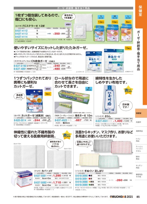 保健室ガーゼ・絆創膏・傷手当て用品ガーゼ・絆創膏・傷手当て用品1枚ずつ個包装してあるので、傷口にも安心。[白十字]FCステラーゼ12折衛生的な1枚滅菌!滅菌済Sサイズ12枚入Mサイズ10枚入Lサイズ8枚入お申込番号8-637-41128-637-41138-637-4114SM¥400L(8枚入)●ガーゼ寸法/S:50×50mm、M:75×75mm、L:75×100mm●材質/綿●滅菌済●一般医療機器●包装数:1S:50×50mm商品種別M価税抜税抜価格税込価格¥350¥385単位1箱1箱1箱(12枚入)(10枚入)使いやすいサイズにカットした折りたたみガーゼ。●ソフトで吸収性の良い、医療現場でも使用されているガーゼです。●使いやすいサイズにカットして折りたたんであるため、切ったり折りたたむ手間がありません。●チャック付きパッケージのため、衛生的に保管可能。[オオサキメディカル]CN救急ガーゼ15枚入15枚入お申込番号商品種別8-637-5192ふつうサイズ寸法/75×75mm、8-637-4891大きめサイズ寸法/150×150mm、型式/193型式/194M価税抜オープン税抜価格税込価格¥240¥264¥480¥528単位1袋(15枚入)●一般医療機器●包装数:1/200ふつうサイズ大きめサイズ1つずつパックされており携帯にも便利なカットガーゼ。滅菌済高品質タイプ。6枚入ロール状なので用途に合わせて長さを自由にカットできます。幅30cm[白十字]カットガーゼ(滅菌済)6枚入[N&Nコーポレーション]巻きガーゼ10m※医療用の滅菌、殺菌はしておりません。お申込番号8-620-3014M価税抜¥250税抜価格¥244税込価格¥268単位1袋(6枚入)お申込番号M価税抜8-637-4523オープン税抜価格¥667税込価格単位¥7331箱●寸法/50×50mm●滅菌済●医療ガーゼタイプⅡ●一般医療機器●包装数:1商品種別幅30cm●材質/綿100%●包装数:1/50綿特性を生かしたしめやすい布地です。日本製です![イシミズ]さらしお申込番号M価税抜税抜価格税込価格8-637-4501オープン¥1,400¥1,540●寸法/340(幅)mm×10長)m●材質/綿100%●質量/370g●日本製●包装数:1/50保健室洗面所洗面所単位1枚伸縮性に優れた不織布製の切って使える医療用絆創膏。洗面からキッチン、マスク作り、お祭りなど多用途にお使いいただけます。8cm×5m通気性がありソフトな肌ざわり。6cm×5mお肌にやさしい綿100%です。紺赤[テルモ]カバーメド[イシミズ]手ぬぐい豆しぼり黄色緑色お申込番号M価税抜税抜価格税込価格8-637-5081¥1,436¥1,290¥1,419単位1巻商品種別6cm×5m型式/JW-CM7215208-637-5082¥1,900¥1,710¥1,8811巻商品種別8cm×5m型式/JW-CM721530●材質/粘着テープ:ポリエステル不織布、粘着剤:アクリル系●一般医療機器●包装数:1/2お申込番号8-618-30908-618-30918-618-30888-618-3089●紺●赤●黄色●緑色商品種別M価税抜税抜価格税込価格単位型式/00026型式/10026型式/60026型式/70026オープン¥260¥2861枚●寸法/約330×900mm●質量/35g●材質/綿100%●日本製●包装数:1/10※端は縫っていません。清掃用品トイレトイレ用品ティッシュッペーパー・ペーパー・タオルタオル飲料・食品キッチンキッチン用品用品事務用品・事務用品・その他他※表示価格は税込・税抜価格どちらも掲載しております。税抜価格を一番太い赤文字で、税込価格は消費税率10%として表示しております。2021