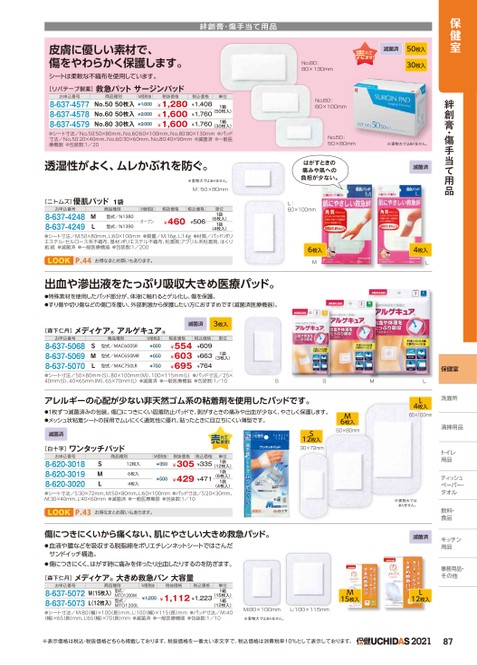 保健室絆創膏・傷手当て用品保健室洗面所洗面所清掃用品トイレトイレ用品ティッシュッペーパー・ペーパー・タオルタオル飲料・食品キッチンキッチン用品用品事務用品・事務用品・その他他皮膚に優しい素材で、傷をやわらかく保護します。シートは柔軟な不織布を使用しています。[リバテープ製薬]救急パットサージンパッドお申込番号8-637-45778-637-45788-637-4579商品種別No.5050枚入M価税抜¥1,600No.6050枚入¥2,000No.8030枚入¥2,000税抜価格¥1,280¥1,600¥1,600(30枚入)●シート寸法/No.50:50×80mm、No.60:60×100mm、No.80:80×130mm●パッド寸法/No.50:20×40mm、No.60:30×60mm、No.80:40×90mm●滅菌済●一般医療機器●包装数:1/20絆創膏・傷手当て用品税込価格単位¥1,408¥1,760¥1,7601箱(50枚入)1箱滅菌済50枚入30枚入No.80:80×130mmNo.60:60×100mmNo.50:50×80mm※実物大ではありません。透湿性がよく、ムレかぶれを防ぐ。※実物大ではありません。M:50×80mm[ニトムズ]優肌パッド1袋お申込番号8-637-42488-637-4249ML商品種別M価税抜税抜価格税込価格型式/N1380型式/N1390オープン¥460¥506単位1袋(6枚入)1袋(4枚入)●シート寸法/M:50×80mm、L:60×100mm●質量/M:16g、L:14g●材質/パッド:ポリエステル・セルロース系不織布、基材:ポリエステル不織布、粘着剤:アクリル系粘着剤、はくり紙:紙●滅菌済●一般医療機器●包装数:1/200LOOKP.44お得なまとめ買いもあります。はがすときの痛みや肌への負担が少ない。L:60×100mm6枚入M出血や滲出液をたっぷり吸収大きめ医療パッド。●特殊素材を使用したパッド部分が、体液に触れるとゲル化し、傷を保護。●すり傷や切り傷などの傷口を覆い、外部剌激から保護したい方におすすめです(滅菌済医療機器)。滅菌済4枚入L[森下仁丹]メディケア®アルゲキュア®滅菌済3枚入お申込番号8-637-50688-637-50698-637-5070SML商品種別型式/MAC600SR型式/MAC650MR型式/MAC750LRM価税抜¥600¥650¥750税抜価格¥554¥603¥695税込価格単位¥609¥663¥7641袋(3枚入)●シート寸法/50×80mm(S)、80×100mm(M)、100×115mm(L)●パッド寸法/25×40mm(S)、40×65mm(M)、65×70mm(L)●滅菌済●一般医療機器●包装数:1/10SSMLアレルギーの心配が少ない非天然ゴム系の粘着剤を使用したパッドです。●1枚ずつ滅菌済みの包装。傷口につきにくい固着防止パッドで、剥がすときの痛みや出血が少なく、やさしく保護します。●メッシュ状粘着シートの採用でムレにくく通気性に優れ、貼ったときに目立ちにくい薄型です。S12枚入30×72mm滅菌済[白十字]ワンタッチパッドお申込番号8-620-30188-620-30198-620-3020SML商品種別12枚入6枚入4枚入M価税抜¥350税抜価格税込価格¥305¥335単位1袋(12枚入)¥500¥429¥4711袋(6枚入)1袋(4枚入)●シート寸法/S:30×72mm、M:50×80mm、L:60×100mm●パッド寸法/S:20×30mm、M:30×40mm、L:40×60mm●滅菌済●一般医療機器●包装数:1/10LOOKP.43お得なまとめ買いもあります。傷につきにくいから痛くない、肌にやさしい大きめ救急パッド。●血液や膿などを吸収する脱脂綿をポリエチレンネットシートではさんだサンドイッチ構造。●傷につきにくく、はがす時に痛みを伴ったり出血したりするのを防ぎます。[森下仁丹]メディケア®大きめ救急バン大容量L4枚入60×100mmM6枚入50×80mm※実物大ではありません。滅菌済お申込番号8-637-50728-637-5073商品種別(15枚入)型式/M(12枚入)型式/LMTO1200M(12枚入)●シート寸法/M:80(幅)×100(長)mm、L:100(幅)×115(長)mm●パッド寸法/M:40(幅)×65(長)mm、L:65幅)×70長)mm●滅菌済●一般医療機器●包装数:1/10MTO1200LM価税抜税抜価格税込価格¥1,200¥1,112¥1,223(15枚入)単位1箱1箱M15枚入L12枚入M:80×100mmL:100×115mm※実物大ではありません。※表示価格は税込・税抜価格どちらも掲載しております。税抜価格を一番太い赤文字で、税込価格は消費税率10%として表示しております。2021