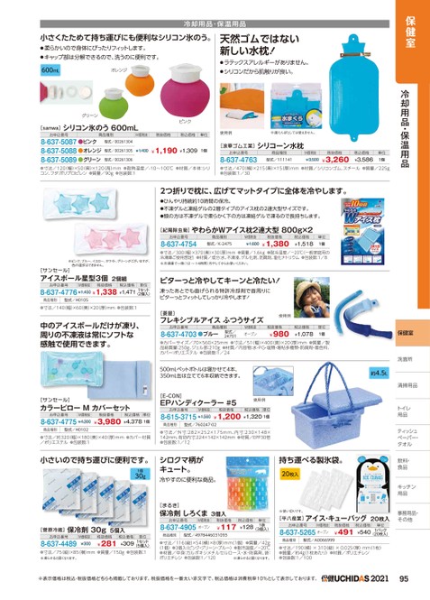 保健室冷却用品・保温用品保健室洗面所洗面所清掃用品トイレトイレ用品ティッシュッペーパー・ペーパー・タオルタオル飲料・食品キッチンキッチン用品用品事務用品・事務用品・その他他冷却用品・保温用品小さくたためて持ち運びにも便利なシリコン氷のう。●柔らかいので身体にぴったりフィットします。●キャップ部は分解できるので、洗うのに便利です。600mLオレンジ天然ゴムではない新しい水枕!●ラテックスアレルギーがありません。●シリコンだから肌触りが良い。グリーン[sanwa]シリコン氷のう600mLピンクお申込番号商品種別M価税抜税抜価格税込価格単位8-637-5087●ピンク8-637-5088●オレンジ8-637-5089●グリーン型式/00261304型式/00261305¥1,400¥1,190¥1,3091個型式/00261306使用例※湯たんぽとしては使えません。[浪華ゴム工業]シリコーン水枕お申込番号8-637-4763商品種別型式/111141M価税抜¥3,500税抜価格¥3,260税込価格¥3,586単位1個●寸法/120(幅)×50(奥)×120(高)mm●耐熱温度/-10〜100℃●材質/本体:シリコン、フタ:ポリプロピレン●質量/90g●包装数:1●寸法/470(幅)×215奥)×15(厚)mm●材質/シリコンゴム、スチール●質量/225g●包装数:1/302つ折りで枕に、広げてマットタイプに全体を冷やします。●ひんやり持続約10時間の保冷。●不凍ゲルと凍結ゲルの2層タイプのアイス枕の2連大型サイズです。●頭の方は不凍ゲルで柔らかく下の方は凍結ゲルで凍るので長持ちします。[紀陽除虫菊]やわらかWアイス枕2連大型800g×2お申込番号8-637-4754商品種別型式/K-2475M価税抜¥1,600税抜価格¥1,380税込価格¥1,518単位1個●寸法/300(幅)×370奥)×30(厚)mm●質量/1.6kg●耐冷温度/-20℃(一般家庭用の冷凍庫ご使用想定)●材質/成分:水、不凍液、ゲル化剤、防腐剤、塩化ナトリウム●包装数:1/8※冷凍庫で一晩(12〜14時間)冷やしてからお使いください。ピターっと冷やしてキーンと冷たい!凍ったあとでも曲げられる特許冷却剤で首周りにピターっとフィットしてしっかり冷やします![菱屋]フレキシブルアイスふつうサイズ使用例お申込番号商品種別8-637-4703●ブルー型式/24701M価税抜オープン税抜価格¥980税込価格¥1,078単位1個●カバーサイズ/70×560×25mm●寸法/51(幅)×400奥)×20(厚)mm●質量/製品総質量:250g、ジェル部:210g●材質/内容物:水・PG・塩類・増粘多糖類・防腐剤・着色料、カバー:ポリエステル●包装数:1/24500mLペットボトルは寝かせて4本、350mL缶は立てて6本収納できます。[E-CON]EPハンディクーラー#5使用例約4.5Lお申込番号M価税抜税抜価格税込価格単位8-615-3715¥1,560¥1,200¥1,3201個商品種別型式/760247-02●寸法/外寸:282×252×175mm、内寸:230×148×142mm、有効内寸:224×142×142mm●材質/EPP30倍●包装数:1/12シロクマ柄がキュート。冷やすのに便利な商品。[まるき]保冷剤しろくま3個入お申込番号M価税抜8-637-4905オープン税抜価格¥117税込価格¥128単位1袋(3個入)商品種別型式/4978446031093●寸法/116縦)×54(横)×8(厚)mm(1個)●質量/42g(1個)●3個入(ピンク・グリーン・ブルー)●耐冷温度/-20℃●材質/中身:カルボキシメチルセルロース・水・防腐剤、袋:ポリエチレン●包装数:1/120※凍らせると固くなります。持ち運べる製氷袋。20枚入※使い切りです。[平八産業]アイス・キューバッグ20枚入お申込番号M価税抜8-637-5265オープン税抜価格¥491税込価格単位¥5401パック(20枚入)商品種別型式/A0066999●寸法/190(横)×310(縦)×0.025厚)mm(1枚)●質量/約4g(1枚あたり)●材質/ポリエチレン●包装数:1/100※ピンク、ブルー、イエロー、ホワイト、グリーンがございますが、色の選択はできません。[サンセール]アイスボール星型3個2個組お申込番号M価税抜税抜価格税込価格単位8-637-4776¥1,450¥1,338¥1,4711セット(2個入)商品種別型式/H0105●寸法/140(幅)×60(奥)×20(厚)mm●包装数:1中のアイスボールだけが凍り、周りの不凍液は常にソフトな感触で使用できます。[サンセール]カラーピローMカバーセットお申込番号M価税抜税抜価格税込価格単位8-637-4775¥4,300¥3,980¥4,3781個商品種別型式/H0102●寸法/約320幅)×180(奥)×40(厚)mm●カバー材質/ポリエステル●包装数:1小さいので持ち運びに便利です。1個30g[菅原冷蔵]保冷剤30g5個入お申込番号8-637-4489M価税抜¥300税抜価格¥281税込価格単位¥3091セット(5個入)●寸法/75(縦)×85(横)mm●質量/150g●包装数:1※凍らせると固くなります。※表示価格は税込・税抜価格どちらも掲載しております。税抜価格を一番太い赤文字で、税込価格は消費税率10%として表示しております。202195