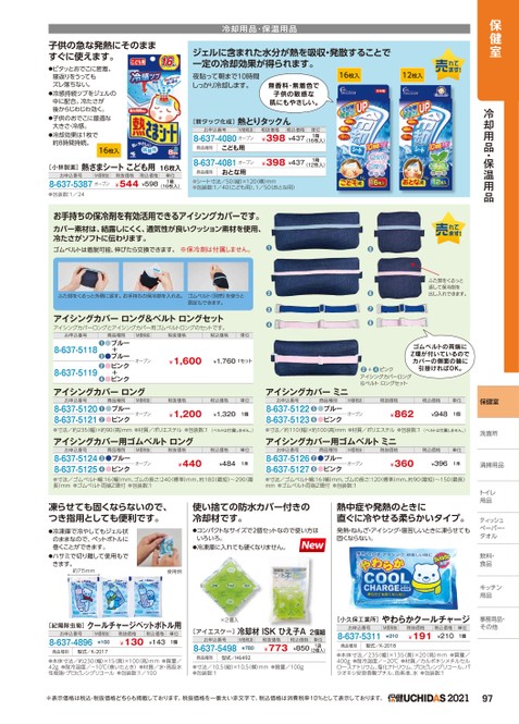 保健室冷却用品・保温用品保健室洗面所洗面所お手持ちの保冷剤を有効活用できるアイシングカバーです。カバー素材は、結露しにくく、通気性が良いクッション素材を使用、冷たさがソフトに伝わります。ゴムベルトは着脱可能、伸びたら交換できます。※保冷剤は付属しません。ふた部をくるっと外側に返す。お手持ちの保冷剤を入れる。ゴムベルト(別売)を使うと固定もできます。アイシングカバーロング&ベルトロングセットアイシングカバーロングとアイシングカバー用ゴムベルトロングのセットです。お申込番号商品種別M価税抜税抜価格税込価格単位8-637-51188-637-5119●●ブルー+❸●ブルー❷●ピンク+❹●ピンクオープン¥1,600¥1,7601セット●●●●●●●●ふた部をくるっと返して保冷剤を出し入れできます。ゴムベルトの両端にZ環が付いているのでカバーの側面の輪に引掛ければOK。+●ピンク●アイシングカバーロング&ベルトロングセット子供の急な発熱にそのまますぐに使えます。●ピタッとおでこに密着。寝返りをうってもズレ落ちない。●冷感持続ツブをジェルの中に配合。冷たさが後からじわじわ効く。●子供のおでこに最適な大きさ・冷感。●冷却効果は1枚で約8時間持続。16枚入[小林製薬]お申込番号熱さまシートこども用16枚入M価税抜8-637-5387オープン税抜価格税込価格¥544¥598単位1箱(16枚入)●包装数:1/24冷却用品・保温用品ジェルに含まれた水分が熱を吸収・発散することで一定の冷却効果が得られます。夜貼って朝まで10時間しっかり冷却します。無香料・無着色で16枚入12枚入子供の敏感な肌にもやさしい。[新タック化成]熱とりタックんお申込番号M価税抜8-637-4080オープン商品種別こども用8-637-4081オープン商品種別おとな用税抜価格税込価格¥398¥437単位1箱(16枚入)¥398¥4371箱(12枚入)●シート寸法/50縦)×120横)mm●包装数:1/40(こども用)、1/50(おとな用)¥360¥3961本清掃用品オープン●ブルー●ピンク●●商品種別M価税抜税抜価格税込価格単位お申込番号8-637-51268-637-5127商品種別M価税抜税抜価格税込価格単位¥440¥4841本オープン●ブルー●ピンク●●お申込番号8-637-51248-637-5125●寸法/ゴムベルト幅:16(幅)mm、ゴムの長さ:240標準)mm、約180最短)〜290(最長)mm●ゴムベルト両端Z環付●包装数:1●寸法/ゴムベルト幅:16(幅)mm、ゴムの長さ:120(標準)mm、約90(最短)〜150(最長)mm●ゴムベルト両端Z環付●包装数:1凍らせても固くならないので、つき指用としても便利です。使い捨ての防水カバー付きの冷却材です。●冷凍庫で冷やしてもジェル状のままなので、ペットボトルに巻くことができます。●ハサミで切り離して使用もできます。約75mm使用例●コンパクトなサイズで2個セットなので使い方はいろいろ。●冷凍庫に入れても硬くなりません。[紀陽除虫菊]クールチャージペットボトル用お申込番号8-637-4896M価税抜¥150商品種別型式/K-2017税抜価格¥130税込価格単位¥1431個●本体寸法/約230(幅)×15(奥)×100(高)mm●質量/42g●耐冷温度/-10℃(巻いたとき)●材質/水・高吸水性樹脂・プロピレングリコール●包装数:1/100×2個入[アイエスケー]冷却材ISKひえ子A2個組お申込番号8-637-5498M価税抜¥780商品種別型式/H6492税抜価格¥773税込価格¥850単位1袋(2個入)●寸法/10.5(縦)×10.5横)mm●質量/100g●包装数:1熱中症や発熱のときに直ぐに冷やせる柔らかいタイプ。発熱・ねんざ・アイシング・寝苦しいときに凍らせても固くならない。[小久保工業所]やわらかクールチャージお申込番号8-637-5311M価税抜¥210商品種別型式/K-2018税抜価格¥191税込価格単位¥2101個●本体寸法/235(幅)×135(奥)×20(高)mm●質量/400g●耐冷温度/-20℃●材質/カルボキシメチルセルロースナトリウム、塩化ナトリウム、プロピレングリコール、パラオキシ安息香酸ブチル、色素液、水●包装数:1トイレトイレ用品ティッシュッペーパー・ペーパー・タオルタオル飲料・食品キッチンキッチン用品用品事務用品・事務用品・その他他※表示価格は税込・税抜価格どちらも掲載しております。税抜価格を一番太い赤文字で、税込価格は消費税率10%として表示しております。202197商品種別M価税抜税抜価格税込価格単位¥862¥9481個オープン●ブルー●ピンク●●お申込番号8-637-51228-637-5123商品種別M価税抜税抜価格税込価格単位¥1,200¥1,3201個オープン●ブルー●ピンク●●お申込番号8-637-51208-637-5121●寸法/約235(幅)×約90(高)mm●材質/ポリエステル●包装数:1(ベルトは付属しません。)●寸法/約110(幅)×約100(高)mm●材質/ポリエステル●包装数:1(ベルトは付属しません。)アイシングカバー用ゴムベルトロングアイシングカバー用ゴムベルトミニアイシングカバーロングアイシングカバーミニ