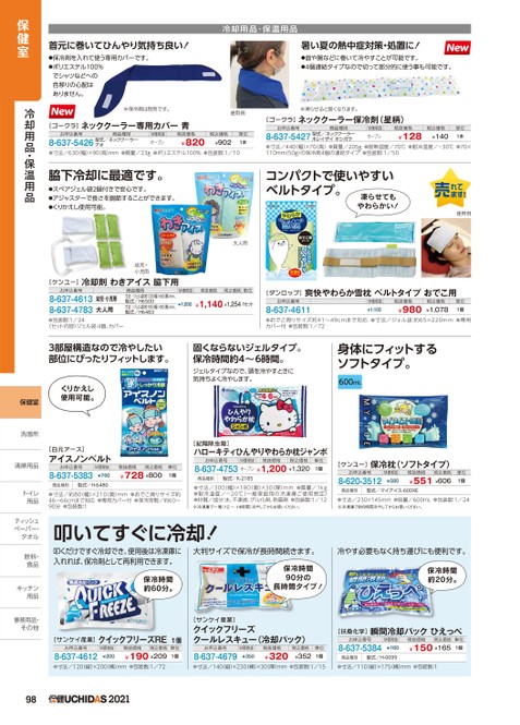 首元に巻いてひんやり気持ち良い!●保冷剤を入れて使う専用カバーです。●ポリエステル100%でシャツなどへの色移りの心配はありません。※保冷剤は別売です。[ゴークラ]ネッククーラー専用カバー青お申込番号商品種別8-637-5426型式/ネッククーラーアオM価税抜オープン税抜価格¥820税込価格¥902単位1本●寸法/630(幅)×90(高)mm●質量/23g●ポリエステル100%●包装数:1/10脇下冷却に最適です。●スペアジェル袋2個付きで安心です。●アジャスターで長さを調節することができます。●くりかえし使用可能。大人用幼児・小児用[ケンユー]お申込番号8-637-46138-637-4783冷却剤わきアイス脇下用幼児・小児用大人用商品種別寸法/ジェル袋:約120幅)×60奥)mm、型式/H6500寸法/ジェル袋:約185幅)×80奥)mm、型式/H6483M価税抜税抜価格税込価格単位¥1,200¥1,140¥1,2541セット冷却用品・保温用品暑い夏の熱中症対策・処置に!●首や腕などに巻いて冷やすことが可能です。●4個連結タイプなので切って部分的に使う事も可能です。使用例※凍らせると固くなります。[ゴークラ]ネッククーラー保冷剤(星柄)お申込番号商品種別8-637-5427型式/ネッククーラーホレイザイホシガラM価税抜オープン税抜価格¥128税込価格¥140単位1本●寸法/440幅)×70高)●質量/205g●耐熱温度/70℃●耐冷温度/-30℃●70×110mm(50g)の保冷剤4個の連結タイプ●包装数:1/50コンパクトで使いやすいベルトタイプ。凍らせてもやわらかい!使用例[ダンロップ]爽快やわらか雪枕ベルトタイプおでこ用お申込番号8-637-4611M価税抜¥1,100税抜価格¥980税込価格¥1,078単位1個●おでこ周りサイズ約41〜49cmまで対応●寸法/ジェル袋:約65×220mm●専用カバー付●包装数:1/72叩いてすぐに冷却!叩くだけですぐ冷却でき、使用後は冷凍庫に入れれば、保冷剤として再利用できます。大判サイズで保冷が長時間続きます。保冷時間約60分。保冷時間90分の長時間タイプ!保冷時間約20分。[サンケイ産業]クイックフリーズRE1個[サンケイ産業]クイックフリーズクールレスキュー(冷却パック)お申込番号8-637-4612M価税抜¥200税抜価格税込価格¥190¥209単位1個お申込番号8-637-4679M価税抜¥350税抜価格¥320税込価格¥352単位1個[扶桑化学]お申込番号8-637-5384瞬間冷却パックひえっぺM価税抜¥160税抜価格税込価格単位¥150¥1651個商品種別型式/H-0099●寸法/120縦)×200横)mm●包装数:1/72●寸法/140縦)×230横)×30厚)mm●包装数:1/15●寸法/110(縦)×175(横)mm●包装数:1982021●包装数:1/24〈セット内容〉ジェル袋:4個、カバー3部屋構造なので冷やしたい部位にぴったりフィットします。くりかえし使用可能。[白元アース]アイスノンベルトお申込番号8-637-5383M価税抜¥750税抜価格税込価格¥728¥800単位1個商品種別型式/H-6480●寸法/約80(幅)×210(奥)mm●おでこ周りサイズ約46〜66cmまで対応●専用カバー付●保冷時間/約60〜90分●包装数:1固くならないジェルタイプ。保冷時間約4〜6時間。ジェルタイプなので、頭を冷やすときに気持ちよく冷やします。身体にフィットするソフトタイプ。600mL[紀陽除虫菊]ハローキティひんやりやわらか枕ジャンボお申込番号M価税抜税抜価格税込価格8-637-4753オープン¥1,200¥1,320単位1個商品種別型式/K-2185●寸法/300(幅)×180(奥)×30(厚)mm●質量/1kg●耐冷温度/-20℃(一般家庭用の冷凍庫ご使用想定)●材質/成分:水、不凍液、ゲル化剤、防腐剤●包装数:1/12※冷凍庫で一晩(12〜14時間)冷やしてからお使いください。[ケンユー]保冷枕(ソフトタイプ)お申込番号8-620-3512M価税抜¥580税抜価格税込価格¥551¥606単位1個商品種別型式/マイアイス-600XE●寸法/230×145mm●容量/600mL●包装数:1/24※冷凍庫で約6時間冷やしてからお使いください。冷やす必要もなく持ち運びにも便利です。保健室冷却用品・保温用品保健室洗面所洗面所清掃用品清掃用トイレトイレ用品用品ティッシュテペーパー・ペーパー・タオルタオル飲料・飲料食品食キッチンキッチン用品用品事務用品・事務用品・その他その他
