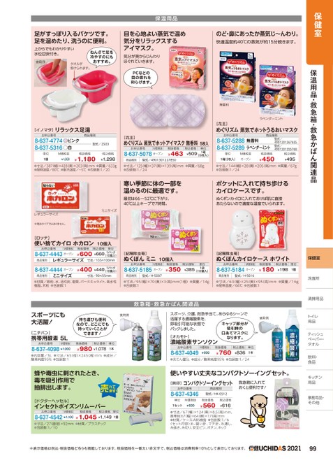 保健室保温用品・救急箱・救急かばん関連品保健室洗面所洗面所清掃用品トイレトイレ用品ティッシュッペーパー・ペーパー・タオルタオル飲料・食品キッチンキッチン用品用品事務用品・事務用品・その他他足がすっぽり入るバケツです。足を温めたり、洗うのに便利。上からでもわかりやすい水位目安付き。使用例ねんざで足を冷やすのにもおすすめ。タオルが掛けられます。保温用品目を心地よい蒸気で温め気分をリラックスするアイマスク。気分が奥からじんわりほぐれていきます。PCなどの目の疲れを和らげます。のど・鼻にあったか蒸気じ〜んわり。快適温度約40℃の蒸気が約15分続きます。無香料ラベンダーミント[花王]めぐりズム蒸気でホットうるおいマスクお申込番号商品種別8-637-5288無香料8-637-5289ラベンダーミント単位M価税抜1箱(3枚入)オープン税抜価格¥450型式/4901301367655型式/4901301355768税込価格¥495●寸法/387幅)×428(奥)×203(高)mm●質量/633g●耐熱温度/80℃●耐冷温度/-5℃●包装数:1/20●寸法/125幅)×37奥)×139高)mm●質量/68g●包装数:1/24●寸法/144(幅)×28(奥)×205(高)mm●質量/67g●包装数:1/24寒い季節に体の一部を温めるのに最適です。最初は66〜52℃に下がり、40℃以上キープで7時間。ポケットに入れて持ち歩けるカイロケースです。ぬくポンカイロに入れておけば肌に直接あたらないので適度な温度でいられます。レギュラーサイズ※貼るタイプではありません。ミニサイズ[ロッテ]使い捨てカイロホカロン10個入お申込番号M価税抜税抜価格税込価格単位8-637-4443オープン¥600¥6601パック(10個入)商品種別レギュラーサイズ寸法/135×100mm8-637-4444オープン商品種別ミニサイズ¥400¥4401パック(10個入)[紀陽除虫菊]ぬくぽんミニ10個入[紀陽除虫菊]ぬくぽんカイロケースホワイトお申込番号M価税抜8-637-5185オープン税抜価格¥350税込価格¥385単位1袋(10個入)お申込番号M価税抜8-637-5184オープン税抜価格¥180税込価格単位¥1981個寸法/90×55mm商品種別型式/H-5007商品種別型式/H-5016●材質/鉄粉、水、活性炭、塩類、バーミキュライト、吸水性樹脂、木粉●包装数:1●寸法/95(幅)×70(奥)×3(高)mm(1個)●質量/14g●包装数:1●寸法/63(幅)×25(奥)×95(高)mm●質量/16g●耐熱温度/66℃●包装数:1救急箱・救急かばん関連品スポーツにも大活躍![ニチバン]携帯用酸素5L使用例持ち運びも便利なので、どこにでも持っていくことができます!お申込番号M価税抜税抜価格税込価格8-637-4098¥1,000¥980¥1,078単位1本●内容量/5L●寸法/65(径)×245(高)mm●成分/酸素純度95%●包装数:1蜂や毒虫に刺されたとき、毒を吸引作用で抽排出します。[ドクターヘッセル]インセクトポイズンリムーバーお申込番号M価税抜税抜価格税込価格8-637-4542¥1,100¥1,045¥1,149単位1個●寸法/27直径)×92mm●材質/プラスチック●包装数:1/10スポーツ、介護、救急手当て、あらゆるシーンで活躍する濃縮酸素を、即吸引可能な状態でパックしました。キャップ部分が吸引時の[オカモト]濃縮酸素サンソクン口あてマスクになります。使用例お申込番号8-637-4049M価税抜¥800税抜価格¥760税込価格単位¥8361本●充てん量5L●成分/酸素純度95%●包装数:1/24使いやすい丈夫なコンパクトソーイングセット。[貝印]コンパクトソーイングセット救急箱に入れておくと便利です!お申込番号8-637-4346単位M価税抜1セット¥600商品種別型式/HK-0512税抜価格¥560税込価格¥616●寸法/67(幅)×124(奥)×8.5高)mm、携帯時:67(幅)×64(奥)×17高)mm●材質/ケース:ABS樹脂●包装数:1/6〈セット内容〉糸、縫い針、マチ針、糸通し、糸抜き、糸切り、安全ピン、ボタン、ホック商品種別型式/2503[花王]めぐりズム蒸気でホットアイマスク無香料5枚入単位1個M価税抜¥1,300税抜価格¥1,180税込価格¥1,298お申込番号M価税抜8-637-5078オープン税抜価格¥463商品種別型式/4901301227850税込価格¥509単位1箱(5枚入)[イノマタ]お申込番号リラックス足湯ピンク白●●8-637-47748-637-5316※表示価格は税込・税抜価格どちらも掲載しております。税抜価格を一番太い赤文字で、税込価格は消費税率10%として表示しております。202199