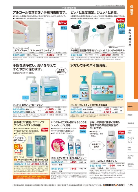 保健室手指消毒用品保健室洗面所洗面所清掃用品トイレトイレ用品ティッシュッペーパー・ペーパー・タオルタオル飲料・食品キッチンキッチン用品用品水なしで手軽に素早く消毒&洗浄できる保湿成分配合のジェルです。●保湿成分入り。●爽やかなユーカリの香り。持ち運びに便利!100mL[MTG]ドゥキレイ消毒ジェルお申込番号8-637-5396M価税抜¥580税抜価格¥560税込価格¥616単位1個事務用品・事務用品・その他他商品種別100mL型式/ZO-AC00A●容量/100mL●成分/ベンゼトニウム塩化物0.05%●添加物/エタノール、カルボキシビニルポリマー、グリチルリチン酸ニカリウム、トリエタノールアミン、ユーカリ油、濃グリセリン、精製水●指定医薬部外品●日本製●包装数:1※小児に使用される場合には、保護者の指導監督のもとに使用させること。目に入らないように注意すること。アルコールを含まない手指消毒剤です。ピッ!と温度測定。シュッ!と消毒。●アルコール過敏症の方にもお使いいただけるアルコールフリーの泡タイプ。●広範囲の微生物に対し消毒効果があります。●職場の新しい生活様式には、ピッとシュ!これ1台で温度測定と消毒ができます。●温度測定結果を液晶画面と音声で通知。※体温計ではありません。手指消毒用品※パッケージデザインは変更になる場合があります。150mLタンク容量1000mL※消毒液は別売です。ジェルタイプの消毒液は使えません。[シーテック]非接触型温度計・消毒機ピッとシュ!スタンダードモデルお申込番号8-637-5460商品種別型式/79990M価税抜オープン税抜価格¥30,000税込価格¥33,000単位1台●寸法/208幅)×96奥)×253高)mm●質量/800g本体のみ)●容量/1000mL●電源/単三乾電池×6本(別売)、USB-TypeC(ケーブルは付属しません)●包装数:1水なしで手のバイ菌消毒。使用例[ハクゾウメディカル]エレファフォームアルコールフリータイプお申込番号8-637-5099商品種別150mL型式/3102100M価税抜オープン税抜価格¥1,380税込価格¥1,518単位1本●容量/150mL●成分/ベンザルコニウム塩化物0.05%●指定医薬部外品●包装数:1/40手指を清浄にし、潤いを与えてすこやかに保ちます。保湿成分アロエエキスを配合。お手頃価格です。1L本体4.8L詰替用550mL本体4Lつめかえ用[アルタン]薬用ハンドローションお申込番号8-637-42288-637-4275商品種別M価税抜本体1L詰替用4.8Lオープン税抜価格¥1,480¥6,900税込価格¥1,628¥7,590単位1本●成分/エタノール、塩化ベンザルコニウム、アロエエキス●弱酸性●医薬部外品●非危険物●包装数:1/10本体)、1/4(詰替用)[ライオン]キレイキレイ泡で出る消毒液お申込番号商品種別8-637-2432本体、550mL8-637-5096つめかえ用、4LM価税抜オープン税抜価格¥815¥4,519税込価格¥896¥4,970単位1本●成分/エタノール、塩化ベンザルコニウム、他●指定医薬部外品●包装数:1/12本体)、1/3(つめかえ用)持ち運びに便利!ミニサイズアルコールミスト60本組。●手に擦り込む速乾性ミストタイプ。●手肌にやさしいうるおい成分配合。●パラベン・鉱物油不使用です。いつでも・どこでも・気になるところをシュッシュッ!と消毒。●トリガータイプの薬用消毒スプレー。●ツメやシワの間にも直接シュッ!●ベタつかず、スグにさらっと!200mL1プッシュ約0.16mL。沖縄・離島はサービス対象外[プロイオン]アルコール洗浄ハンドミスト携帯用60mL×60本お申込番号M価税抜税抜価格税込価格8-637-5413¥33,00¥27,000¥29,700(60本入)●寸法(1本あたり未使用時)/35(径)×120高)mm●容量(1本あたり)/60mL●1箱/60本入●成分/エタノール・水・グリセリン・ヒアルロン酸Na、アロエベラ葉エキス●化粧品(医薬部外品ではありません。)●包装数:1※火気厳禁。23箱(80L)以上を保管する場合は消防署への届出が必要です。単位1組※メーカー直送品です。返品はご容赦ください。上記商品は受注日から8営業日以内のお届けになります。本体詰替[花王]ビオレガード薬用消毒スプレーお申込番号M価税抜8-637-5437オープン税抜価格¥493税込価格単位¥5421個商品種別本体8-637-5438オープン¥446¥4901個商品種別付替●容量/200mL●成分/ベンザルコニウム塩化物0.05w/v%●添加物/エタノール、グリセリン、中鎖脂肪酸トリグリセリド、乳酸Na、ポリエチレングリコール●無香性●指定医薬部外品●包装数:1/24※表示価格は税込・税抜価格どちらも掲載しております。税抜価格を一番太い赤文字で、税込価格は消費税率10%として表示しております。103