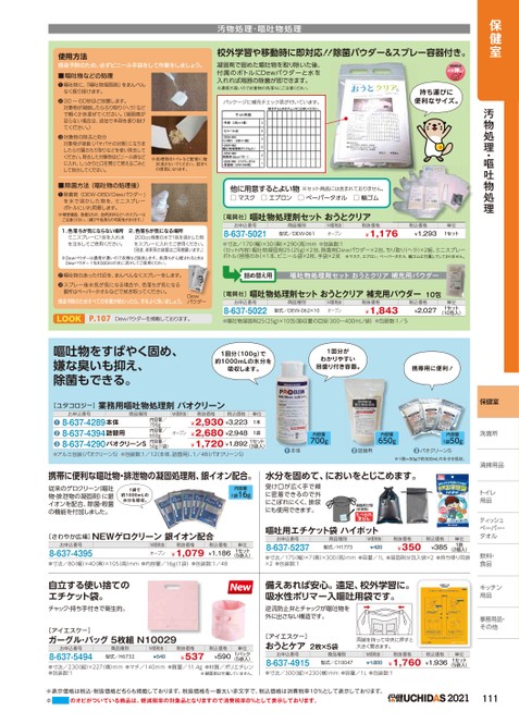 保健室汚物処理・嘔吐物処理保健室洗面所洗面所清掃用品トイレトイレ用品ティッシュッペーパー・ペーパー・タオルタオル飲料・食品キッチンキッチン用品用品事務用品・事務用品・その他他使用方法感染予防のため、必ずビニール手袋をして作業をしましょう。■嘔吐物などの処理❶嘔吐物に、「嘔吐物凝固剤」をまんべんなく振り掛けます。❷30〜60秒ほど放置します。対象物が凝固したらちり取り(ヘラ)などで軽くかき混ぜてください。(凝固感が足らない場合は、追加で本剤を振り掛けてください。)汚物処理・嘔吐物処理校外学習や移動時に即対応!!除菌パウダー&スプレー容器付き。凝固剤で固めた嘔吐物を取り除いた後、付属のボトルにDewパウダーと水を入れれば周囲の除菌が即できます。※濃度が高いので対象物の色落ちにご注意ください。パッケージに補充チェック表が付いています。持ち運びに便利なサイズ。❸対象物の除去と処分対象物が凝固(パサパサの状態)になりましたら付属のちり取りなどを使い除去してください。除去した対象物はビニール袋などに入れ、しっかりと口を閉じて燃えるごみとして処分してください。※処理物をトイレなど配管に絶対流さないでください。詰まりの原因になります。■除菌方法(嘔吐物の処理後)❶除菌剤(DEW-060/Dewパウダー)を水で溶かした物を、ミニスプレーボトルにいれ用意します。※精密機器、高価なもの、色柄衣料などへのスプレーはご注意ください。(錆びや色落ちの可能性があります。)1.色落ちが気にならない場所ミニスプレーに1包を入れ水を注水してご使用ください。2.色落ちが気になる場所200cc程度の水で1包を溶かした物をスプレーに入れてご使用ください。(別途、希釈用の容器はご用意願います。)※Dewパウダーは濃度が濃いので衣類など脱色します。色落ちが心配されるときはDewパウダー1包を500mlの水に溶かしてご使用ください。❷嘔吐物のあった付近を、まんべんなくスプレーをします。❸スプレー後水気が気になる場合や、色落ちが気になる箇所はペーパータオルなどで拭き取ってください。感染予防のためすべての作業が終わったら、手をよく洗いましょう。DewパウダーLOOKP.107Dewパウダーを掲載しております。他に用意するとよい物□マスク□エプロン□ペーパータオル□輪ゴム※セット商品には含まれておりません。[電興社]嘔吐物処理剤セットおうとクリアお申込番号8-637-5021商品種別型式/DEW-061M価税抜オープン税抜価格¥1,176税込価格¥1,293単位1セット●寸法/170(幅)×30(奥)×290(高)mm●包装数:1〈セット内容〉嘔吐物凝固剤25(25g)×2包、除菌剤Dewパウダー×2包、ちり取り(ヘラ)×2組、ミニスプレーボトル(容器のみ)×1本、ビニール袋×2枚、手袋×2双※マスク、エプロン、ペーパータオル、輪ゴムは付属してしておりません。詰め替え用嘔吐物処理剤セットおうとクリア補充用パウダー[電興社]嘔吐物処理剤セットおうとクリア補充用パウダー10包お申込番号8-637-5022商品種別型式/DEW-062×10M価税抜オープン税抜価格¥1,843税込価格単位¥2,0271セット(10包入)●嘔吐物凝固剤25(25g)×10包(吸収量の目安:300〜400mL/袋)●包装数:1/5嘔吐物をすばやく固め、嫌な臭いも抑え、除菌もできる。1回分(100g)で約1000mLの水分を吸収します。1回分がわかりやすい目盛り付き容器。携帯用に便利![ユタコロジー]業務用嘔吐物処理剤パオクリーン内容量700g内容量650g内容量1袋50g●本体●詰替用●パオクリーンS※1袋=50gで約500mLの水分を吸収。水分を固めて、においをとじこめます。受け口が広く手で頬に密着できるので外にこぼれにくく、排尿にも使用できます。嘔吐用エチケット袋ハイポットお申込番号8-637-5237商品種別型式/H1773M価税抜¥420(2個入)●寸法/175幅)×7奥)×300高)mm●容量/1L●凝固剤分包入袋×2●持ち帰り用袋×2●包装数:1税抜価格¥350税込価格¥385単位1袋M価税抜オープン内容量/700g内容量/650g内容量/50g1袋)単位1本税抜価格税込価格¥2,930¥3,223¥2,680¥2,948¥1,720¥1,8921セット(3袋入)1袋お申込番号商品種別8-637-4289本体8-637-4394詰替用8-637-4290パオクリーンS●●●●アルミ包装(パオクリーンS)●包装数:1/12(本体、詰替用)、1/48パオクリーンS)携帯に便利な嘔吐物・排泄物の凝固処理剤、銀イオン配合。従来のゲロクリーン(嘔吐物・排泄物の凝固剤)に銀イオンを配合、除菌・殺菌の機能を付加しました。1袋で約1000mLの水分を吸収。内容量1袋16g[さわやか広場]NEWゲロクリーン銀イオン配合お申込番号8-637-4395M価税抜オープン税抜価格¥1,079税込価格¥1,186単位1セット(5袋入)●寸法/80(幅)×40(奥)×105(高)mm●内容量/16g(1袋)●包装数:1/48自立する使い捨てのエチケット袋。チャック・持ち手付きで衛生的。備えあれば安心。遠足、校外学習に。吸水性ポリマー入嘔吐用袋です。逆流防止弁とチャックが嘔吐物を外に出さない構造です。[アイエスケー]ガーグル・バッグ5枚組N10029お申込番号8-637-5494商品種別型式/H6732M価税抜¥540税抜価格¥537税込価格単位¥5901パック(5袋入)●寸法/230(縦)×227横)mm●マチ/140mm●質量/11.4g●材