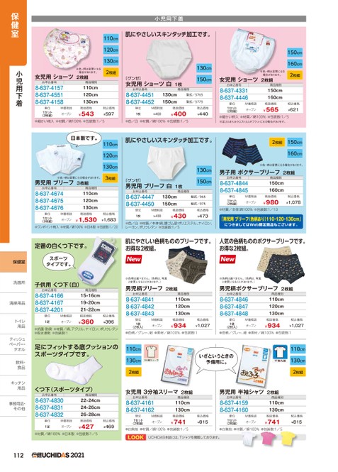 110cm120cm130cm2枚組小児用下着肌にやさしいスキンタッチ加工です。[グンゼ]女児用ショーツ白1枚130cm150cmお申込番号8-637-44518-637-4452商品種別130cm150cm型式/5765型式/5775女児用ショーツ2枚組※色・柄は変更になる場合があります。お申込番号8-637-41578-637-45518-637-4158商品種別110cm120cm130cm単位1セット(2枚組)M価税抜オープン税抜価格¥543税込価格¥597単位1枚M価税抜¥400税抜価格¥400税込価格¥440●細かい柄入●材質/綿100%●包装数:1/5●色/白●材質/綿100%●包装数:1/5150cm160cm2枚組女児用ショーツ2枚組※色・柄は変更になる場合があります。お申込番号8-637-43318-637-4446商品種別150cm160cm単位1セット(2枚組)M価税抜オープン税抜価格¥565税込価格¥621●細かい柄入●材質/綿100%●包装数:1/5※足ゴムまたはウエストゴムがフラットになる場合があります。2枚組150cm160cm110cm120cm130cm3枚組日本製です。※色・柄は変更になる場合があります。男児用ブリーフ3枚組お申込番号8-637-46748-637-46758-637-4676商品種別110cm120cm130cm単位1セット(3枚組)M価税抜オープン税抜価格¥1,530税込価格¥1,683●ワンポイント柄入●材質/綿100%●日本製●包装数:1/20定番の白くつ下です。スポーツタイプです。子供用くつ下(白)お申込番号8-637-41668-637-41678-637-4201商品種別15-16cm19-20cm21-22cm単位1足M価税抜オープン税抜価格¥360税込価格¥396●抗菌・防臭●材質/綿、アクリル、ナイロン、ポリウレタン●吸水速乾●包装数:1足にフィットする底クッションのスポーツタイプです。肌にやさしいスキンタッチ加工です。[グンゼ]男児用ブリーフ白1枚130cm150cmお申込番号8-637-44478-637-4450商品種別130cm150cm型式/965型式/975単位1枚M価税抜¥430税抜価格¥430税込価格¥473●色/白●材質/本体:綿、腰ゴム部:ポリエステル、ナイロン、レーヨン、ポリウレタン●包装数:1/5※色・柄は変更になる場合があります。男子用ボクサーブリーフ2枚組お申込番号8-637-48448-637-4845商品種別150cm160cm単位1セット(2枚組)M価税抜オープン税抜価格¥980税込価格¥1,078●材質/本体:綿100%●包装数:1/10「男児用ブリーフ(色柄あり)110・120・130cm」につきましてはWeb限定商品もございます。肌にやさしい色柄もののブリーフです。お得な2枚組。人気の色柄もののボクサーブリーフです。お得な2枚組。※色柄は選べません。(色柄は、写真と変更になることがあります。)男児柄ブリーフ2枚組お申込番号8-637-48418-637-48428-637-4843商品種別110cm120cm130cm※色柄は選べません。(色柄は、写真と変更になることがあります。)男児柄ボクサーブリーフ2枚組お申込番号8-637-48468-637-48478-637-4848商品種別110cm120cm130cm単位1袋(2枚入)M価税抜オープン税抜価格¥934税込価格¥1,027単位1袋(2枚入)M価税抜オープン税抜価格¥934税込価格¥1,027●色柄/グレー、紺●素材/綿100%●包装数:1●色柄/グレー、紺●素材/綿100%●包装数:1110cm130cm2枚組いざというときの予備用に。110cm130cm2枚組くつ下(スポーツタイプ)お申込番号8-637-48308-637-48318-637-4832商品種別22-24cm24-26cm26-28cm単位1足M価税抜オープン税抜価格¥427税込価格¥469●材質/綿100%●日本製●包装数:1/5女児用3分袖スリーマ2枚組男児用半袖シャツ2枚組お申込番号8-637-41618-637-4162商品種別110cm130cmお申込番号8-637-41598-637-4160商品種別110cm130cm単位1セット(2枚組)M価税抜オープン税抜価格¥741●白無地●材質/綿100%●包装数:1/5税込価格¥815単位1セット(2枚組)M価税抜オープン税抜価格¥741●白無地●材質/綿100%●包装数:1/5税込価格¥815LOOKUCHIDAS本誌には、Tシャツを掲載しております。1122021保健室小児用下着保健室洗面所洗面所清掃用品清掃用トイレトイレ用品用品ティッシュテペーパー・ペーパー・タオルタオル飲料・飲料食品食キッチンキッチン用品用品事務用品・事務用品・その他その他