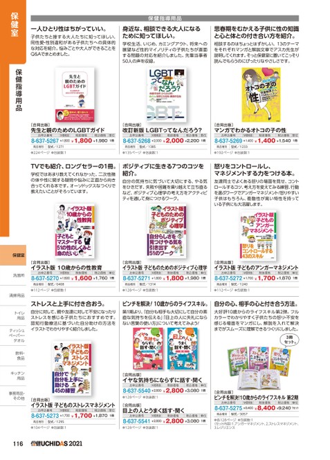 保健指導用品一人ひとり性はちがっていい。子供たちと接する大人たちに知ってほしい、同性愛・性別違和がある子供たちへの具体的な対応を紹介。悩みごとや大人ができることをQ&Aでまとめました。身近な、相談できる大人になるために知ってほしい。学校生活、いじめ、カミングアウト、将来への展望など性的マイノリティの子供たちが直面する問題の対応を紹介しました。先輩当事者50人の声を収録。思春期をむかえる子供に性の知識と心と体との付き合い方を紹介。相談するのはちょっとはずかしい、13のテーマをそれぞれマンガと解説文章でアスカ先生が説明してくれます。そっと保健室に置いてこっそり読んでもらうのにぴったりなやさしさです。[合同出版]先生と親のためのLGBTガイドお申込番号M価税抜税抜価格税込価格8-637-5267¥1,800¥1,800¥1,980単位1冊[合同出版]改訂新版LGBTってなんだろう?お申込番号M価税抜税抜価格税込価格単位8-637-5268¥2,000¥2,000¥2,2001冊[合同出版]マンガでわかるオトコの子の性お申込番号M価税抜税抜価格税込価格8-637-5269¥1,400¥1,400¥1,540単位1冊商品種別型式/1271●224ページ●包装数:1商品種別型式/1385●135ページ●包装数:1商品種別型式/1233●192ページ●包装数:1TVでも紹介、ロングセラーの1冊。学校ではあまり教えてくれなかった、二次性徴の体や性に関する疑問や悩みに正面から向き合ってくれる本です。オーソドックスなつくりで教えたいことがそろっています。ポジティブに生きる7つのコツを紹介。自分の気持ちに気づいて大切にする、やる気をひきだす、失敗や困難を乗り越えて立ち直るなど、ポジティブ心理学の考え方をアクティビティを通して身につけるワーク。怒りをコントロールし、マネジメントする力をつける本。友達同士でよくある怒りの場面を見せ、コントロールするコツ、考え方を変えてみる練習、行動を選ぶワークでアンガーマネジメント!怒りやすい子供はもちろん、衝動性が高い特性を持っている子供にも大活躍します。[合同出版]イラスト版10歳からの性教育お申込番号M価税抜税抜価格税込価格8-637-5270¥1,600¥1,600¥1,760[合同出版]イラスト版子どものためのポジティブ心理学お申込番号M価税抜税抜価格税込価格単位8-637-5271¥1,800¥1,800¥1,9801冊単位1冊[合同出版]イラスト版子どものアンガーマネジメントお申込番号M価税抜税抜価格税込価格単位8-637-5272¥1,700¥1,700¥1,8701冊商品種別型式/0408●112ページ●包装数:1商品種別型式/1314●128ページ●包装数:1商品種別型式/1240●112ページ●包装数:1ストレスと上手に付き合おう。自分に対して、親や友達に対して不安になったりストレスを感じる子供たちにおすすめです。認知行動療法に基づいた自分助けの方法をイラストでわかりやすく紹介しました。ピンチを解決!10歳からのライフスキル。第1期より、「自分も相手も大切にして自分の素直な気持ちを伝える」「目上の人に失礼にならない言葉の使い方」について考えてみよう!自分の心、相手の心と付き合う方法。大好評10歳からのライフスキル第2弾。フルカラーでわかりやすく子供たちの怒り・不安を感じる場面をマンガにし、解説を入れて解決までがスムーズに理解できるつくりにしました。3冊セット。保健室保健指導用品保健室洗面所洗面所清掃用品清掃用トイレトイレ用品用品ティッシュテペーパー・ペーパー・タオルタオル飲料・飲料食品食キッチンキッチン用品用品事務用品・事務用品・その他その他[合同出版]イヤな気持ちにならずに話す・聞くお申込番号M価税抜税抜価格税込価格8-637-5540¥2,800¥2,800¥3,080●128ページ●包装数:1[合同出版]目上の人とうまく話す・聞くお申込番号M価税抜税抜価格税込価格8-637-5541¥2,800¥2,800¥3,080●128ページ●包装数:1[合同出版]ピンチを解決!10歳からのライフスキル第2期お申込番号M価税抜税抜価格税込価格単位8-637-5275¥8,400¥8,400¥9,2401セット商品種別型式/3057●各128ページ●包装数:1〈セット内容〉1.アンガーマネジメント、2.ストレスマネジメント、3.レジリエンス単位1冊単位1冊[合同出版]イラスト版子どものストレスマネジメントお申込番号M価税抜税抜価格税込価格単位8-637-5273¥1,700¥1,700¥1,8701冊商品種別型式/1295●104ページ●包装数:11162021