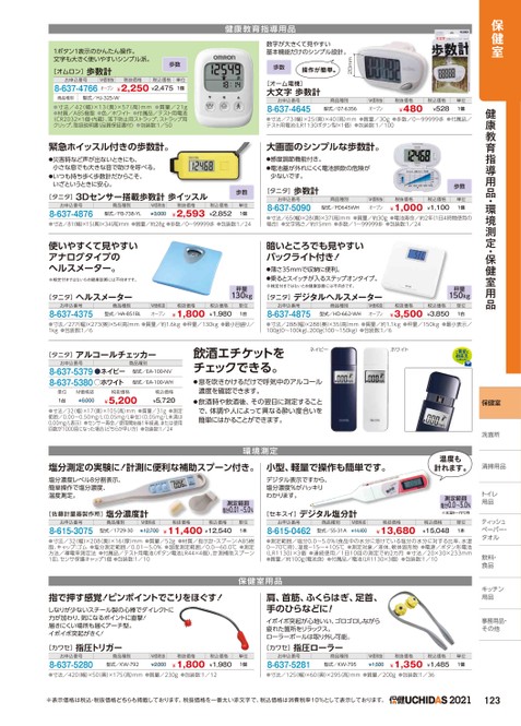 保健室健康教育指導用品・環境測定・保健室用品保健室洗面所洗面所お申込番号8-637-4766M価税抜オープン税抜価格税込価格¥2,250¥2,475単位1個商品種別型式/HJ-325-W●寸法/42(幅)×13(奥)×57(高)mm●質量/21g●材質/ABS樹脂●色/ホワイト●付属品/テスト用電池(CR2032×1個・内蔵)、落下防止用ストラップ、ストラップ用クリップ、取扱説明書(品質保証書付)●包装数:1/50緊急ホイッスル付きの歩数計。●災害時など声が出ないときにも、小さな息でも大きな音で助けを呼べる。●いつも持ち歩く歩数計だからこそ、いざというときに安心。[タニタ]3Dセンサー搭載歩数計歩イッスルお申込番号8-637-4876商品種別型式/FB-738-YLM価税抜¥3,000税抜価格¥2,593税込価格¥2,852歩数単位1個●寸法/81幅)×15(奥)×34高)mm●質量/約28g●歩数/0〜99999歩●包装数:1/24[オーム電機]大文字歩数計お申込番号8-637-4645商品種別型式/07-6356M価税抜オープン税抜価格¥480税込価格¥528単位1個●寸法/73(幅)×25(奥)×40(高)mm●質量/30g●歩数/0〜99999歩●付属品/テスト用電池(LR1130ボタン型×1個)●包装数:1/100大画面のシンプルな歩数計。●感度調節機能付き。●電池蓋が外れにくく電池誤飲の危険が少ないです。[タニタ]歩数計お申込番号8-637-5090商品種別型式/PD645WHM価税抜オープン税抜価格¥1,000税込価格¥1,100歩数単位1個●寸法/65幅)×28(奥)×37高)mm●質量/約30g●電池寿命/約2年(1日4時間使用の場合)●文字高さ/約15mm●歩数/1〜99999歩●包装数:1/24使いやすくて見やすいアナログタイプのヘルスメーター。※検定付きではないため健康診断には不向きです。[タニタ]ヘルスメーター暗いところでも見やすいバックライト付き!●薄さ35mmで収納に便利。●乗るとスイッチが入るステップオンタイプ。※検定付きではないため健康診断には不向きです。[タニタ]デジタルヘルスメーター秤量130kg秤量150kgお申込番号8-637-4375商品種別型式/HA-851BLM価税抜オープン税抜価格¥1,800税込価格¥1,980単位1台お申込番号8-637-4875商品種別型式/HD-662-WHM価税抜オープン税抜価格¥3,500税込価格¥3,850単位1台●寸法/277幅)×273奥)×54高)mm●質量/約1.6kg●秤量/130kg●最小目盛り/1kg●包装数:1/6●寸法/288幅)×288奥)×35高)mm●質量/約1.1kg●秤量/150kg●最小表示/100g0〜100kg)、200g100〜150kg)●包装数:1/620mm歩数操作が簡単。数字が大きくて見やすい基本機能だけのシンプル設計。健康教育指導用品1ボタン1表示のかんたん操作。文字も大きく使いやすいシンプル派。[オムロン]歩数計歩数[タニタ]アルコールチェッカーお申込番号8-637-5379●ネイビー8-637-5380●ホワイト商品種別型式/EA-100-NV型式/EA-100-WH単位1台M価税抜¥6,000税抜価格¥5,200税込価格¥5,720●寸法/32(幅)×17(奥)×105(高)mm●質量/31g●測定範囲/0.00〜0.50mg/L0.05mg/L単位)0.05mg/L未満は0.00mg/L表示)●センサー寿命/使用開始後1年経過、または使用回数が1000回になった場合(どちらか早い方)●包装数:1/24飲酒エチケットをチェックできる。ネイビーホワイト●息を吹きかけるだけで呼気中のアルコール濃度を確認できます。●飲酒時や飲酒後、その翌日に測定することで、体調や人によって異なる酔い度合いを簡単にはかることができます。環境測定塩分測定の実験に!計測に便利な補助スプーン付き。小型、軽量で操作も簡単です。温度も計れます。清掃用品塩分濃度レベル8分割表示、簡単操作で塩分濃度、温度測定。[佐藤計量器製作所]塩分濃度計お申込番号8-615-3075商品種別型式/1729-30M価税抜¥12,700デジタル表示ですから、塩分濃度%がハッキリわかります。[セキスイ]デジタル塩分計測定範囲塩分0.01〜5.0%測定範囲塩分0.0〜5.0%※水温0〜70℃時税抜価格税込価格¥11,400¥12,540単位1本お申込番号8-615-0462商品種別型式/SS-31AM価税抜¥14,400税抜価格¥13,680税込価格¥15,048単位1本●寸法/32幅)×208奥)×16(厚)mm●質量/52g●材質/指示計・スプーン:ABS樹脂、キャップ:ゴム●塩分測定範囲/0.01〜5.0%●温度測定範囲/0.0〜60.0℃●測定方法/導電率測定法●付属品/テスト用電池(ボタン電池LR44×4個)、計測補助スプーン1皿、センサ保護キャップ1個●包装数:1/10●測定範囲/塩分0.0〜5.0%(食品中の水分に溶けている塩分の水分に対する比率、水温0〜70℃時)、温度-15〜+105℃●測定対象/液体、軟体固形物●電源/ボタン形電池(LR1130)×3個●連続使用/1日10回の測定で約2カ月●寸法/20×30×233mm●質量/約100g電池含)●付属品/電池(LR1130×3個)●包装数:1/10保健室用品指で押す感覚!ピンポイントでこりをほぐす!しなりが少ないスチール製の心棒でダイレクトに力が加わり、気になるポイントに直撃!届きにくい場所も届くアーチ型。イボイボ突起がきく![カワセ]指圧トリガー肩、首筋、ふくらはぎ、足首、手のひらなどに!イボイボ突起が心地いい、ゴロゴロしながら疲れた箇所をリラックス。ローラーボールは取り外し可能。[カワセ]指圧ローラーお申込番号8-637-5280商品種別型式/KW-792M価税抜¥2,000税抜価格¥1,800税込価格¥1,980単位1個●寸法/420(幅)×50(奥)×175(高)mm●質量/230g●包装数:1/12お申込番号8-637-5281商品種別型式/KW-795M価税抜¥1,500税抜価格¥1,350税込価格¥1,485単