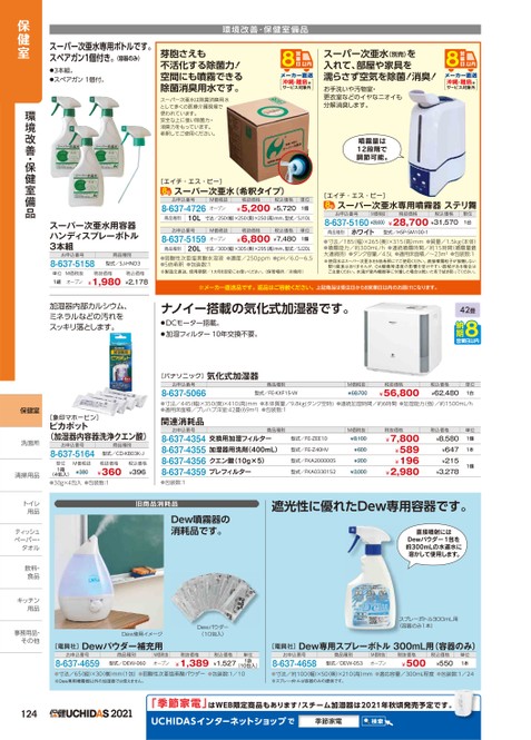 環境改善・保健室備品スーパー次亜水専用ボトルです。スペアガン1個付き。(容器のみ)●3本組。●スペアガン1個付。芽胞さえも不活化する除菌力!空間にも噴霧できる除菌消臭用水です。スーパー次亜水は除菌消臭用水として多くの医療介護現場で使われています。安全な上に強い除菌力・消臭力をもっています。希釈してご使用ください。沖縄・離島はサービス対象外スーパー次亜水(別売)を入れて、部屋や家具を濡らさず空気を除菌!消臭!お手洗いや汚物室・更衣室などのイヤなニオイも分解消臭します。沖縄・離島はサービス対象外[エイチ・エス・ピー]スーパー次亜水(希釈タイプ)お申込番号8-637-4726M価税抜オープン税抜価格税込価格¥5,200¥5,720単位1個商品種別10L寸法/250(幅)×250(奥)×250高)mm、型式/SJ10Lお申込番号8-637-5159M価税抜オープン税抜価格税込価格¥6,800¥7,480単位1個商品種別20L寸法/300(幅)×305(奥)×295高)mm、型式/SJ20L●弱酸性次亜塩素酸水溶液●濃度/250ppm●pH/6.0〜6.5●5倍希釈●包装数:1※製造元直送、使用期限/1カ月を目安にお使いください。(保管場所/冷暗所)噴霧量は12段階で調節可能。[エイチ・エス・ピー]スーパー次亜水専用噴霧器ステリ舞お申込番号M価税抜8-637-5160¥29,000税抜価格税込価格¥28,700¥31,570単位1台商品種別ホワイト型式/HSP-SM100-1●寸法/185(幅)×265(奥)×315高)mm●質量/1.5kg本体)●噴霧能力/約300mL/h●連続噴霧時間/約15時間(噴霧量最大連続時)●タンク容量/4.5L●適用床面積/〜23m²●包装数:1※使用水はスーパー次亜水を5倍希釈にてご使用ください。直接噴霧粒子が接触しない限り腐食はありませんが、OA機機等湿度の影響を受けやすい器械がある場合はご注意ください。水滴が室内機器等に付着した場合は乾いた布で拭き取ってください。※メーカー直送品です。返品はご容赦ください。上記商品は受注日から8営業日以内のお届けになります。ナノイー搭載の気化式加湿器です。●DCモーター搭載。●加湿フィルター10年交換不要。42畳[パナソニック]気化式加湿器お申込番号8-637-5066商品種別型式/FE-KXF15-WM価税抜¥68,700税抜価格¥56,800税込価格¥62,480単位1台●寸法/445(幅)×350(奥)×410(高)mm●本体質量/9.8kg(タンク空時)●連続加湿時間/約6時間●加湿能力(強)/約1500mL/h●適用床面積/プレハブ洋室:42畳(69m²)●包装数:1関連消耗品お申込番号商品種別交換用加湿フィルター8-637-43548-637-43558-637-43568-637-4359プレフィルタークエン酸(10g×5)加湿器用洗剤(400mL)型式/FE-ZEE10型式/FE-Z40HV型式/FKA2000005M価税抜¥8,100¥600¥200型式/FKA0330152¥3,000税抜価格¥7,800¥589¥196¥2,980税込価格¥8,580¥647¥215¥3,278単位1個1本1個スーパー次亜水用容器ハンディスプレーボトル3本組お申込番号8-637-5158商品種別型式/SJ-HND3単位M価税抜1組オープン税抜価格¥1,980税込価格¥2,178加湿器内部カルシウム、ミネラルなどの汚れをスッキリ落とします。[象印マホービン]ピカポット(加湿器内容器洗浄クエン酸)お申込番号8-637-5164商品種別型式/CD-KB03K-J単位1箱M価税抜¥380(4包入)●30g×4包入●包装数:1税抜価格¥360税込価格¥396保健室環境改善・保健室備品保健室洗面所洗面所清掃用品清掃用トイレトイレ用品用品ティッシュテペーパー・ペーパー・タオルタオル飲料・飲料食品食キッチンキッチン用品用品事務用品・事務用品・その他その他●包装数:1旧商品消耗品Dew噴霧器の消耗品です。Dew使用イメージDewパウダー(10包入)遮光性に優れたDew専用容器です。直接噴射にはDewパウダー1包を約300mLの水道水に溶かして使用します。スプレーボトル300mL用(容器のみ1本)[電興社]Dew専用スプレーボトル300mL用(容器のみ)お申込番号8-637-4658商品種別型式/DEW-053M価税抜オープン税抜価格¥500税込価格¥550単位1本●寸法/約100幅)×50奥)×210高)mm●適応容量/300mL程度●包装数:1/24※スプレーボトルは容器のみの提供です。[電興社]Dewパウダー補充用お申込番号8-637-4659商品種別型式/DEW-060M価税抜オープン税抜価格¥1,389税込価格¥1,527単位1袋(10包入)●寸法/65縦)×30横)mm(1包)●弱酸性次亜塩素酸パウダー●包装数:1/10※Dew専用噴霧器以外の加湿器では使えません。1242021「季節家電」はWEB限定商品もあります!スチーム加湿器は2021年秋頃発売予定です。UCHIDASインターネットショップで季節家電