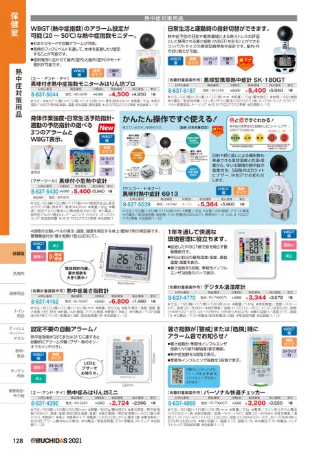 WBGT(熱中症指数)のアラーム設定が可能(20〜50℃)な熱中症指数モニター。●おまかせモードで自動アラームが可能。●両側のフックにベルトを通して、本体を装着したり固定●使用場所に合わせて屋内(室内)と屋外(室外)のモードすることが可能です。選択が可能です。熱中症対策用品日常生活と運動時の指針切替ができます。熱中症予防の目安や暑熱環境による熱ストレスの評価として使用される暑さ指数(WBGT)を計ることができるコンパクトサイズの黒球型携帯熱中症計です。屋内・外で切り替えが可能。WBGT値携帯タイプストラップ付三脚穴有WBGT値携帯タイプ三脚穴有[エー・アンド・デイ]黒球付き熱中症指数モニターみはりん坊プロお申込番号8-637-5044商品種別型式/AD-5698M価税抜¥5,000税抜価格¥4,500税込価格¥4,950単位1個●寸法/本体:67.5(幅)×47.5(奥)×114.5(高)mm、黒球:直径40mm●質量/90g●表示項目/WBGT(熱中症指数)、温度、相対湿度、黒球温度●JISB7922クラス2準拠●包装数:1/10[佐藤計量器製作所]黒球型携帯熱中症計SK‐180GTお申込番号8-637-5187商品種別型式/8313-00M価税抜¥6,000税抜価格¥5,400税込価格¥5,940単位1個●寸法/60(幅)×25(奥)×122(高)mm●質量/70g(電池含む)●材質/ABS樹脂●付属品/取扱説明書、コイン形リチウム電池(CR2032)×2個、ネックストラップ、カラビナ、ベルト装着部品、キーリング●JISB7922クラス2準拠●包装数:1/10かんたん操作ですぐ使える!見えているボタンを押すだけ。〈監修日本気象協会〉色と音ですぐわかる!熱中症の危険性を5段階のLEDライトとブザー、WBGTでお知らせ。身体作業強度・日常生活予防指針・運動の予防指針の選べる3つのアラームとWBGT表示。WBGT値携帯タイプストラップ付使用例有[マザーツール]黒球付小型熱中症計三脚穴お申込番号M価税抜税抜価格税込価格8-637-5430¥6,000商品種別型式/MT-876¥5,400¥5,940●寸法/65(幅)×25(奥)×117(高)mm(黒球突き出し部およびバンド通し含まず)、黒球:Φ40mm●質量/80g●電源/単四アルカリ電池×2(電池寿命:約6ヶ月)●付属品/単四形アルカリ電池x2、アームバンド、カラビナ、ネックストラップ、取扱説明書●JISB7922クラス2準拠●包装数:1日射や照り返しによる輻射熱も考慮できる黒球温度と気温・湿度から、今いる環境の熱中症の危険性を、5段階のLEDライトとブザー、WBGTでお知らせします。WBGT値携帯タイプ単位1個[ケンコー・トキナー]黒球付熱中症計6913お申込番号8-637-5039商品種別型式/143742M価税抜オープン税抜価格¥5,364税込価格¥5,900単位1個●寸法/50(幅)×26(奥)×116(高)mm●質量/40g●材質/ABS樹脂、アクリル樹脂●付属品/取扱説明書、保証書、テスト用電池CR2032×1、携帯用ケース●JISB7922クラス2準拠●包装数:1/20WBGT値壁掛け卓上1年を通して快適な環境管理に役立ちます。●設定したWBGT値で音を鳴らす警報機能付き。●今日と前日の最高温度・湿度、最低温度・湿度を表示。●暑さ指数を5段階、季節性インフルエンザ3段階のバーで表示。4段階の注意レベルの表示、温度、湿度を測定する卓上・壁掛け用の測定器です。警報機能付き(暑さ指数)(音とLEDにて)。約165mm電波時計内蔵。暑さ指数を大きく表示!WBGT値壁掛け卓上電波受信約225mm[佐藤計量器製作所]熱中症暑さ指数計お申込番号8-637-4152商品種別型式/SK-160GTM価税抜¥8,500税抜価格¥6,800税込価格¥7,480単位1個●寸法/約225(幅)×25奥)×165(高)mm●質量/約500g●表示項目/温度、湿度、暑さ指数、日付、時刻●材質/ABS樹脂、アクリル樹脂●壁掛け●卓上●付属品/テスト用電池(R6P単三マンガン乾電池×3個)、取扱説明書1冊●包装数:1/10[佐藤計量器製作所]デジタル温湿度計お申込番号8-637-4770商品種別型式/PC-7980GTIM価税抜¥3,800税抜価格¥3,344税込価格¥3,678単位1個●寸法/100(幅)×17(奥)×120(高)mm●質量/143g●測定範囲/温度:-9.9〜+50℃、湿度:20〜90%RH●測定精度/温度:±1.0℃(10〜40℃)、±1.5℃(左記以外)、湿度:±5%RH(20〜30℃、40〜70%RH)、±8%RH(左記以外)●最小目盛り/温度:0.1℃、湿度:1%●付属品/テスト用電池(単四乾電池×2個)●取扱説明書●包装数:1/12WBGT値携帯タイプストラップ付暑さ指数が「警戒」または「危険」時にアラーム音でお知らせ!●暑さ指数計・季節性インフルエンザ指数・UVI(紫外線強度)表示機能。●熱中症指数を5段階で表示。●季節性インフルエンザ指数を3段階で表示。55mm50mm内蔵カレンダーにより、11〜3月は季節性インフルエンザ対応になります。設定不要の自動アラーム!熱中症指数が28℃または31℃に達すると自動的にアラーム作動(ブザー音のオン/オフスイッチ付き)。携帯タイプストラップ付WBGT値壁掛け卓上LEDとブザーでお知らせ。[エー・アンド・デイ]熱中症みはりん坊ミニ[佐藤計量器製作所]パーソナル快適チェッカーお申込番号8-637-4392商品種別型式/AD-5689M価税抜¥2,900税抜価格¥2,724税込価格¥2,996単位1個●寸法/50(幅)×14奥)×55(高)mm●質量/約25g電池含む)●表示項目/熱中症指数(WBGT)、温度、湿度(測定項目:温度、湿度)●表示範囲/熱中症指数:0〜60℃(最小表示1℃)●壁掛け●卓上●携帯タイプ●電源/CR2032形リチウム電池1個●電池寿命/約3カ月(アラーム動