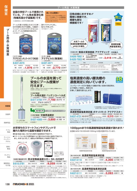 プール用品・水質検査全国の学校プールで使用されている、プール用水質浄化剤(有機系高分子凝集剤)です。〈公益財団法人日本学校保健会推薦〉使い方は簡単!添付のピンでカプセルの表面に小穴を1〜3カ所開け、プール水循環装置内のヘアキャッチャーなどのバスケットに投入するだけ。プールの濁りの原因となるミクロ単位の浮遊微小粒子を凝集し、ろ過器のフィルターにかかりやすくすることによって、プールの透明度を高めます。※砂ろ過式のプール向き。藻やバクテリアに対し、強力に作用します。※砂ろ過式のプール向き。日常点検におすすめ!!簡単に検査でき、廃棄も楽な検査紙です!100枚入水泳プールの低濃度遊離残留塩素、pHなどの測定。3HC高濃度遊離残留塩素測定。[エタニ産業]アクアピル2レギュラータイプ(浄化剤)[エタニ産業]アクアピル5(除藻剤)お申込番号8-637-4570お申込番号8-637-4571単位1個M価税抜¥2,000税抜価格税込価格¥1,976¥2,173単位1個M価税抜¥2,800税抜価格税込価格¥2,770¥3,047●250〜300トンのプールに対して2個使用。約5〜7日間効力を保ちます。●正味容量/136mL●包装数:1/14●120トン前後の水に対して1個使用。約5〜7日間除藻効果を維持します。●正味容量/136mL●包装数:1/14プールの水温を測って安全にプール授業が行えます。※製造上、内部はメッキされておりませんがご使用上は問題ありません。※水中に入れたままにしないでください。[久松計量器]プール用水温計ペッテンコーヘル式お申込番号M価税抜税抜価格税込価格8-617-4194¥8,700¥7,700¥8,470単位1本商品種別アルコールタイプ●長さ/360mm●測定範囲/-10〜+50℃●0.5℃目盛り●黄銅枠付●包装数:1※使用後は水洗いをしてください。詰め替え用プール用水温計ペッテンコーヘル式用[久松計量器]交換用温度計プール用水温計ペッテンコーヘル式お申込番号M価税抜税抜価格税込価格8-637-4569¥4,000¥3,800¥4,180単位1本●包装数:1お手持ちのスマートフォンやタブレットで離れた場所から温度を確認できます。●気温・地温・水温、さまざまな場所の温度測定が可能です。●スマートフォンなどの携帯端末1台で最大8台の本体と接続が可能です。また、本体1台に対して、複数台の携帯端末との接続が可能です。温度センサー部[佐藤計量器製作所]防水型無線温度ロガーSK-320BT※お手持ちの端末に専用アプリ(無料)をインストールする必要があります。お申込番号8-615-3781商品種別型式/8440-00M価税抜¥9,500税抜価格税込価格¥9,259¥10,184単位1台●寸法/68径)×98(高)mm●質量/163g電池含む)●材質/ケース:ABS樹脂、ラバー(ケース上部)TPE樹脂、温度センサー部(感温部):SUS304●防水性能/JISC0920IPX5準拠●測定精度/±1.0℃(0.0〜40.0℃)、±1.5℃(-15.0〜-0.1℃、40.1〜65.0℃)、±2.0℃(それ以外)●通信距離/約30m※未接続でもデータの記録は継続します。●測定範囲/-15.0〜+65.0℃(アルカリ電池使用時)/-25.0〜+65.0℃(リチウム電池使用時)●電源/単三乾電池×3個●無線規格/Bluetooth4.0(周波数:2402〜2480MHz)●付属品/テスト用電池(単三乾電池×3個)、取扱説明書●包装数:1/10※本器は電波法適合製品です。日本国内専用で海外でのご使用はできません。簡易水質検査紙アクアチェック100枚入M価税抜税抜価格税込価格単位[日産化学]お申込番号8-620-70028-620-7003型式アクアチェック3商品種別プール低濃度遊離残留塩素測定、pH高濃度遊離残留塩素測定3HC項目¥3,500測定範囲¥3,418¥3,7591個(100枚入)低濃度遊離残留塩素pHMアルカリ度0/0.2/0.4/0.7/1.0/2.0/3.0/5.0/10.0mg/L5.8/6.5/7.0/7.5/8.0/8.60/20/40/80/120/180mg/LアクアチェックHC高濃度遊離残留塩素0/25/50/100/200/400/600mg/L主な用途水泳プールの低濃度遊離残留塩素、pHなどの測定高濃度遊離残留塩素測定●包装数:1/3〈公益財団法人日本学校保健会推薦〉塩素濃度の高い腰洗槽の濃度測定に向いています。コンパレーターの示す濃度より濃度が高い溶液の測定時は、水で希釈して測定し、希釈分を計算して濃度を割り出します。※次亜塩素酸ナトリウム6%を300倍に希釈すると200mg/L、500倍に希釈で120mg/L、1000倍で60mg/Lです。[あけぼの化学]高濃度残留塩素測定器ポケットキットアクアテスターお申込番号8-637-4731AS-CH10測定範囲/10/25/50/100/150/250mg/L¥9,800¥9,310¥10,2411セット商品種別M価税抜税抜価格税込価格単位〈セット内容〉ケース、コンパレーター、試験管(ふた付)×1本、かくはん棒×1本、高濃度残留●寸法/ケース:116幅)×42(奥)×64(高)mm、コンパレーター:43×18×86mm●包装数:1塩素測定試薬GP×30錠、HR×30錠1000ppmまでの高濃度残留塩素濃度が測れます!比色板には50・150・300・600・1000mg/Lの色の目安が付いています。高濃度残留塩素測定器高濃度残留塩素測定試薬[あけぼの化学]高濃度残留塩素測定器お申込番号8-637-5110商品種別型式/AI-HR-KITM価税抜¥5,500税抜価格税込価格単位¥4,300¥4,7301セット●寸法/外箱:55(幅)×21(奥)×113(高)mm、比色板:45幅)×3奥)×95高)mm●包装数:1/10〈セット内容〉比色板×1枚、試験管×1本、測定試薬40回分(20回×2本)、計量スプーン×1本[あけぼの化学]高濃度残留塩素測定試薬お申込番号8-637-5111商品種別型式/H