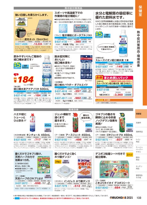 保健室熱中症対策用品・環境改善保健室洗面所洗面所清掃用品トイレトイレ用品ティッシュッペーパー・ペーパー・タオルタオル飲料・食品キッチンキッチン用品用品事務用品・事務用品・その他他強い日差しを柔らかくします。使用例熱中症対策用品スポーツや高温度下での作業時の塩分補給に!●熱中症対策用の携帯しやすいプラスチック容器入りです。●3〜5mmの粒状の塩が、約1000粒入っています。水分と電解質の吸収率に優れた飲料水です。WHO(世界保健機構)と米国小児科学会が発表した経口補給水液の推奨組成に合致。低浸透(ハイポトニック)なので身体への吸収に優れています。生地は風が通りやすくなっています。[シンコー]遮光ネット(5m×3m)お申込番号M価税抜税抜価格税込価格単位8-617-4556オープン¥13,334¥14,6671個[マルニ]塩分補給にポータブルソルト軽減税率対象品容量500mLお申込番号M価税抜8-637-4730オープン税抜価格¥380税込価格¥410単位1個商品種別内容量/25g型式/23102●寸法/5×3m●質量/1.3kg●遮光率/約65%●材質/ネット:ポリエチレン、周囲:ポリエステル、ハトメ:アルミ(ハトメ穴50cm間隔※ひもは付いていません。)●包装数:1/7●寸法/70(幅)×17(奥)×40高)mm●原材料/海塩●包装数:1/36※コップ1杯(約200mL)の水に対し、本品10〜15粒(約250〜375mg)を噛まずに水と一緒に飲み込んでください。シトラス風味(柑橘系)で飲みやすい。飲みやすいりんご風味の経口補水液です!容量500mL公益財団法人日本学校保健会推薦1本¥184税抜(税込¥198)[味の素]経口補水液アクアソリタ500mL軽減税率対象品お申込番号8-637-4748M価税抜¥190税抜価格¥184税込価格単位¥1981本●内容量/500mL●原材料/砂糖、ぶどう糖、塩化Na、クエン酸Na、塩化K、香料、クエン酸、リン酸K、塩化Ca、塩化Mg、甘味料(アスパルテーム・L-フェニルアラニン化合物、アセスルファムK)●包装数:1/24脱水症対策においしい経口補水液を!●粉末タイプなので、用途に応じて自分で濃度調節ができます。●少量パック(1包6g)で携帯に便利。●長期間の保存が可能です。6g×3包入[五洲薬品]経口補水パウダーダブルエイド軽減税率対象品お申込番号8-637-4916M価税抜¥300商品種別6g×3包入8-637-4917¥1,000税抜価格¥297税込価格¥320単位1袋(3包入)型式/343025¥982¥1,0601袋(10包入)商品種別6g×10包入型式/34303●粉末タイプ●包装数:1環境改善[赤穂化成]スムーズイオン経口補水液1本軽減税率対象品お申込番号8-637-5067M価税抜¥150税抜価格¥149税込価格単位¥1601本●内容量/500mL●原材料/ブドウ糖、果糖、塩、乳酸Na、クエン酸、塩化K、香料、リン酸Na、グルタミン酸Na、硫酸Mg、甘味料(スクラロース)●包装数:1/24お得まとめ買いパック[赤穂化成]※1組単位申込。スムーズイオン経口補水液1組(24本入)軽減税率対象品お申込番号8-637-5189商品種別型式/552820単位1組(24本入)税抜価格¥3,360税込価格¥3,628LOOKP.189スポーツ飲料を掲載しております。ハエや蚊にシューッとひと吹き!!ジェット噴射で遠くまで届きます。目・鼻・のどに優しい低刺激・無香料。450mL防除用医薬部外品優れた殺虫効果。450mL防除用医薬部外品[大日本除虫菊]キンチョール450mLお申込番号8-637-9209M価税抜¥820税抜価格¥717税込価格単位¥7881本[アース製薬]アースジェット450mLお申込番号M価税抜8-637-9192オープン税抜価格¥498税込価格単位¥5471本●寸法/65(径)×219(高)mm●質量/399g●容量/450mL●有効成分/ピレスロイド(d-T80-フタルスリン、d-T80-レスメトリン)●対象害虫/ハエ成虫、蚊成虫、ゴキブリ、ノミ、ナンキンムシ、イエダニ、マダニ●包装数:1/30●寸法/66(径)×230(高)mm●質量/270g●容量/450mL●有効成分/ピレスロイド(d-T80-フタルスリン、d-T80-レスメトリン)●対象害虫/ハエ成虫、蚊成虫、ゴキブリ、ノミ、ナンキンムシ、イエダニ●包装数:1/30置くだけでゴキブリ除け。天然ハーブの力で効果は1カ月。【ご使用時の目安】●引出し:各段に1個。●食器棚:各段に1〜3個。※本品は駆除を目的としたものではありません。[アース製薬]天然ハーブのゴキブリよけ防除用医薬部外品お申込番号8-637-9572M価税抜オープン税抜価格税込価格¥698¥767単位1箱(4個入)商品種別型式/4901080219015●成分/天然ハッカ油●対象害虫/ゴキブリ●包装数:1/6置くだけでよく効くホウ酸ダンゴ!24個入防除用医薬部外品45mmmm54[オカモト]インピレスホウ酸ダンゴお申込番号8-637-7279M価税抜オープン税抜価格¥512税込価格単位¥5631セット(24個入)●パッケージ寸法/155×245×15mm●質量/98g●包装数:1/48ゴキブリの動きを瞬時に止める秒速ノックダウン効果を実現!450mL便利なすき間用ノズルがついて、狭いすき間に潜むゴキブリの駆除が一段と容易に。[アース製薬]ゴキジェットプロ450mL医薬部外品防除用お申込番号8-637-9575M価税抜オープン税抜価格¥837税込価格単位¥9201本●寸法/73(幅)×60(奥)×230(高)mm●質量/410g●容量/450mL●有効成分/イミプロトリン(ピレスロイド系)0.4755w/v%(原液量105mL)●対象害虫/ゴキブリ●包装数:1/30※本品は使い切ってから捨ててください。デコボコ粘着シート付きで組立簡単。2パック[アース製薬]ごきぶりホ