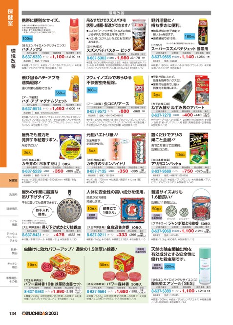 環境改善吊るすだけでスズメバチを誘引し捕獲・撃退ができます!野外活動に!持ち歩きに便利。●スズメバチ・アシナガバチなどの脅威から子供たちの安全を守ります!●ハエ・蛾・コガネムシなどにも効果があります。[SHIMADA]スズメバチバスタービッグお申込番号M価税抜税抜価格税込価格8-637-5303¥1,980¥1,980¥2,178単位1本●容量/500mL薬剤+水を加えた場合)●成分/食品由来成分、アルコール他●有効期限/約30日(使用環境により変化します。)●対象虫種/スズメバチ、アシナガバチ、ハエ、蛾、コガネムシなど●包装数:1/122ウェイノズルであらゆる不快害虫を駆除。300mL[アース製薬]虫コロリアースお申込番号8-637-9573M価税抜オープン税抜価格¥880税込価格単位¥9681本商品種別型式/4901080066503●容量/300mL●成分/d-T80-プラレトリン(ピレスロイド系)、ピレトリン、エトフェンプロックス(ピレスロイド系)●対象虫種/不快害虫(ムカデ・毛虫・クモなど多種)●包装数:1/20●無風状態の水平噴射で最大3m届きます。●連続噴射で約15秒。180mL[イカリ]※ハチの巣の駆除用ではありません。スーパースズメバチジェット携帯用お申込番号M価税抜税抜価格税込価格8-637-9565¥1,200¥1,140¥1,254単位1本商品種別型式/H2691●容量/180mL●成分/d-d-T80-プラレトリン●対象虫種/スズメバチ●包装数:1●死骸が目にふれず、処理も簡単なハウス型。●業務用粘着剤で、高い捕獲力を発揮します。2枚入[カモ井加工紙]ねずみ捕りねずみ男のアパートお申込番号8-637-7278M価税抜¥580税抜価格税込価格単位¥400¥4401セット(2枚入)●パッケージ寸法/245幅)×120(奥)×45(高)mm●材質/台紙部:紙・ポリエチレン、粘着部:潤滑油基油・石油樹脂●包装数:1/30元祖ハエトリ紙!!安全無害な粘着剤を使用。5本入[カモ井加工紙]カモ井のリボンハイトリお申込番号8-637-7135M価税抜¥390商品種別型式/161289税抜価格¥350税込価格¥385単位1袋(5本入)置くだけでアリの巣ごと全滅!!あちこち置けて効果的。効果は3カ月。12個入[大日本除虫菊]アリ用コンバットαお申込番号8-637-9569M価税抜オープン税抜価格¥750商品種別型式/4987115351158税込価格¥825単位1箱(12個入)携帯に便利なサイズ。※蜂に向けて噴射しながら逃げてください。※約10秒間連続噴射可能です。※遠足、野外活動の際に小型なので、救急バッグなどに入れて携帯が可能です。100mL[住化エンバイロメンタルサイエンス]ハチノックSお申込番号8-637-5320M価税抜オープン商品種別型式/117602税抜価格税込価格¥1,100¥1,210単位1本●容量/100mL●成分/d・d-T80-ブラレトリン●対象虫種/アシナガバチ他●包装数:1/10飛び回るハチ・アブを速効駆除!遠くの巣も駆除できる!550mL[アース製薬]ハチ・アブマグナムジェット保健室環境改善お申込番号8-637-9574M価税抜オープン税抜価格税込価格¥1,463¥1,609単位1本商品種別型式/4901080237019●容量/550mL●成分/フタルスリン、モンフルオロトリン、ビフェントリン(ピレスロイド系)●対象虫種/アシナガバチ、クマバチ、ミツバチ、アブ、ブユ(ブヨ)、クモ、ケムシ、ムカデ、カメムシ●包装数:1/20屋外でも威力を発揮する粘着リボン。吊るすだけ!3枚入[カモ井加工紙]カモ井の「吊るすだけ」3枚入お申込番号8-637-5239M価税抜¥390商品種別型式/161418税抜価格¥350税込価格¥385単位1袋(3枚入)保健室●寸法/ハエ取り紙:55幅)×550(長)mm●質量/65g●包装数:1/80●リボン長/700mm●付属品/画鋲(1本につき1個)●包装数:1/160●効果/3カ月●成分/フィプロニル●対象虫種/アリ、ヒアリ、アルゼンチンアリ●包装数:1/40屋外の作業に最適な吊り下げタイプ。平らに置いても使用できます。お手入れ簡単。※かとり線香はついていません。※ジャンボタイプには使えません。人体に安全性の高い成分を使用。効果が約7時間持続します。10巻入防除用医薬部外品線香立て1個入り。[大日本除虫菊]吊り下げ式かとり線香皿[大日本除虫菊]金鳥渦巻き香10巻入お申込番号M価税抜税抜価格税込価格単位8-637-9431オープン¥523●材質/本体:スチール●質量/81g●包装数:1/30¥4761個お申込番号M価税抜8-637-9211オープン税抜価格¥333税込価格¥366単位1箱(10巻入)●質量/163g●10巻入●線香立て1個入●包装数:1/10●質量/1.3kg●50巻入●包装数:1/12洗面所洗面所清掃用品清掃用トイレトイレ用品用品ティッシュテペーパー・ペーパー・タオルタオル飲料・飲料食品食キッチンキッチン用品用品事務用品・事務用品・その他その他虫除けに効力パワーアップ!通常の1.5倍厚い線香!防除用医薬部外品10巻入30巻入[児玉兄弟商会]パワー森林香10巻携帯防虫器セット[児玉兄弟商会]パワー森林香30巻入お申込番号M価税抜税抜価格税込価格単位8-637-9563オープン¥1,990¥2,189(10巻入)●質量/450g●燃焼時間/約6時間〜6時間半●対象虫種/ユスリカ、チョウバエ、アブ●包装数:1/241セット1342021お申込番号8-637-9564M価税抜オープン税抜価格税込価格¥1,680¥1,848(30巻入)●質量/630g●燃焼時間:約6時間〜6時間半●対象虫種/ユスリカ、チョウバエ、アブ●包装数:1/24単位1箱普通サイズよりも1.6倍長い!効果は11時間以上。50巻入防除用医薬部外品[フマ