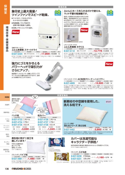 ●寸法/300幅)×501(奥)×218(高)mm●質量/2.2kg●電源/AC100V(50/60Hz)●消費電力/600W●集じん方式/サイクロン方式●集じん容量/0.2L●振動回数/毎分14,000回●コード長さ/約4m●付属品/使い捨てフィルター25枚(1枚は本体にセット済)●包装数:1/6選べる3色。ピンク保健室備品新素材の中空綿を使用した、洗える枕です。抗アレルギー象印史上最大風量!ツインファンでスピード乾燥。●マットもホースもなしだから、セットも片付けも簡単。●角度調整ノズルで急ぎの衣類や靴の乾燥にも便利。●収納しやすいコンパクト設計。環境改善ふとんにホースを入れるだけで使える、マット不要の乾燥機です。設定した時刻の30分前からあたためを開始し、設定時刻までにふとんをあたためる予約タイマー付きです。立体ノズルのフラップを立ち上げることで、ふとんの中に空間をつくり、より広い範囲に温風を届けることができます。[象印マホービン]ふとん乾燥機スマートドライお申込番号8-637-5424商品種別型式/RF-FA20-WAM価税抜税抜価格税込価格オープン¥17,800¥19,580単位1台●寸法/230(幅)×150(奥)×360(高)mm●質量/3.8kg●コード長さ/2m●消費電力/905/910W(50/60Hz)●包装数:1強力にゴミをかきとるパワーヘッドで吸引力がさらにアップ。高感度ダニちりセンサー搭載。LEDランプでダニ・ちりなどの量をお知らせするので、効率よくお掃除することができます。使用例[アイリスオーヤマ]ふとん乾燥機カラリエお申込番号8-637-5112商品種別型式/FK-C3-WPM価税抜税抜価格税込価格オープン¥12,778¥14,055単位1台●寸法/160(幅)×140奥)×360高)mm●質量/1.8kg●材質/ABS樹脂、ポリプロピレン●電源電圧/AC100V(50/60Hz共用)●消費電力/560W●タイマー/15・30・45・60・75・90・120・180分●コード長さ/約2m●安全装置/温度センサー、サーモスタット、温度ヒューズ●付属品/くつ乾燥アタッチメント●包装数:1/3[アイリスオーヤマ]AC布団クリーナーハイパワーお申込番号8-637-4809商品種別型式/IC-FAC4M価税抜オープン税抜価格税込価格¥15,900¥17,490単位1台保健室環境改善・保健室備品保健室洗面所洗面所通気性に優れ、高さが安定します。清掃用品清掃用クリームトイレトイレ用品用品ティッシュテペーパー・ペーパー・タオルタオル飲料・飲料食品食キッチンキッチン用品用品事務用品・事務用品・その他その他ファスナー付きなので、外カバーは洗えます。ブルー商品種別●クリーム●ブルー●ピンク枕カバーお申込番号8-637-47368-637-47378-637-4738商品種別●クリーム●ブルー●ピンクベッド枕お申込番号8-637-47338-637-47348-637-4735単位M価税抜1個オープン税抜価格税込価格¥3,690¥4,059単位M価税抜1枚オープン税抜価格税込価格¥1,045¥1,149●寸法/630(幅)×430(奥)mm●材質/中身:テトロン綿●包装数:1●寸法/630(幅)×430(奥)mm●材質/綿100%●日本製●包装数:1表生地に防ダニ加工を施しています!中材には通気性の良いパイプを使用しています。※カバーは付属しません。[モリシタ]パイプ枕お申込番号M価税抜税抜価格税込価格8-637-4881オープン¥1,480¥1,628ドラえもん©Fujiko-Pro,shogakukan,TV-Asahi,Shin-eiandADK単位1個[ロリアン寝装]洗えるシリーズ洗える枕お申込番号8-637-4463M価税抜オープン税抜価格¥3,800税込価格¥4,180単位1個●寸法/630(幅)×430奥)mm●質量/0.6kg●材質/表地:ポリエステル65%・綿35%、中綿:ポリエステル(ホロフィルⅡ)100%●抗アレルギー●包装数:1カバーは洗濯可能なキャラクター子供枕!幼児・低学年の頭・首に負担のかかりにくい子供用サイズです。※デザインが変更になる場合があります。[モリシタ]こども枕お申込番号8-637-52308-637-5231商品種別M価税抜税抜価格税込価格単位ドラえもんリラックマオープン¥1,160¥1,2761個●寸法/500(幅)×350奥)mm●質量/800g●材質/ポリエステル80%、綿20%●防ダニ加工●包装数:1/10リラックマ©2016San-X●寸法/約390(幅)×約280(奥)mm●質量/200g●材質/カバー:綿100%、側・中材:ポリエステル100%●包装数:1/301362021