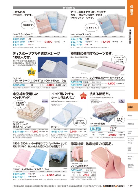 保健室保健室備品保健室洗面所洗面所清掃用品トイレトイレ用品ティッシュッペーパー・ペーパー・タオルタオル飲料・食品キッチンキッチン用品用品事務用品・事務用品・その他他一枚ものの平らなシーツです。日本製です。保健室備品マットレス部まですっぽりかぶせてカバー(厚み28cmまで)できるワンタッチシーツです。日本製です。[音部]フラットシーツ[音部]ボックスシーツお申込番号8-637-47398-637-47408-637-4741商品種別M価税抜税抜価格税込価格単位●白●ブルー●ピンクオープン¥3,200¥3,5201枚お申込番号8-637-47428-637-47438-637-4744商品種別M価税抜税抜価格税込価格単位●白●ブルー●ピンクオープン¥3,420¥3,7621枚●寸法/1500×2500mm●材質/綿100%●包装数:1●寸法/1000×2000×280mm●材質/綿100%●包装数:1ディスポーザブル片面防水シーツ10枚入です。コンパクトに折りたたまれており、使用時にはスムーズに広けられます。カットしての使用も可能です。検診時に使用するシーツです。吸水、防水加工済みです。約30cmごとにミシン目が入っています。[イワツキ]メディカルシーツ#1018TW100×180cm10枚お申込番号8-637-5290商品種別白M価税抜オープン税抜価格¥3,000税込価格単位¥3,3001セット(10枚入)ホワイトピンク[ハクゾウメディカル]ハクゾウ検診用シーツロールタイプお申込番号8-637-52628-637-5263商品種別M価税抜税抜価格税込価格単位●ホワイト型式/1780194●ピンク型式/3037085オープン¥1,500¥1,6501本●寸法/1枚あたり1000×1800mm●材質/レーヨン不織布●包装数:1●寸法/370幅)mm×36(長)m●質量/660g●包装数:1/20中空綿を使用したベッドパッド。ずれ止めベルト付きです。ベッド用パッドやシーツ代わりに!抗アレルギー表面がパイル地でさっぱりしています。※色・柄が変更になる場合がございます。洗える綿毛布。アレルギー体質の生徒も安心です。※ご使用の初期時、濃色の衣服などにケバが付くことがあります。ピンク綿100%[ロリアン寝装]洗えるシリーズ洗えるベッドパッド敷パッドお申込番号M価税抜8-637-4464オープン税抜価格¥7,500税込価格単位¥8,2501個お申込番号M価税抜8-637-4747¥3,800コーナーバンド付き。税抜価格¥3,600税込価格単位¥3,9601枚●寸法/1000(幅)×2000(奥)mm●材質/側地:ポリエステル・綿、中綿:ポリエステル(ホロフィルⅡ)100%●抗アレルギー●洗濯ネット付●包装数:1●寸法/1000(幅)×2000(長さ)mm●表地/パイル:綿100%、ベース:ポリエステル100%●中綿:ポリエステル100%●ズレ防止コーナーバンド付●包装数:1ブルー綿毛布[内外毛織]お申込番号8-637-23698-637-2370日本製です。商品種別●ピンク●ブルー単位1枚M価税抜¥12,000税抜価格¥9,980税込価格¥10,978●寸法/1400×2000mm●材質/綿100%●包装数:11500×2500mmの一枚布なのでベッドカバーとしてだけではなく、ちょっとした目かくしにも便利です。節電対策、防寒対策の必需品。ピンクサックス[CREAR]ベッドカバー(マルチカバー)使用例お申込番号8-637-52108-637-5211商品種別●ピンク●サックスM価税抜税抜価格税込価格単位オープン¥4,500¥4,9501枚●寸法/約1500×約2500mm●質量/440g●材質/ポリエステル65%、コットン35%●包装数:1使用例[オーミケンシ]フリースひざ掛けお申込番号8-637-4415商品種別型式/2202単位1枚M価税抜オープン税抜価格¥762税込価格¥838●寸法/700×1000mm●質量/175g●材質/ポリエステル100%●包装数:1/40※表示価格は税込・税抜価格どちらも掲載しております。税抜価格を一番太い赤文字で、税込価格は消費税率10%として表示しております。137