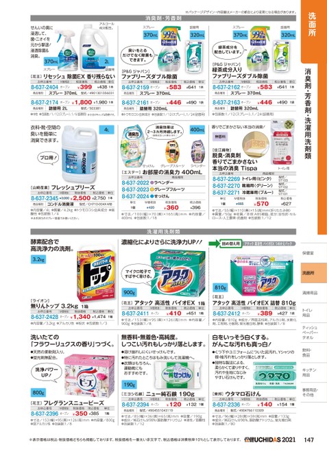 洗面所消臭剤・芳香剤・洗濯用洗剤類保健室室洗面所清掃用品トイレトイレ用品ティッシュッペーパー・ペーパー・タオルタオル飲料・食品キッチンキッチン用品用品事務用品・事務用品・その他他せんいの奥に浸透して、菌・ニオイを元から撃退!浸透除菌&消臭。370mLスプレーアルコール成分配合。2L詰替用[花王]リセッシュ除菌EX香り残らないお申込番号8-637-2404M価税抜オープン商品種別スプレー370mL税抜価格税込価格単位¥399¥4381本型式/4901301356031消臭剤・芳香剤※パッケージデザイン・内容量はメーカーの都合により変更になる場合があります。スプレー370mL詰替用320mLスプレー370mL詰替用320mL臭いをとるだけでなく除菌もできます。[P&Gジャパン]ファブリーズダブル除菌お申込番号M価税抜8-637-2159オープン税抜価格¥583税込価格単位¥6411本商品種別スプレー370mL緑茶成分を配合しています。[P&Gジャパン]緑茶成分入りファブリーズダブル除菌お申込番号M価税抜8-637-2162オープン税抜価格¥583税込価格単位¥6411本商品種別スプレー370mL8-637-2174オープン商品種別詰替用2L¥1,800¥1,9801本型式/5033818-637-2161オープン¥446¥4901袋商品種別詰替用320mL8-637-2163オープン¥446¥4901袋商品種別詰替用320mL●中性●包装数/1/12(スプレー)、1/6詰替用)※小分けキャップは別売です。●トウモロコシ由来成分●包装数:1/12スプレー)、1/24(詰替用)●包装数:1/12スプレー)、1/24(詰替用)4L衣料・靴・空間の臭いを簡単に消臭できます。プロ用![山崎産業]フレッシュブリーズお申込番号M価税抜税抜価格税込価格8-637-2345¥3,000¥2,500¥2,750単位1本商品種別コンドル消臭液型式/CH710-004X-MB●内容量/4L●質量/4.2kg●トウモロコシ由来成分●弱酸性●包装数:1/4※お手持ちのスプレー容器でお使いください。酵素配合で高洗浄力の洗剤。3.2kg消臭効果は2〜3カ月持続します。(使用状況により異なります。)400mL香りでごまかさない本当の消臭!無香料[住江織物]脱臭・消臭剤香りでごまかさない本当の消臭Tispaお申込番号商品種別8-637-2269トイレ用(ピンク)8-637-22708-637-2271靴箱用(グリーン)冷蔵庫用(ブルー)単位M価税抜トイレ用型式/ST103型式/ST102型式/ST101税込価格税抜価格¥5701個¥665¥627●寸法/55(幅)×110(奥)×15(高)mm(折りたたみ時)●質量/50g●材質/本体:ABS樹脂、成分:活性炭・セルロース・人工酵素・抗菌剤●包装数:1/12せっけんグレープフルーツラベンダー[エステー]お部屋の消臭力400mLお申込番号商品種別8-637-2022●ラベンダー8-637-2023●グレープフルーツ8-637-2024●せっけん単位1個M価税抜¥420税抜価格¥360税込価格¥396●寸法/100(幅)×70(奥)×165(高)mm●内容量/400mL●包装数:1/18洗濯用洗剤類濃縮化によりさらに洗浄力UP!!詰め替え用アタック高活性バイオEXつめかえパックマイクロ粒子ですばやく溶ける。900g単位1箱[花王]アタック高活性バイオEX1箱お申込番号8-637-2411M価税抜オープン税抜価格¥410税込価格単位¥4511箱●寸法/153(幅)×95(奥)×126(高)mm●内容量/900g●包装数:1/8810g[花王]アタック高活性バイオEX詰替810gお申込番号8-637-2412M価税抜オープン税抜価格¥389税込価格単位¥4271袋●内容量/810g●成分/界面活性剤、アルカリ剤、水軟化剤、工程剤、分散剤、蛍光増白剤、酵素●包装数:1/8[ライオン]無りんトップ3.2kg1箱お申込番号M価税抜税抜価格税込価格8-637-2428オープン¥1,340¥1,474●内容量/3.2kg●アルカリ性●粉状●包装数:1/3洗いたての「フラワーリュクスの香り」つづく。無香料・無着色・高純度。しつこい汚れもしっかり落とします。白をいっそう白くする。がんこな汚れも真っ白!●天然の柔軟剤入り。●蛍光剤無配合。洗浄パワーUP!800g[花王]フレグランスニュービーズお申込番号M価税抜8-637-2396オープン税抜価格税込価格¥350¥385単位1箱●寸法/153(幅)×95奥)×126(高)mm●内容量/800g●弱アルカリ性●包装数:1/8●溶け崩れしにくいせっけんです。●特に汚れたところはもみ洗いして洗濯機へ。●衣類はもちろん、運動靴にもおすすめです。190g[ミヨシ石鹸]ニュー純石鹸190gお申込番号8-637-2394M価税抜オープン税抜価格¥120税込価格単位¥1321個商品種別型式/4904551043119●くつ下やユニフォームについた泥汚れ、Yシャツの襟・袖汚れをしっかり落とします。●独特な製法による、柔らかくて塗りやすく、汚れや生地になじみやすい石けんです。[東邦]ウタマロ石けんお申込番号M価税抜8-637-2336オープン税抜価格¥140税込価格単位¥1541個商品種別型式/4904766110309●寸法/85幅)×36(奥)×65(高)mm●容量/190g●成分/純石けん分98%(脂肪酸ナトリウム)●液性/弱酸性●包装数:1/12●寸法/96(幅)×28(奥)×59(高)mm●容量/133g●成分/純石けん分98%、脂肪酸ナトリウム、蛍光増白剤●包装数:1/80※表示価格は税込・税抜価格どちらも掲載しております。税抜価格を一番太い赤文字で、税込価格は消費税率10%として表示しております。2021147