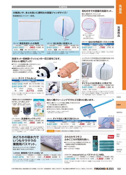 洗面所洗濯用品保健室室洗面所洗面所清掃用品トイレトイレ用品ティッシュッペーパー・ペーパー・タオルタオル飲料・食品キッチンキッチン用品用品事務用品・事務用品・その他他▼※付属の交換用ネットが無くなった場合は台所の排水口用のネットなどをご利用ください。使用前使用後[アーネスト]洗濯槽キレイサッパリお申込番号8-637-2285M価税抜¥934商品種別型式/A-75722税抜価格¥800税込価格単位¥8801袋●使用回数/3〜4回分●材質/弱アルカリ性(過炭酸ナトリウム(69%)、珪酸塩、炭酸塩、クエン酸塩、無水ホウ素、ホタテ焼成カルシウム、たんぱく分解酵素)●付属品/計量スプーン●包装数:1/20おどろきの吸水力でいつもサラサラの業務用バスマット。安心のズレにくいバッキング採用で、自在に敷きつめることができます。[ダイヤ]ダイヤ洗たく槽ゴミ取りネットお申込番号8-637-2391型式/057345在庫無次第終了商品商品種別税抜価格M価税抜¥600¥598取り外し時税込価格¥657単位1個●寸法/139(幅)×15(奥)×386高)mm●質量/46g●材質/本体:ポリプロピレン、ネット:ポリエステル●耐熱温度/約60℃●ネット6枚入●包装数:1/90LOOKP.205排水口用ネットを掲載しております。ふわふわモコモコふみごこちが気持ち良い。●モコリッチにAg+抗菌加工が付きました。洗濯後も持続する抗菌防臭効果。●すべり止め加工。●モールでスピード吸収。[山崎産業]業務用バスマットMUVIお申込番号8-637-2276商品種別型式/F-220-VIM価税抜¥9,800税抜価格¥7,800税込価格¥8,580単位1枚●寸法/600(縦)×900(横)×27厚)mm●質量/1.2kg●材質/パイル:ポリエステル(モール糸)、バッキング:TPE●包装数:1[カキウチ]mocorichiαバスマット(L)MBLお申込番号8-637-2328商品種別型式/4562392724132M価税抜¥2,000税抜価格¥1,800税込価格¥1,980単位1枚●寸法/750縦)×500横)×15厚)mm●質量/543g●材質/ポリエステル100%●包装数:1※表示価格は税込・税抜価格どちらも掲載しております。税抜価格を一番太い赤文字で、税込価格は消費税率10%として表示しております。2021151クマ使用例シングルサイズの布団などの大物の丸洗いから小物のまとめ洗いまで使える洗濯ネット。折りたたみ時[ダイヤ]ダイヤふくらむ洗濯ネット特大70お申込番号M価税抜税抜価格税込価格8-637-2390オープン¥1,260¥1,386単位1個商品種別型式/057235●寸法/140(横)×800(縦)×12(厚)mm(折りたたみ時)、内径:700mm(展開時)●質量/122g●材質/ポリエステル●耐熱温度/約60℃●包装数:1/80洗たく槽クリーニングででたゴミ取りに使います。●洗たく槽クリーニングの後に剥離して浮かぶゴミをしっかり取り除くのに便利です。●水槽のゴミを取るのに便利です。●汚れたらネットを外して取り換えられます。8cm15cm大物洗いや、まとめ洗いに便利な大容量ジャンボサイズ!乾燥機対応ファスナー使用。名札付きで大容量の洗濯ネット。細かい網目のガードメッシュが糸くずや毛糸などの侵入を抑えます。洗濯用品[ダイヤ]角型洗濯ネット大物用[ダイヤ]まとめ洗い洗濯ネット角型丸型ネット中央部に横15cm×縦8cmの名札付き。名前が書き込めます。[ダイヤ]名札付き角型ガードネット大物在庫無次第終了商品お申込番号M価税抜税抜価格税込価格8-637-2223オープン¥962¥1,058単位1個お申込番号M価税抜8-637-2224オープン税抜価格¥890税込価格単位¥9791個お申込番号M価税抜8-637-2437オープン税抜価格¥700税込価格単位¥7701個商品種別角型型式/4901948572191商品種別丸型型式/4901948573563商品種別型式/057050●寸法/600(縦)×600(横)mm●質量/71g●角型洗たくネット●材質/ポリエステル●包装数:1/30●寸法/400(径)mm●質量/45g●丸型洗たくネット●材質/ポリエステル●包装数:1/30●寸法/500(縦)×550(横)mm●質量/73g●材質/ポリエステル●包装数:1/200洗濯ネット・収納袋・クッションの一匹三役をこなす、かわいい便利グッズ!パンダ●デリケートな洗濯物も優しく洗えるクッションメッシュ素材を採用しています。●横幅約65cmのたっぷりサイズの収納袋は、ブランケットや毛布などが入る収納便利グッズです。[ダイヤ]ダイヤごろんねっと在庫無次第終了商品お申込番号8-637-2435パンダ8-637-2436クマ商品種別型式/057389、質量/120g型式/057390、質量/115g単位1個M価税抜¥3,000税抜価格¥2,773税込価格¥3,050●寸法/650(幅)×360(奥)×220(高)mm●材質/ポリエステル●包装数:1/487種類の成分で洗濯槽裏側の汚れをしっかり落とします!※注意事項/槽洗浄コースの無いドラム式洗濯機、二槽式の脱水槽裏には使用不可。