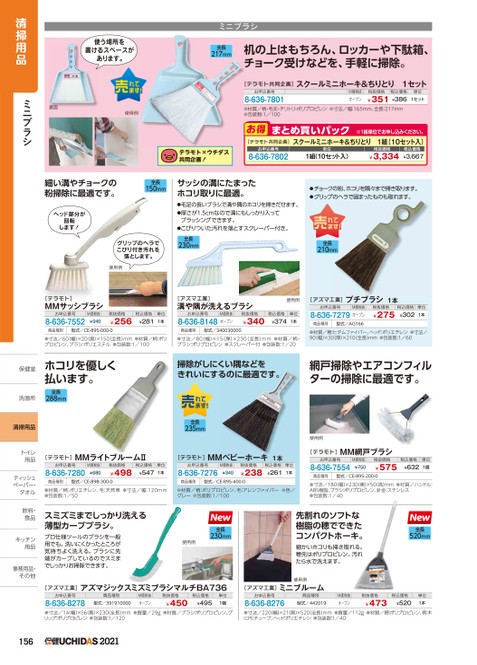 ミニブラシ全長217mm机の上はもちろん、ロッカーや下駄箱、チョーク受けなどを、手軽に掃除。[テラモト共同企画]スクールミニホーキ&ちりとり1セットお申込番号8-636-7801M価税抜オープン税抜価格税込価格¥351¥386単位1セット●材質/柄・毛先・チリトリ:ポリプロピレン●寸法/幅:165mm、全長:217mm●包装数:1/100まとめ買いパックお得※1組単位申込。[テラモト共同企画]スクールミニホーキ&ちりとり1組(10セット入)お申込番号8-636-7802単位1組(10セット入)税抜価格¥3,334税込価格¥3,667テラモト×ウチダス共同企画!使う場所を書けるスペースがあります。裏面使用例清掃用品ミニブラシ細い溝やチョークの粉掃除に最適です。全長150mmサッシの溝にたまったホコリ取りに最適。ヘッド部分が回転します!●毛足の長いブラシで溝や隅のホコリを掃きだせます。●厚さが1.5cmなので溝にもしっかり入ってブラッシングできます。●こびりついた汚れを落とすスクレーパー付き。●チョークの粉、ホコリを隅々まで掃き取ります。●グリップのヘラで固まったものも取れます。全長230mmグリップのヘラでこびり付き汚れを落とします。使用例全長210mm[テラモト]MMサッシブラシお申込番号8-636-7552M価税抜¥340税抜価格¥256税込価格単位¥2811本[アズマ工業]溝や隅が洗えるブラシお申込番号M価税抜8-636-8148オープン税抜価格¥340税込価格単位¥3741本使用例[アズマ工業]プチブラシ1本お申込番号M価税抜8-636-7279オープン税抜価格¥275税込価格単位¥3021本商品種別型式/AG166●材質/穂:ヒタムファイバー、ヘッド:ポリエチレン●寸法/90(幅)×30厚)×210全長)mm●包装数:1/60商品種別型式/CE-895-000-0商品種別型式/340030000●寸法/60(幅)×20(奥)×150(全長)mm●材質/柄:ポリプロピレン、ブラシ:ポリエステル●包装数:1/100●寸法/80(幅)×15(厚)×230(全長)mm●材質/柄・ブラシ:ポリプロピレン●スクレーパー付●包装数:1/20保健室保健室ホコリを優しく払います。洗面所洗面所全長288mm掃除がしにくい隅などをきれいにするのに最適です。網戸掃除やエアコンフィルターの掃除に最適です。清掃用品トイレトイレ用品用品ティッシュテペーパー・ペーパー・タオルタオル飲料・飲料食品食キッチンキッチン用品用品事務用品・事務用品・その他その他全長235mm[テラモト]MMライトブルームⅡお申込番号8-636-7280M価税抜¥680税抜価格¥498税込価格単位¥5471本[テラモト]MMベビーホーキ1本お申込番号8-636-7276M価税抜¥340税抜価格¥238税込価格単位¥2611本商品種別型式/CE-898-300-0商品種別型式/CE-895-400-0●材質/柄:ポリエチレン、毛:天然草●寸法/幅:120mm●包装数:1/50●材質/柄:ポリプロピレン、毛:アレンファイバー●色/グレー●包装数:1/100使用例[テラモト]MM網戸ブラシお申込番号8-636-7554M価税抜¥750税抜価格¥575税込価格単位¥6321個商品種別型式/CE-895-200-0●寸法/180(幅)×230(奥)×50(高)mm●材質/ハンドル:ABS樹脂、ブラシ:ポリプロピレン、針金:ステンレス●包装数:1/40スミズミまでしっかり洗える薄型カーブブラシ。プロ仕様ツールのブラシを一般用でも。洗いにくかったところが気持ちよく洗える。ブラシに先端がカーブしているのでスミまでしっかりお掃除できます。全長230mm使用例先割れのソフトな樹脂の穂でできたコンパクトホーキ。細かいホコリも掃き取れる。穂先はポリプロピレン。汚れたら水で洗えます。全長520mm[アズマ工業]アズマジックスミズミブラシマルチBA736お申込番号8-636-8278商品種別型式/391910000M価税抜オープン税抜価格¥450税込価格¥495単位1個[アズマ工業]ミニブルーム使用例お申込番号8-636-8276商品種別型式/442019M価税抜オープン税抜価格¥473税込価格¥520単位1本●寸法/14幅)×56(奥)×230全長)mm●質量/29g●材質/ブラシ:ポリプロピレン、グリップ:ポリプロピレン●包装数:1/120●寸法/220幅)×21奥)×520全長)mm●質量/112g●材質/穂:ポリプロピレン、柄:木にPEチューブ、ヘッド:ポリエチレン●包装数:1/401562021