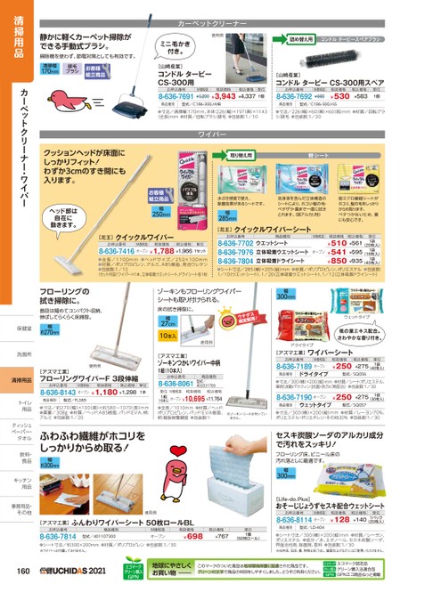 静かに軽くカーペット掃除ができる手動式ブラシ。掃除機を使わず、節電対策としても有効です。清掃幅170mm豚毛ブラシカーペットクリーナー使用例ミニ毛かき付き。[山崎産業]コンドルタービーCS-300用お申込番号8-636-7691M価税抜¥5,200税抜価格税込価格¥3,943¥4,337単位1個詰め替え用コンドルタービースペアブラシ[山崎産業]コンドルタービーCS-300用スペアお申込番号8-636-7692M価税抜¥660税抜価格¥530税込価格単位¥5831個商品種別型式/C186-300J-MB商品種別型式/C186-300J-SS●寸法/清掃幅:170mm、本体:226(幅)×197奥)×1143(全長)mm●材質/回転ブラシ:豚毛●包装数:1/10●寸法/226(幅)×60(奥)×60高)mm●材質/回転ブラシ:豚毛●包装数:1/20ワイパー取り替え用替シートクッションヘッドが床面にしっかりフィット!わずか3cmのすき間にも入ります。ヘッド部は自在に動きます。幅250mm[花王]クイックルワイパーお申込番号M価税抜税抜価格税込価格8-636-7416オープン¥1,788¥1,966単位1セット●全長/1100mm●ヘッドサイズ/250×100mm●材質/ポリプロピレン、アルミ、ABS樹脂、発泡ウレタン●包装数:1/12〈セット内容〉ワイパー×1本、立体吸着ウエットシート、ドライシート各1枚水ぶき感覚で使え、除菌効果があるシートです。幅285mm洗浄液を含んだ立体構造のシートにより、ホコリ・髪の毛・ベタザラ・菌まで一度に拭きとれます。(弱アルカリ性)超ミクロ繊細シートがホコリ、髪の毛をしっかりからめ取ります。ベタつかないため、畳にも安心です。[花王]クイックルワイパーシートお申込番号商品種別8-636-7702ウエットシート8-636-79768-636-7804立体吸着ドライシート立体吸着ウエットシートM価税抜オープン税抜価格税込価格¥510¥561¥541¥595¥850¥935単位1袋1袋1袋(20枚入)(16枚入)(40枚入)●シート寸法/285(横)×205縦)mm●材質/ポリプロピレン、ポリエステル●包装数:1/10(ウエットシート)、1/20立体吸着ウエットシート)、1/12(立体吸着ドライシート)清掃用品カーペットクリーナー・ワイパーフローリングの拭き掃除に。普段は縮めてコンパクト収納、伸ばしてらくらく床掃除。保健室保健室幅約270mmゾーキンもフローリングワイパーシートも取り付けられる。床の拭き掃除に。幅300mm幅27cm10本入使用例[アズマ工業]ゾーキンつかいワイパー中柄1組(10本入)お申込番号8-636-8061商品種別型式/402031700単位1組M価税抜税抜価格税込価格(10本入)オープン¥10,695¥11,764単位1本ウェットタイプ桃の葉エキス配合。さわやかな香り付き。ドライタイプ[アズマ工業]ワイパーシートお申込番号M価税抜8-636-7189オープン税抜価格¥250税込価格¥275単位1袋(40枚入)商品種別ドライタイプ型式/SQ056●寸法/300横)×200縦)mm●材質/シート:ポリエステル、薬剤:流動パラフィン(抗菌・防カビ剤配合)●包装数:1/308-636-7190オープン商品種別ウェットタイプ¥250¥2751袋(30枚入)型式/SQ057※ゾーキン・シートは付いていません。●寸法/300(横)×200(縦)mm●材質/レーヨン70%、ポリエステル・ポリエチレン・その他30%●包装数:1/30使用例[アズマ工業]フローリングワイパーF3段伸縮お申込番号M価税抜税抜価格税込価格8-636-8143オープン¥1,180¥1,298商品種別型式/FL389●寸法/約270(幅)×100(奥)×約580〜1070(長)mm●質量/308g●材質/ヘッド:ABS樹脂、パッド:EVA、柄:アルミ●包装数:1/20●全長/1010mm●材質/ヘッド:ポリプロピレン、パッド:EVA樹脂、柄:樹脂被覆鋼管●包装数:1ふわふわ繊維がホコリをしっかりからめ取る!幅約300mm洗面所洗面所清掃用品トイレトイレ用品用品ティッシュテペーパー・ペーパー・タオルタオル飲料・飲料食品食キッチンキッチン用品用品事務用品・事務用品・その他その他160セスキ炭酸ソーダのアルカリ成分で汚れをスッキリ!フローリング床、ビニール床の汚れ落としに最適です。幅300mm[Life-do.Plus]おそーじじょうずセスキ配合ウェットシートお申込番号M価税抜8-636-8114オープン税抜価格¥128税込価格単位¥1401パック(20枚入)商品種別型式/LD-404●シート寸法/300(横)×200(縦)mm●材質/レーヨン、ポリエステル●成分/水、エタノール、セスキ炭酸ソーダ、界面活性剤、除菌剤、香料●包装数:1/30※白木床、石床、畳、特殊な床(うるし、鏡面仕上げなど)にはご使用いただけません。使用例[アズマ工業]ふんわりワイパーシート50枚ロールBLお申込番号8-636-7814商品種別型式/401107300M価税抜オープン税抜価格¥698税込価格¥767単位1個(50枚ロール)●シート寸法/約300×200mm●材質/ポリプロピレン●包装数:1/30※ワイパーは付属しておりません。2021エコマークグリーン購入GPN地球にやさしくお買い物このマークのついた商品は地球環境保護に配慮された商品です。グリーンの文字で商品の判別をしやすくしました。どうぞご利用ください。エコマークグリーン購入GPNエコマーク認定品グリーン購入法適合品GPNエコ商品ねっと掲載