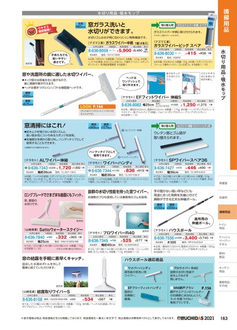 清掃用品水切り用品・吸水モップ保健室室洗面所洗面所清掃用品トイレトイレ用品ティッシュッペーパー・ペーパー・タオルタオル飲料・食品キッチンキッチン用品用品事務用品・事務用品・その他他[山崎産業]結露取りワイパーS使用例お申込番号8-636-8158商品種別型式/GL509-00SX-MBM価税抜¥600税抜価格¥534税込価格¥587単位1個●寸法/213(幅)×45(奥)×345(高)mm●質量/100g●材質/ヘッド:ABS樹脂、ボトル:ポリプロピレン、ブレード:PVC●包装数:1/20■EFフリーフィットハンディ高所のお掃除に最適。P.156■MM網戸ブラシ網戸やエアコンのフィルターのお掃除に水はねしにくく、ネットを傷つけない専用ブラシです。※表示価格は税込・税抜価格どちらも掲載しております。税抜価格を一番太い赤文字で、税込価格は消費税率10%として表示しております。2021163水切り用品・吸水モップ全長980mm窓ガラス洗いと水切りができます。水切りゴムは水が柄に伝わりにくい特殊構造です。[アズマ工業]ガラスワイパー中柄1組(4本入)お申込番号M価税抜税抜価格税込価格8-636-8059オープン¥5,900¥6,490単位1組(4本入)子供たちでも扱いやすい長さです。使用例商品種別型式/521512500●全長/980mm●掃除幅/240mm●質量/343g●材質/ヘッド:ABS樹脂、水切りゴム:合成ゴム、不織布:ナイロン、スポンジ:ポリウレタン、柄:樹脂被覆鋼管●包装数:1窓や洗面所の鏡に適した水切ワイパー。●ネック部分は前後左右に曲がるので、楽に清掃作業が行えます。●ヘッドは傷をつけにくいソフトな樹脂製ヘッドです。ヘッドはワンプッシュで取り外せます。取り替え用ガラスワイパー中柄スペアガラスワイパー中柄に取り付けられます。※スポンジ部はグレーになります。[アズマ工業]ガラスワイパービッグスペアお申込番号M価税抜8-636-8030オープン税抜価格¥415税込価格単位¥4561個商品種別型式/SQ059●拭き幅/約240mm●質量/35g●材質/スポンジ:ウレタンフォーム、不織布:ナイロン、ゴム:合成ゴム●包装数:1/100曲がるネックで水切りラクラク。クロスやぞうきんを挟んで拭き作業に。最短約500mm最長約635mm窓清掃にはこれ!●拭きムラを残さない水切りゴムと、高い吸水性にコシのあるスポンジを採用。●先端部分を柄から取り外し、ハンディタイプとして使用することもできます。※納期がかかる場合があります。[テラモト]ALワイパー伸縮お申込番号M価税抜税抜価格税込価格単位●8-636-7343¥2,200¥1,720¥1,8921本商品種別幅約36cm型式/CL-507-136-0●材質/ヘッド:ABS樹脂、スポンジ:ウレタンスポンジ・ナイロン不織布、ゴム:合成ゴム、柄:アルミパイプ(伸縮)、ジョイント:ポリプロピレン、グリップ:ポリエチレン●包装数:1/20ロングブレードでさまざまな曲面にもフィット。窓、壁面の水切りです。使用例[山崎産業]Sattoウォータースクイジーお申込番号8-636-7840M価税抜¥400商品種別幅25cm税抜価格¥332税込価格単位¥3651個型式/WI610-000X-MB●寸法/250(幅)×46(奥)×230(高)mm●質量/70g●包装数:1/20※先ゴムの取り替えはできません。窓の結露を手軽に素早くキャッチ。回収した水滴はボトルを外して簡単に捨てていただけます。P.166LOOKクロスはマイクロシャインクロスがオススメです。[テラモト]EFフィットワイパー伸縮Sお申込番号商品種別8-636-8082幅25cm型式/CL-731-910-0M価税抜¥1,500税抜価格税込価格¥1,250¥1,375単位1本●全長/最短約500mm、最長約635mm●質量/170g●材質/ヘッド:ポリプロピレン・エラストマー、柄:アルミパイプ(伸縮)、ジョイント:ポリプロピレン、グリップ:ポリエチレン●包装数:1/20最短約949mm最長約1579mm●ALワイパー伸縮取り替え用ALワイパー伸縮・ワイパーハンディ用ウレタン部とゴム部が取り替えられます。ハンディタイプとして使用できます。●ワイパーハンディ[テラモト]ワイパーハンディお申込番号M価税抜●8-636-7344¥1,150税抜価格¥836税込価格単位¥9191個商品種別幅約36cm型式/CL-507-036-0●材質/ヘッド:ABS樹脂、スポンジ:ウレタンスポンジ・ナイロン不織布、ゴム:合成ゴム●包装数:1/20[テラモト]SPワイパースペア36お申込番号8-636-7427M価税抜¥470商品種別幅36cm税抜価格税込価格単位¥446¥490型式/CL-809-636-01本●寸法/360(幅)×43(奥)×22(高)mm●質量/63g●材質/スポンジ:ウレタンスポンジ・ナイロン不織布、水切ゴム:合成ゴム●包装数:1/100抜群の水切り性能を持った窓ワイパー。お掃除のプロも使用している業務用のゴムを採用。手の届かない高い所などにも用途に合った用具を先端に付けて掃除ができる丈夫な伸縮ポール。最短約1050mm最長約3000mm高所用の伸縮ポール。[テラモト]プロワイパーR40使用例お申込番号8-636-7345M価税抜¥700商品種別幅約40cm税抜価格¥525税込価格単位¥5771個型式/CL-509-040-0●寸法/407(幅)×164(奥)×40高)mm●材質/フレーム:ABS樹脂、先ゴム:合成ゴム●質量/115g●包装数:1/20[テラモト]お申込番号ハウスポールM価税抜税抜価格税込価格8-636-7556¥4,400¥3,400¥3,740単位1本商品種別#300型式/HP-516-033-0●全長/最短約1050mm、最長約3000mm●質量/885g●材質/ポール:ステンレス、グリップ:特殊ポリエチレン●包装数:1/10ハウス