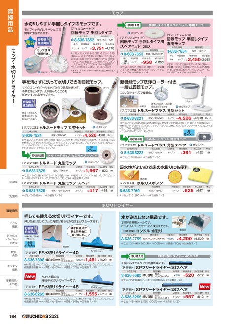 水切りしやすい手回しタイプのモップです。取り替え用手回しタイプ用スペアヘッド・専用モップモップモップヘッドがレバーひとつで簡単に着脱できます。[アイリスオーヤマ]回転モップ手回しタイプお申込番号8-636-7652❶商品種別型式/KMT-420モップ洗浄機能付き。●回転モップ単位M価税抜1セットオープン税抜価格税込価格¥3,791¥4,170●寸法/モップ:約345(径)×925〜1245(高)mm、バケツ:本体420(幅)×300(奥)×280(高)mm●バケツ容量/約7.9L●材質/アルミ、ABS樹脂、ナイロン樹脂、ポリプロピレン、スチール、マイクロファイバー●包装数:1〈セット内容〉バケツ・柄×1、モップヘッド×2※組み立てには+ドライバー(握りが直径30mm以上)が必要です。●スペアヘッド[アイリスオーヤマ]回転モップ手回しタイプ用スペアヘッド2個入お申込番号8-636-7653❷商品種別型式/KMT-K42P単位1袋M価税抜税抜価格税込価格¥958¥1,053(2個入)オープン●寸法/約345(径)×30(高)mm●質量/110g●材質/ポリプロピレン、マイクロファイバー●包装数:1/25[アイリスオーヤマ]回転モップ手回しタイプ専用モップお申込番号8-636-7654商品種別型式/KMT-15単位1本M価税抜オープン税抜価格税込価格¥2,450¥2,695●寸法/約345(径)×925〜1245(高)mm●質量/530g●材質/アルミ、ABS樹脂、ナイロン樹脂、ポリプロピレン、スチール、マイクロファイバー●包装数:1/6手を汚さずに洗って水切りできる回転モップ。マイクロファイバーのモップなので洗剤を使わず、汚れを落とします。入り組んだところも拭きやすい丸型モップです。バケツ新機能モップ洗浄ローラー付き一層式回転モップ。コンパクトサイズで軽量化。柄を上下させると高速回転で洗浄・脱水ができます!使用例[アズマ工業]トルネードモップ丸型セット●丸型モップお申込番号8-636-7824商品種別型式/TSM545M価税抜税抜価格税込価格オープン¥4,526¥4,978単位1セット●寸法/バケツ:320(径)×290(高)mm、丸型モップ:260(径)×1075〜1300(長)mm●材質/バケツ:ポリプロピレン、モップ:ステンレス(柄)、ポリプロピレン(ヘッド)、ポリエステル、ポリプロピレン(モップ糸)●包装数:1/4〈セット内容〉バケツ×1、モップ×1径26cmトルネードモップ丸型モップ・スペア取り替え用[アズマ工業]トルネード丸型モップ❹丸型スペアお申込番号商品種別M価税抜税抜価格税込価格単位8-636-7825●●寸法/260(径)×1075〜1300(長)mm●材質/ステンレス(柄)、ポリプロピレンオープン¥1,667¥1,833型式/TSM5471本(ヘッド)、ポリエステル、ポリプロピレン(モップ糸)●包装数:1/10[アズマ工業]トルネード丸型モップスペア使用例洗浄から脱水への自動切換えが可能です。バケツ角型モップ●[アズマ工業]トルネードプラス角型セットお申込番号商品種別M価税抜税抜価格税込価格単位8-636-8221●●寸法/バケツ:325(径)×205(高)mm、角型モップ:約260(幅)×1100〜1330(長)mm●材質/バケツ:ポリプロピレン、モップ:ステンレス(柄)、ポリプロピレン(ヘッド)、ポリエステル型式/TSM540¥4,526¥4,978オープン1セット(モップ糸)●包装数:1/4〈セット内容〉バケツ×1、モップ×1幅約26cm取り替え用トルネードプラス角型スペア[アズマ工業]トルネードプラス角型スペア●角型スペアお申込番号商品種別8-636-8222●●寸法/260幅)mm●包装数:1/20型式/TSM547M価税抜オープン税抜価格¥391税込価格¥430単位1個吸水性がよいので床の水取りにも便利。使用例[八ツ矢工業]水取りスポンジお申込番号商品種別8-636-7826●●寸法/260(径)mm●包装数:1/20型式/TSM-SQA58M価税抜オープン税抜価格¥417税込価格単位¥4581個お申込番号8-636-7760商品種別型式/15032M価税抜オープン税抜価格¥625税込価格¥687単位1個●寸法/210×280×41mm●包装数:1/8水切りドライヤー水が逆流しない構造です。水切り作業用ツールです。ドライワイパーとセットでご使用ください。[山崎産業]コンドル水取り使用例お申込番号8-636-7759商品種別型式/C244-000X-MBM価税抜¥5,250税抜価格¥4,200税込価格¥4,620単位1個●寸法/310(幅)×300(奥)×160(高)mm●質量/700g●包装数:1/5取り替え用FF水切りドライヤー40スペア工具いらずでスペアの交換が楽です。[テラモト]SPフリードライヤー40スペアお申込番号商品種別8-636-7680MU(青)型式/CL-806-440-3M価税抜¥700税抜価格¥520税込価格単位¥5721本●寸法/約400(幅)×55(奥)×30(厚)mm●包装数:1/20[テラモト]SPフリードライヤー48スペアお申込番号商品種別8-636-8266MU(青)型式/CL-806-448-3M価税抜オープン税抜価格¥557税込価格単位¥6121本●寸法/480(幅)×55(奥)×30(高)mm●包装数:1/20押しても使える水切りドライヤーです。押し引きに応じてゴムの角度が変わるので除水がスムーズです。お客様組立商品※継ぎ柄は再分解できません。全長約1365mm継ぎ目部分が柄と同系色になりました。使用例[テラモト]FF水切りドライヤー40約400mmお申込番号商品種別8-636-7898幅約400mm型式/CL-830-060-3M価税抜税抜価格税込価格¥2,000¥1,481¥1,629単位1本●材質/頭:ポリプロピレン、先ゴム:クロロプレンゴム、柄:スチールパイプにポリエチレン樹脂接着被覆●ヘッド幅/約400mm●質量/578g●包装数:1/10ちょっと幅広の継柄の水切りドライヤーで