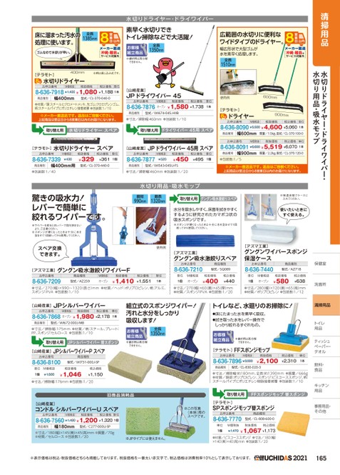 清掃用品水切りドライヤー・ドライワイパー・水切り用品・吸水モップ保健室室洗面所洗面所トイレトイレ用品ティッシュッペーパー・ペーパー・タオルタオル飲料・食品キッチンキッチン用品用品事務用品・事務用品・その他他組立式のスポンジワイパー!汚れと水分をしっかり吸収します!全長1350mmお客様組立商品※継ぎ柄は再分解できません。[山崎産業]JPシルバーワイパーお申込番号M価税抜税抜価格税込価格8-636-7868オープン¥1,980¥2,178単位1本商品種別型式/WI672-000J-MB●寸法/掃除幅:175mm●材質/柄:スチール、プレート:PP、スポンジ:セルロース●包装数:1/10取り替え用JPシルバーワイパー替スポンジ[山崎産業]JPシルバーワイパーPスペアお申込番号8-636-8100商品種別型式/WI731-000J-SP単位M価税抜1個¥1,500税抜価格¥1,046税込価格¥1,150●寸法/掃除幅:176mm●包装数:1/20トイレなど、水廻りのお掃除に!清掃用品●床にたまった水を素早く吸収。●拭き取った水をレバー操作でしっかり絞れるすぐれもの。お客様組立商品※継ぎ柄は再分解できません。[テラモト]FFスポンジモップお申込番号M価税抜8-636-7896¥3,000税抜価格¥2,100税込価格¥2,310単位1本商品種別型式/CL-830-020-3●寸法/掃除幅:約180mm、全長:約1390mm●質量/666g●材質/頭部:ポリプロピレン、スポンジ:ビスコーススポンジ、柄:スチールパイプにポリエチレン樹脂接着被覆●包装数:1/10床に溜まった汚水の処理に使います。全長1385mmゴムなので水切りが早い。水切りドライヤー・ドライワイパー素早く水切りできトイレ掃除などで大活躍!沖縄・離島はサービス対象外全長1350mmお客様組立商品※継ぎ柄は再分解できません。広範囲の水切りに便利なワイドタイプのドライヤー。幅広形状で大型ゴムが水を素早く処理します。沖縄・離島はサービス対象外全長1510mm400mm※柄は差し込み式です。[テラモト]水切りドライヤーお申込番号M価税抜税抜価格税込価格単位8-636-7918¥1,400¥1,080¥1,1881本商品種別幅400mm型式/CL-370-040-0●材質/頭:スチールにクロメートメッキ、先ゴム:クロロプレンゴム、柄:スチールパイプにポリエチレン接着被膜●包装数:1/10※メーカー直送品です。返品はご容赦ください。上記商品は受注日から8営業日以内のお届けになります。[山崎産業]JPドライワイパー45お申込番号8-636-7876M価税抜オープン税抜価格税込価格¥1,580¥1,738商品種別型式/WI674-045J-MB●寸法/掃除幅:460mm●包装数:1/10取り替え用水切りドライヤースペア取り替え用ドライワイパー45用スペア[テラモト]水切りドライヤースペアお申込番号8-636-7339M価税抜¥430商品種別幅400mm用●包装数:1/40税抜価格税込価格単位¥329¥361型式/CL-370-440-01個[山崎産業]JPドライワイパー45用スペアお申込番号8-636-7877M価税抜¥520税抜価格¥450税込価格単位¥4951個商品種別型式/WI543-045U-FS●寸法/掃除幅:460mm●包装数:1/20水切り用品・吸水モップ単位1本使用例600mm[テラモト]ドライヤー900mmお申込番号M価税抜税抜価格税込価格8-636-8090¥5,500¥4,600¥5,060単位1本商品種別幅600mm質量/1.5kg、型式/CL-370-100-0お申込番号M価税抜税抜価格税込価格8-636-8091¥6,600¥5,519¥6,070単位1本商品種別幅900mm質量/2.2kg、型式/CL-370-120-0●包装数:1/5※メーカー直送品です。返品はご容赦ください。上記商品は受注日から8営業日以内のお届けになります。驚きの吸水力!レバーで簡単に絞れるワイパーです。※ワイパーを絞るときレバーで指を挟まないよう、ご注意ください。※スポンジが硬くなったときは十分に水を含ませて1回絞ってから使用してください。最短990mm最長1320mm取り替え用グングン吸水激絞りスペア水分を吸水しやすく、床面を拭きやすくするように研究されたカマボコ状の吸水スポンジです。※スポンジが硬くなったときは十分に水を含ませて1回絞ってから使用してください。※保湿状態でケースに入れてください。使いたいときにすぐ使える。スペア交換できます。使用例[アズマ工業]グングン吸水激絞りワイパーFお申込番号8-636-7209商品種別型式/AZ259M価税抜オープン税抜価格¥1,410税込価格¥1,551単位1本[アズマ工業]グングン吸水激絞りスペアお申込番号8-636-7210商品種別型式/SQ089単位1個M価税抜オープン税抜価格¥400税込価格¥440●寸法/270(幅)×990〜1320(長さ)mm●材質/ヘッド:ポリプロピレン、柄:アルミ、スポンジ:PVA●包装数:1/10●寸法/270(幅)×60(奥)×45(厚)mm●材質/スポンジ:PVA●包装数:1/20[アズマ工業]グングンワイパースポンジ保湿ケースお申込番号8-636-7440商品種別型式/AZ718単位M価税抜税抜価格税込価格1個オープン¥580¥638●寸法/280幅)×120(奥)×65高)mm●材質/ポリプロピレン●包装数:1/12旧商品消耗品取り替え用FFスポンジモップ替スポンジ[山崎産業]コンドルシルバーワイパーUスペアお申込番号M価税抜税抜価格税込価格単位8-636-7560¥1,480¥1,200¥1,3201個商品種別幅180mm型式/C277-000U-SP●寸法/180幅)×145奥)×45高)mm●質量/70g●材質/セルロース●包装数:1/20※この写真(本体)用のスペアです。[テラモト]SPスポンジモップ替スポンジお申込番号8-636-7770商品種別型式/CL-808-600-0単位1個M価税抜税抜価格税込